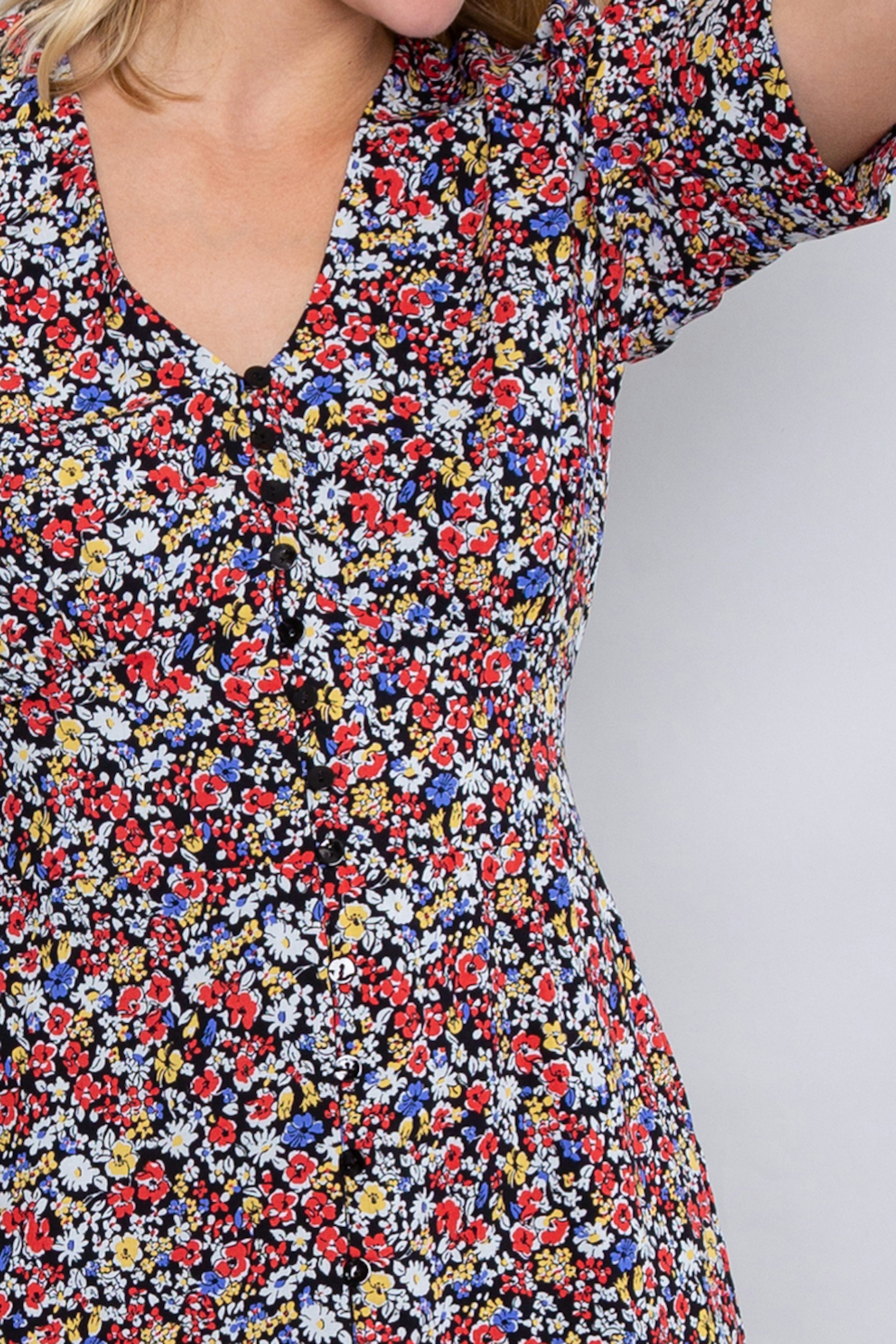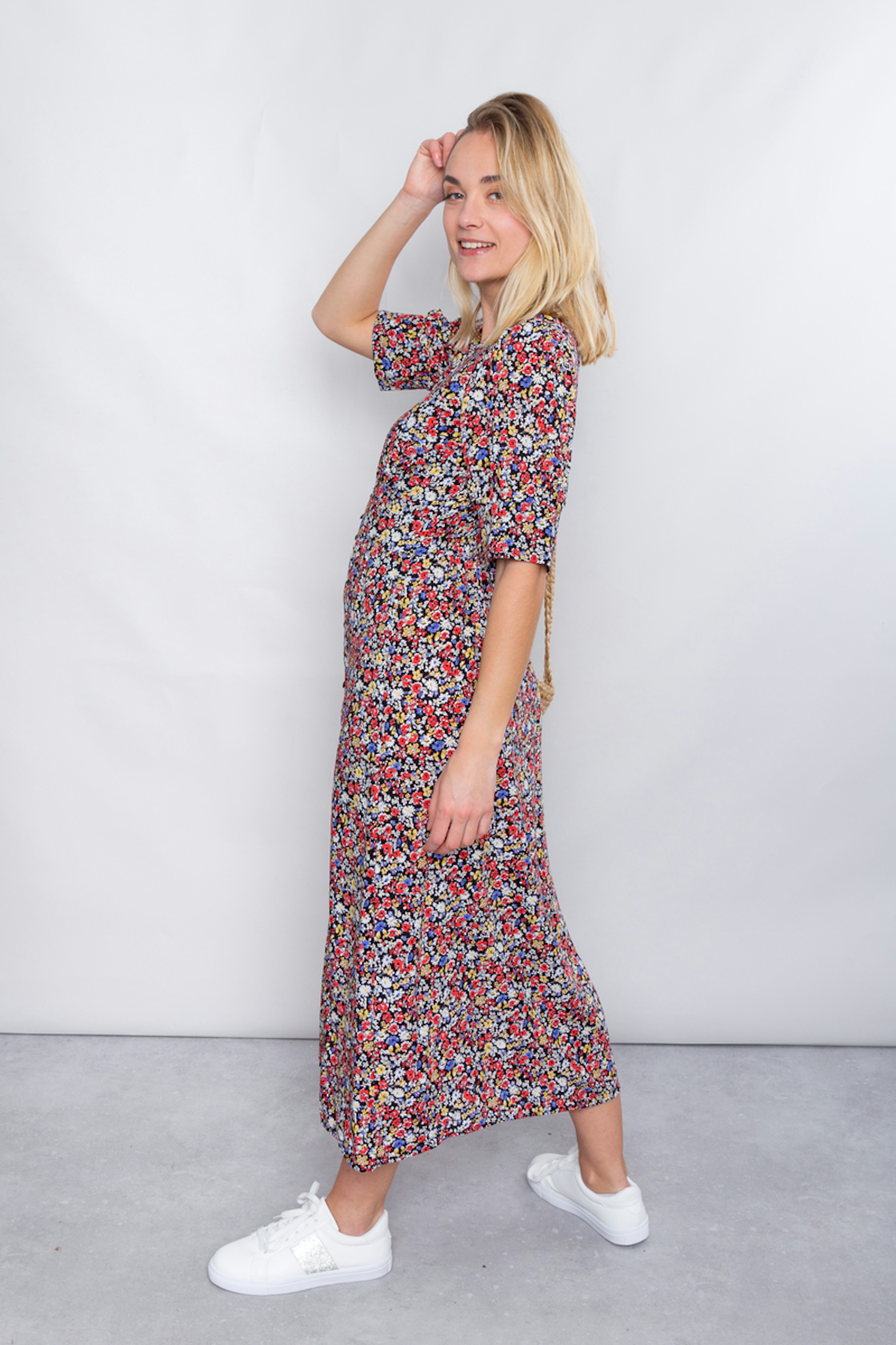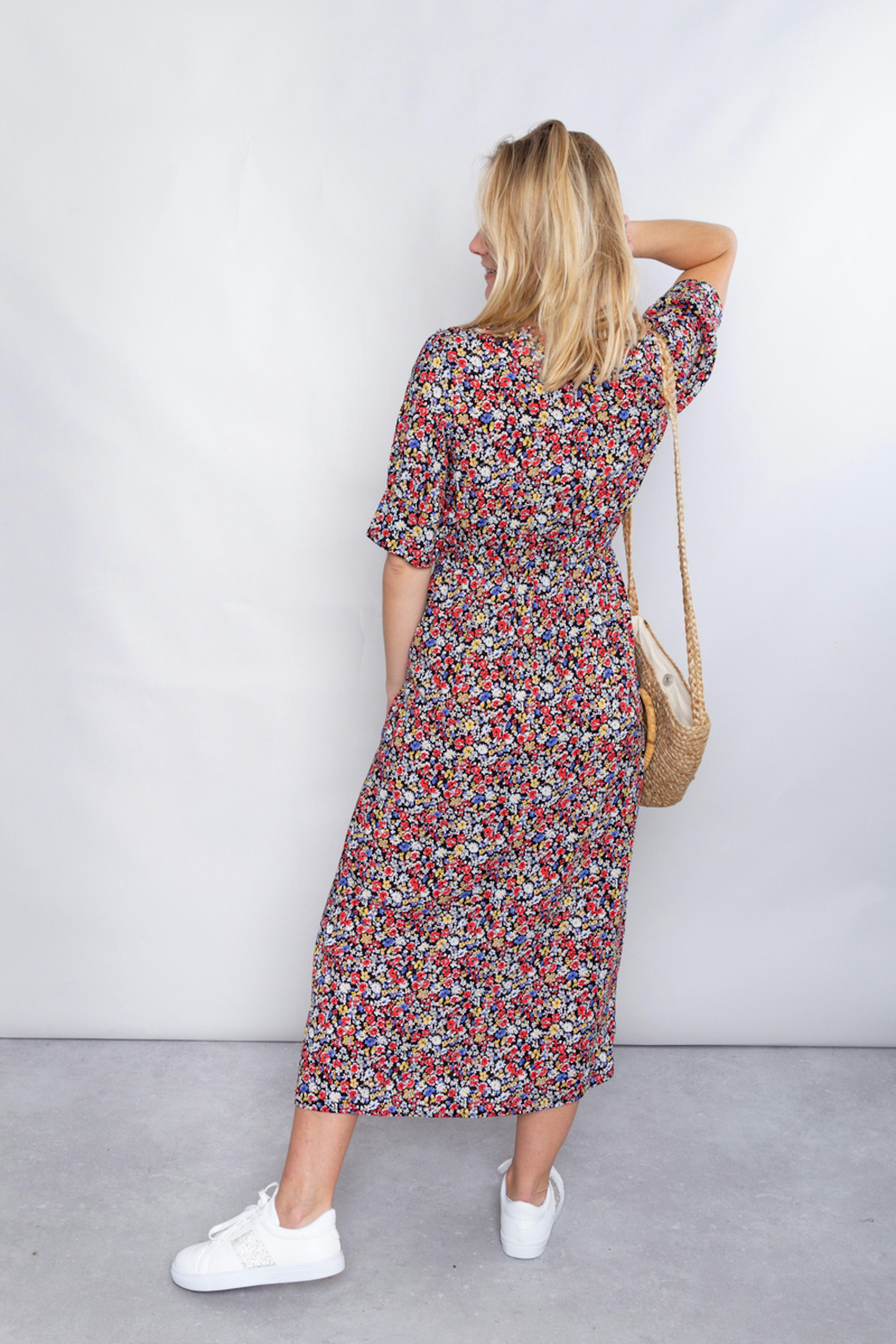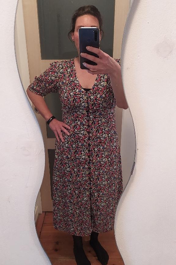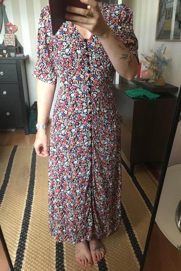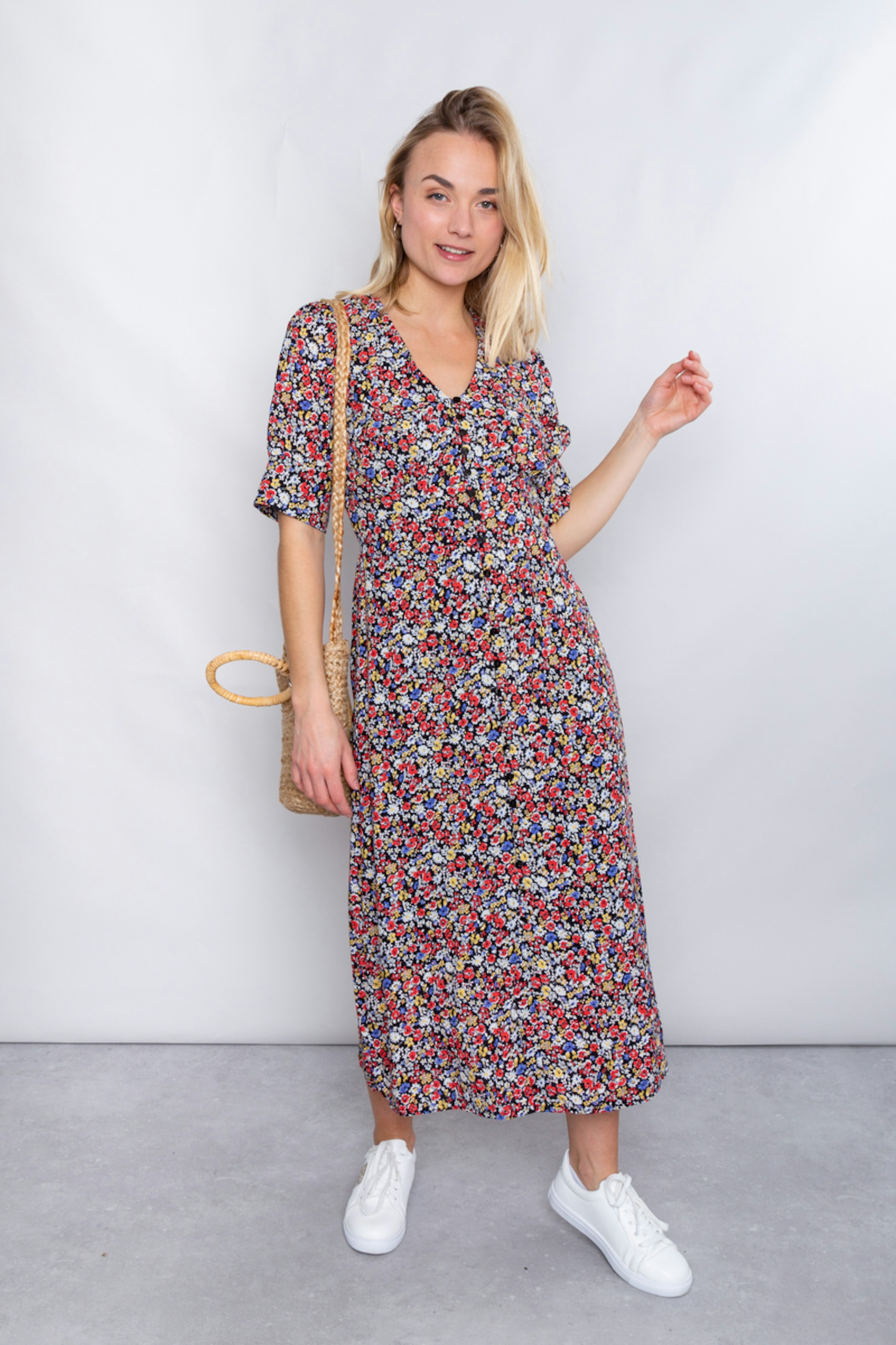 โข Robe longue en viscose โข Imprimรฉ fleuri โข Reserrรฉe ร la taille et boutonnรฉe tout du long โข Manches courtes โข Bas de manche large reserrรฉ