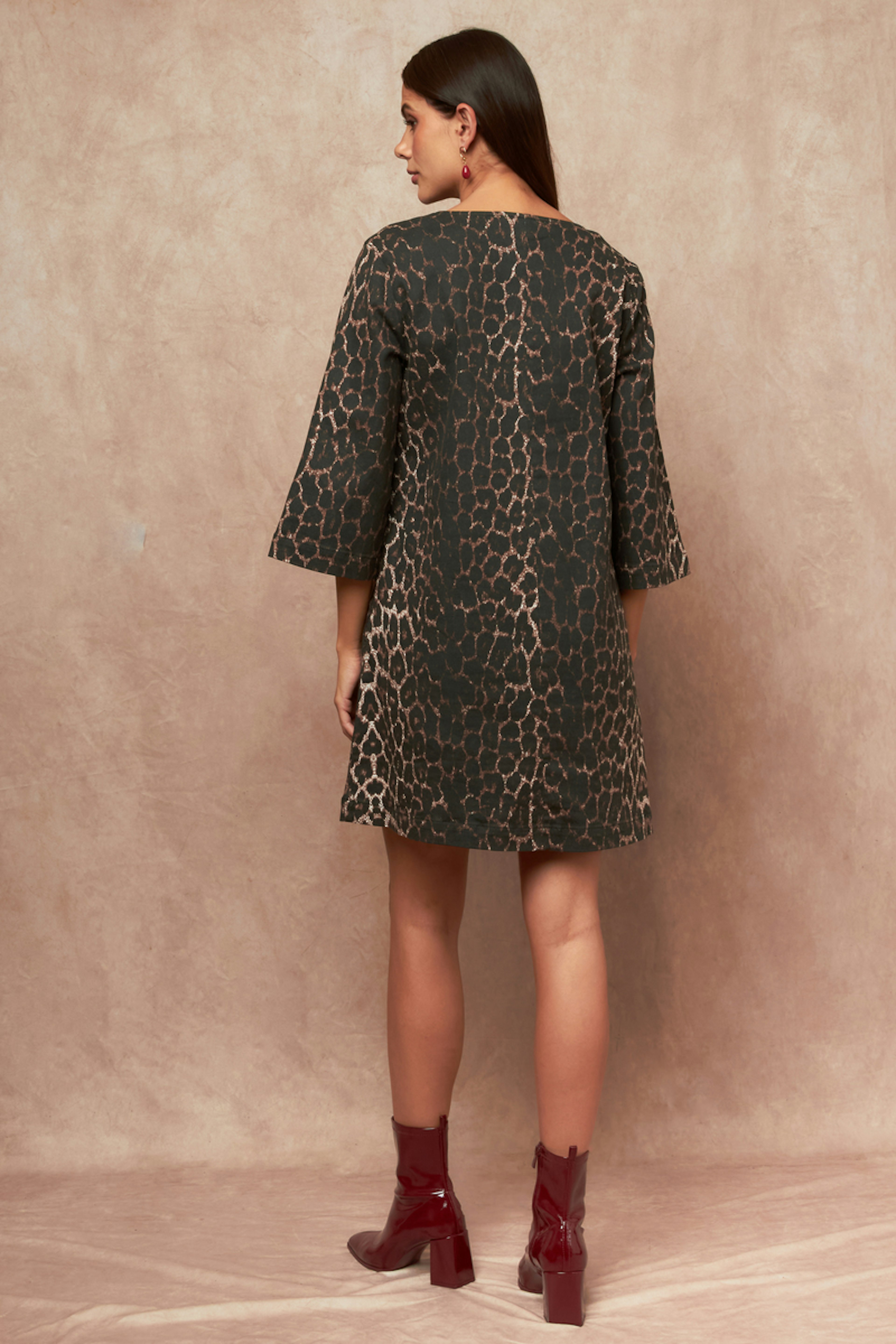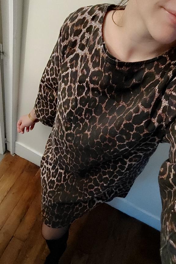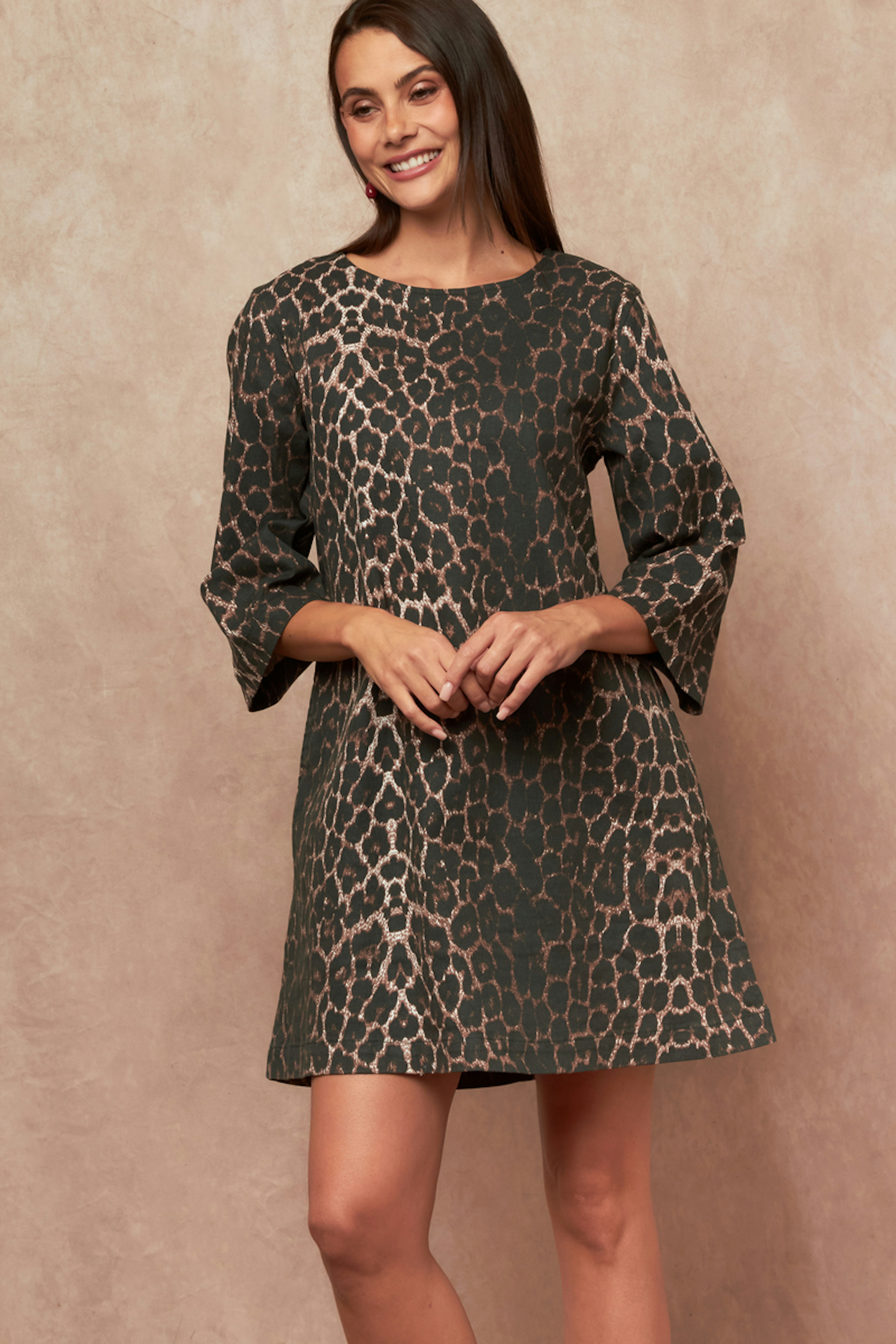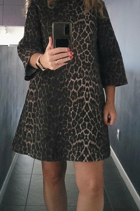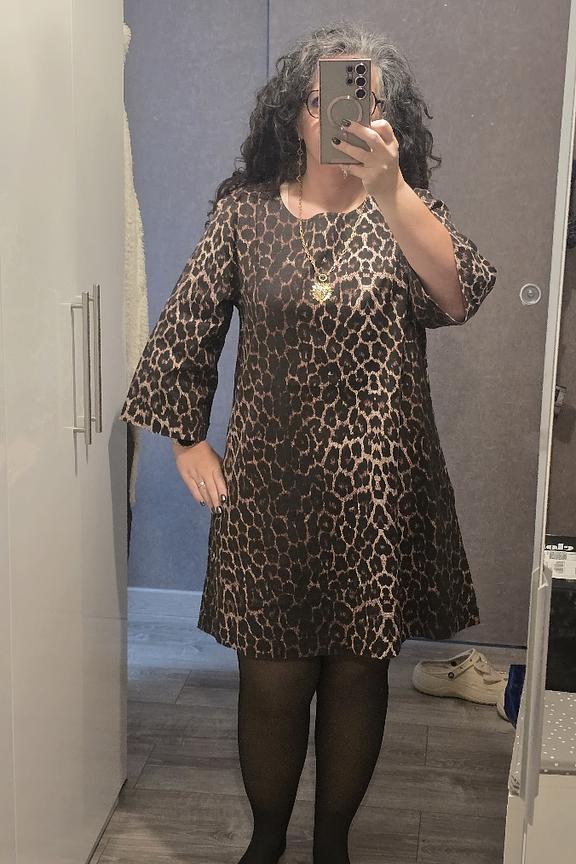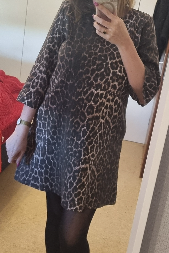 Associez cette robe avec des bottines en cuir et une veste en jean pour un look chic et décontracté, parfait en toute saison. • Robe courte • Imprimé léopard • Manches 3/4 • Coupe droite • Col rond