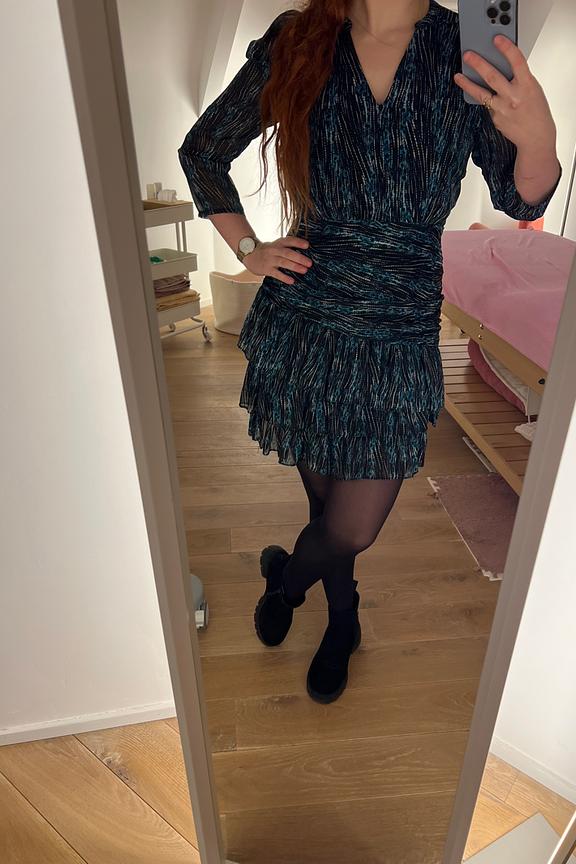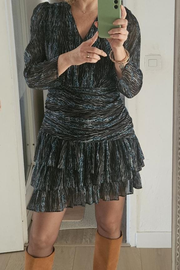 Pour un style chic et intemporel, associez cette fabuleuse robe à des bottines en cuir noir et une pochette élégante pour une touche sophistiquée. Idéale pour les soirées hivernales. • Robe courte taille cintrée • Manches trois-quarts • Décolleté en V • Jupe à volants