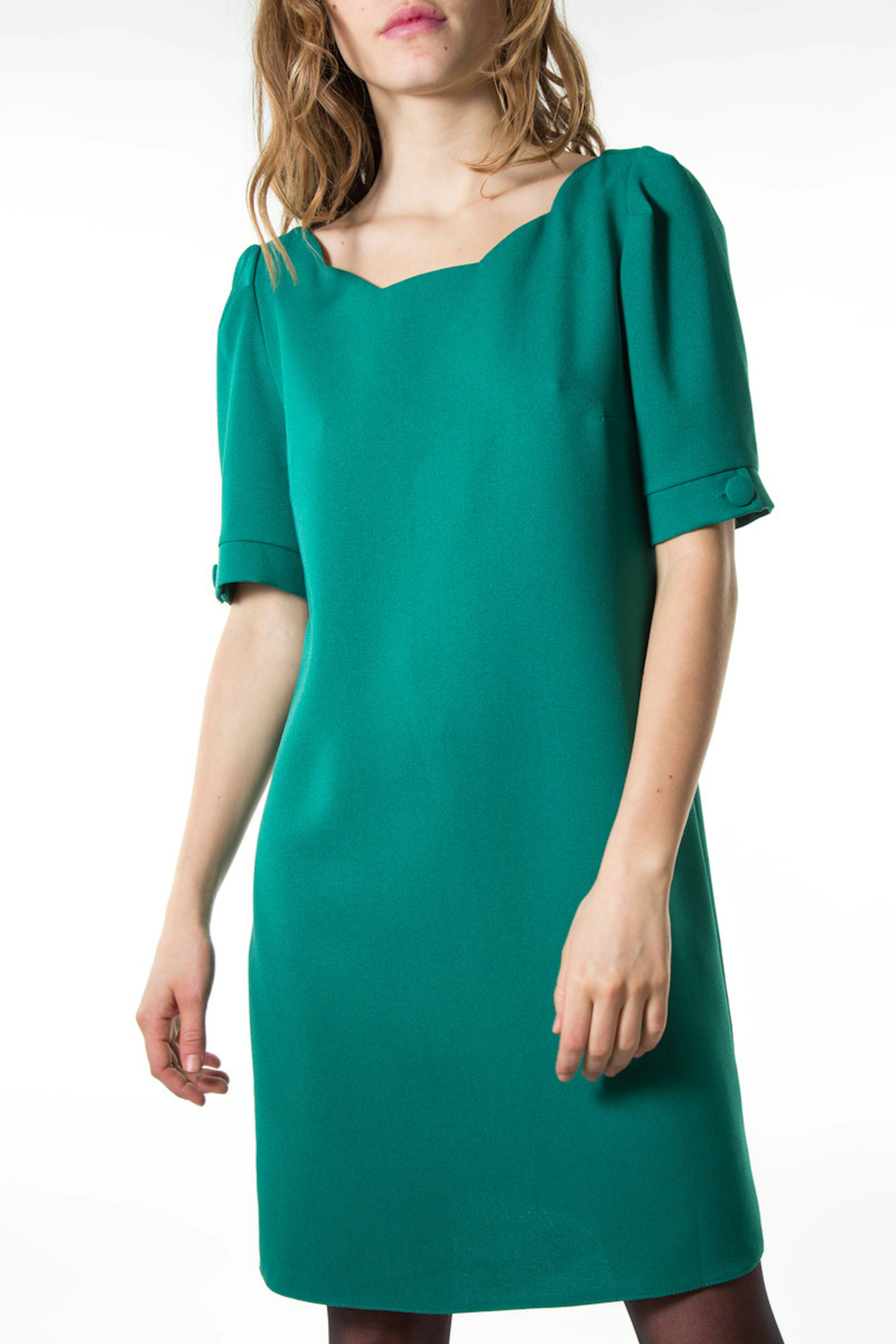 Robe vert รฉmeraude, coupe droite, dรฉcoupe nuage au col