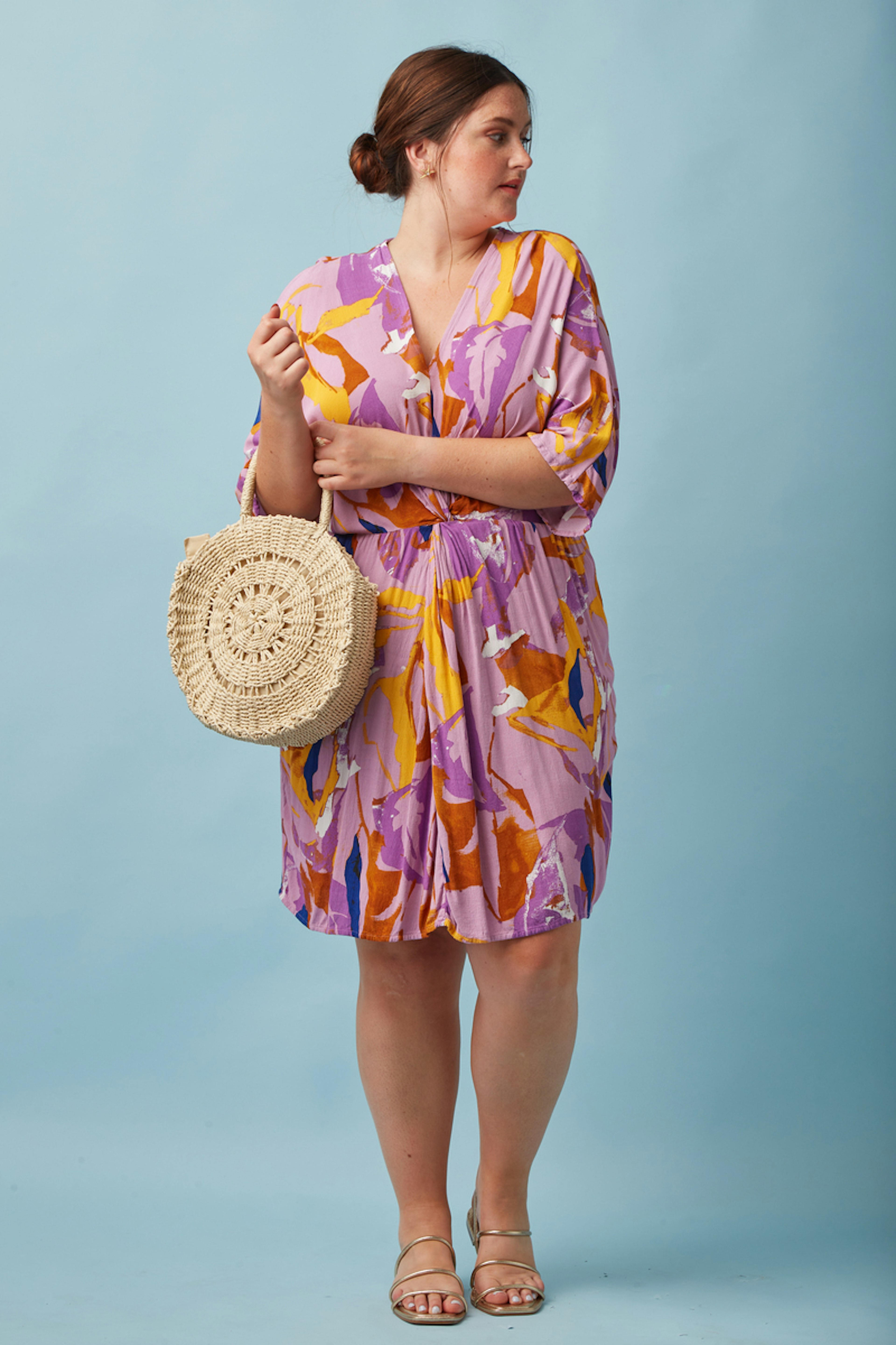 รclairez vos journรฉes estivales avec cette piรจce pleine de charme, idรฉale avec des sandales dorรฉes. Parfait pour toute saison. โข Robe rose ร imprimรฉs abstraits colorรฉs โข Col en V โข Manches 3/4 โข Tissรฉe ร la taille โข Mini longueur attrayante