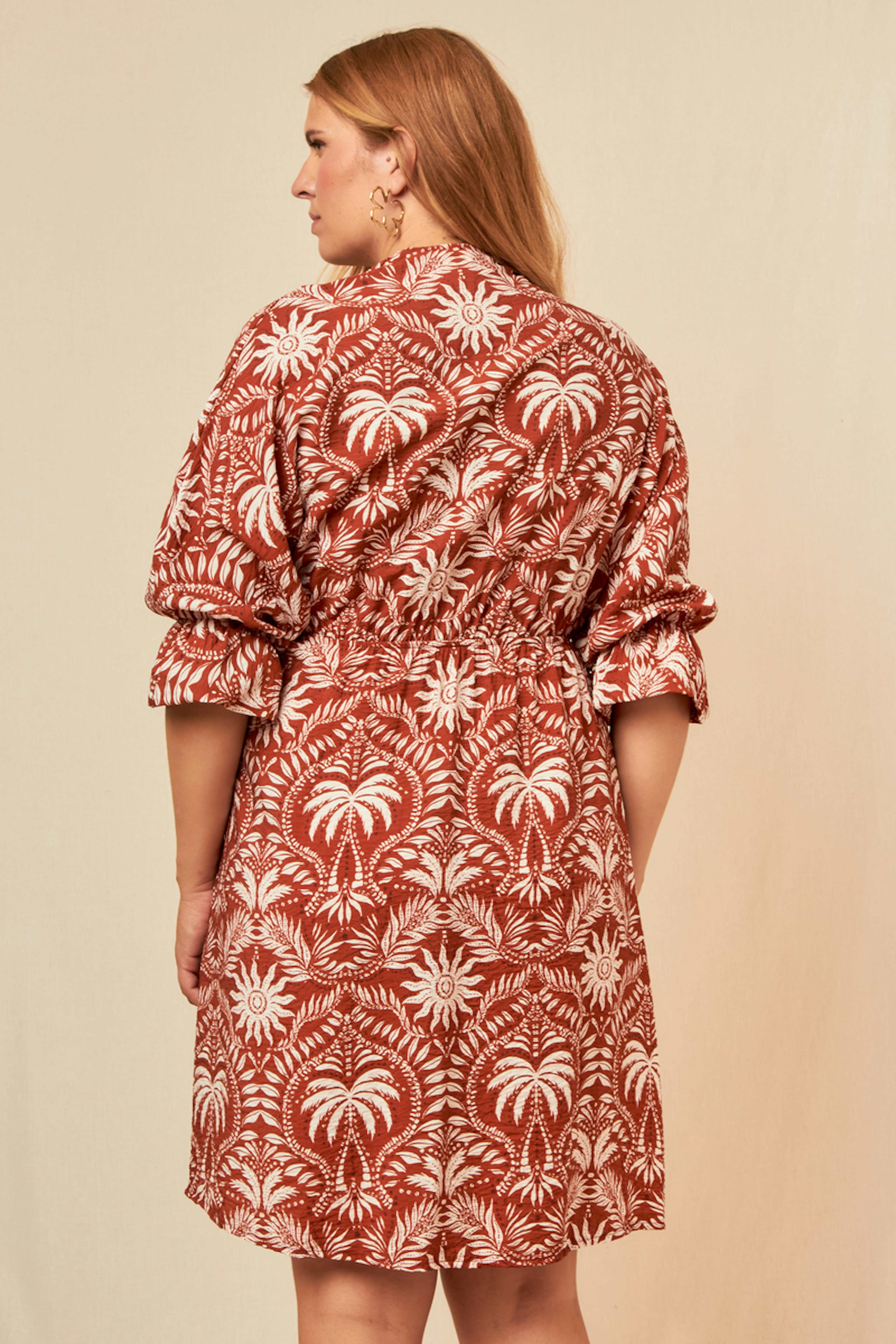 Associez cette robe avec des sandales en cuir et un sac en osier pour une allure estivale décontractée. Idéale pour les journées ensoleillées. • Robe portefeuille • Manches trois-quarts • Impression à motif végétal • Longueur au-dessus du genou • Ceinture à nouer à la taille