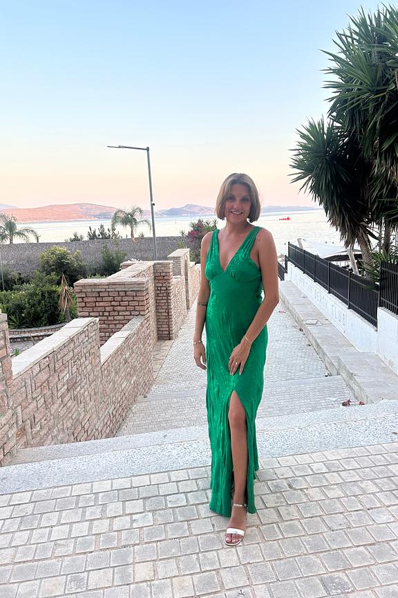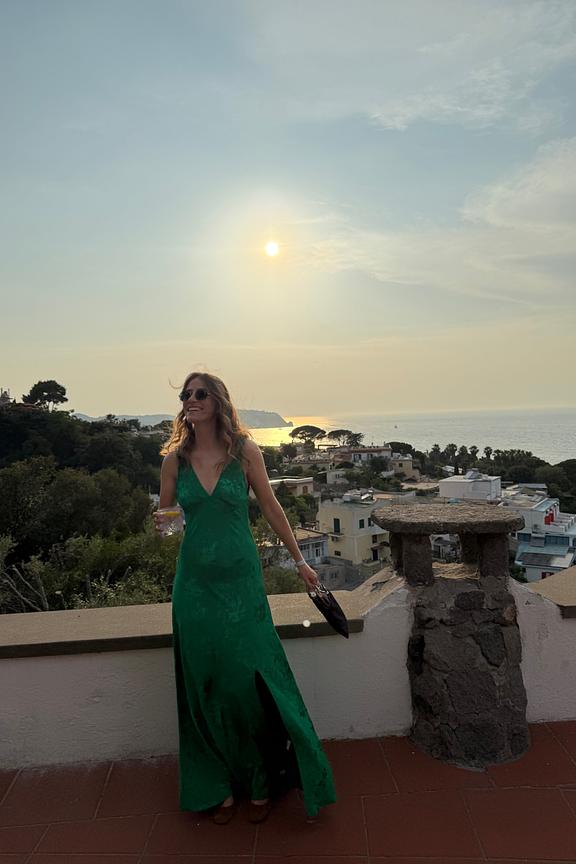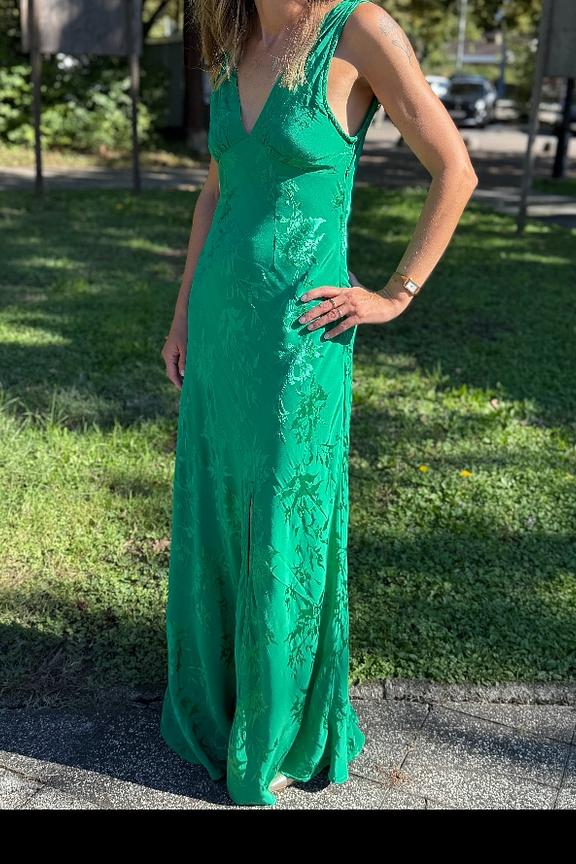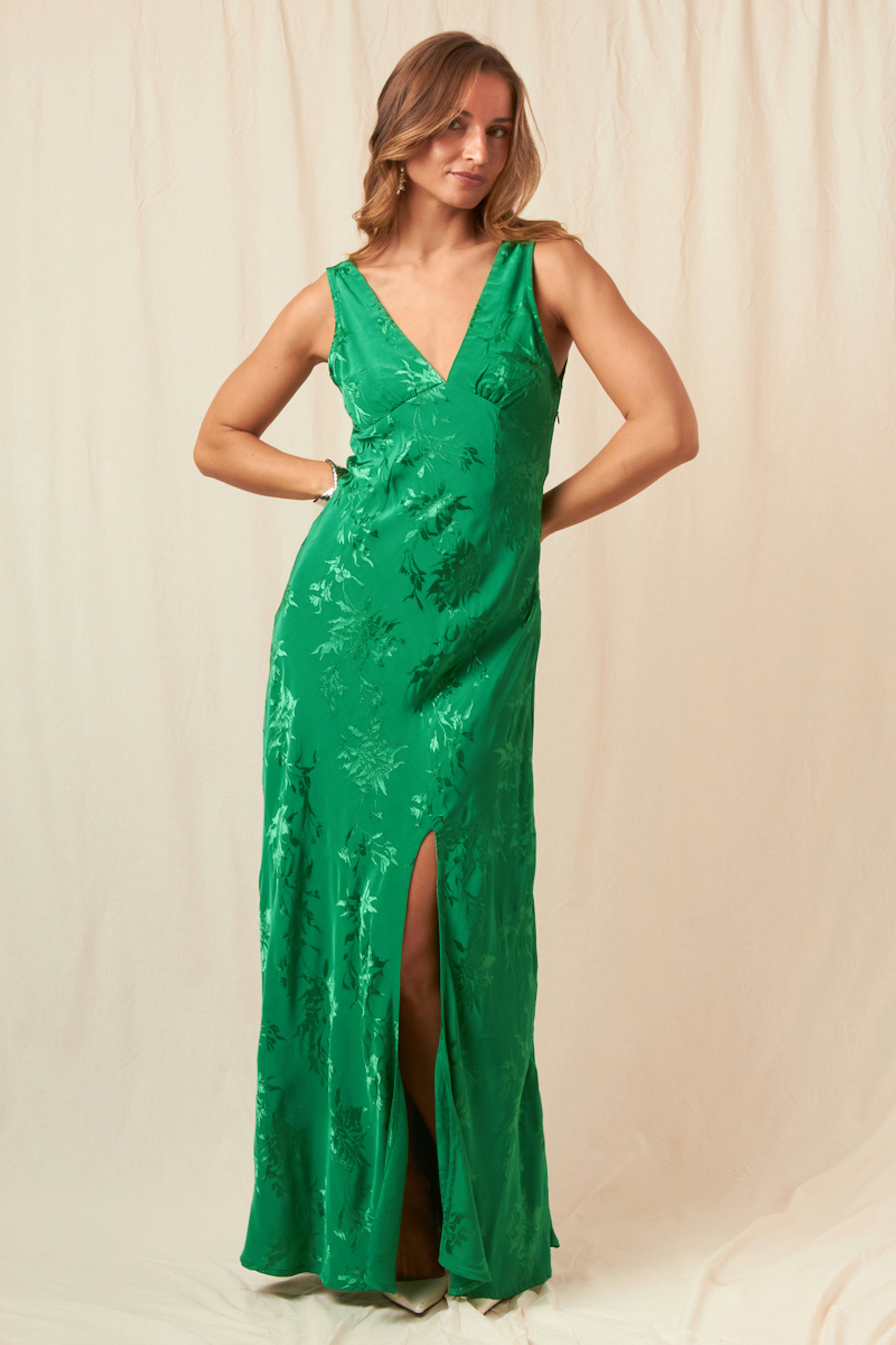 Ajoutez une paire de sandales dorées et des boucles d'oreilles pendantes pour une allure estivale éclatante. Parfaite pour les soirées d'été chic. • Robe longue imprimée • Décolleté en V plongeant • Fente sur le côté • Sans manches • Imprimé floral