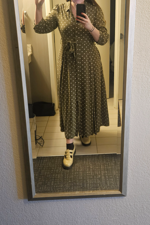 Pour une allure chic et décontractée, ajoutez des sandales à talons et quelques accessoires dorés. • Robe à manches longues • Coupe ceinturée à la taille • Col chemise classique • Longueur maxi flatteuse • Motif à pois élégant