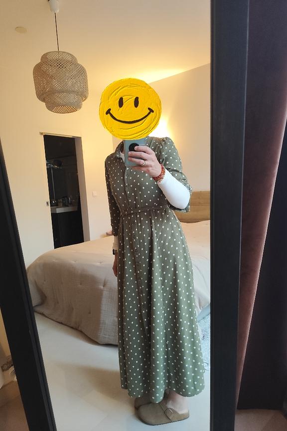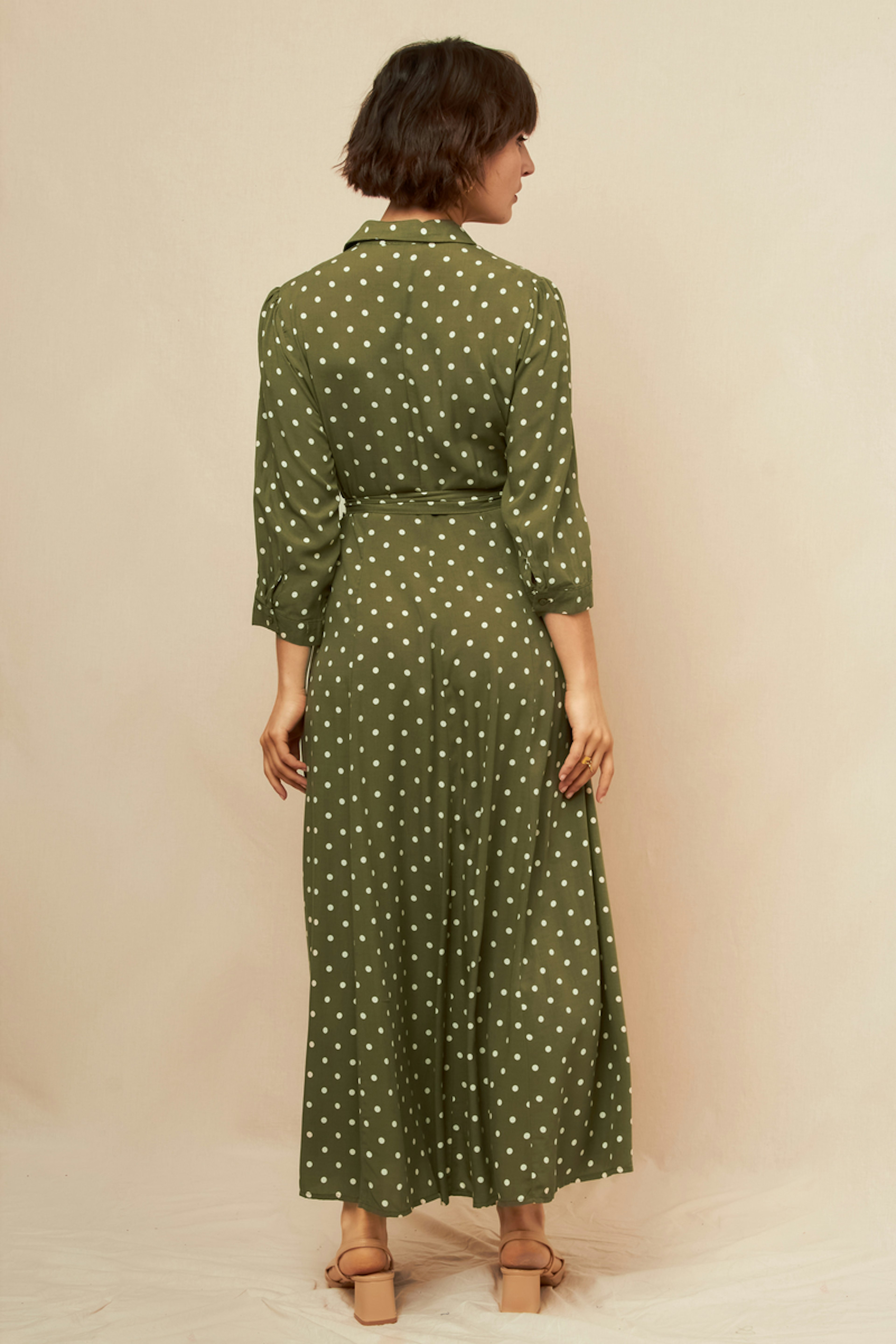 Pour une allure chic et décontractée, ajoutez des sandales à talons et quelques accessoires dorés. • Robe à manches longues • Coupe ceinturée à la taille • Col chemise classique • Longueur maxi flatteuse • Motif à pois élégant