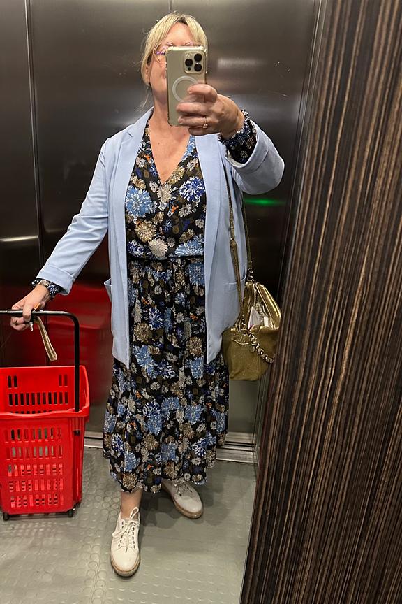 โข Robe midi ร imprimรฉs fleuris bleus โข Encolure en V โข Manches longues โข Manchettes resserrรฉes โข Tissu fluide avec doublure noire