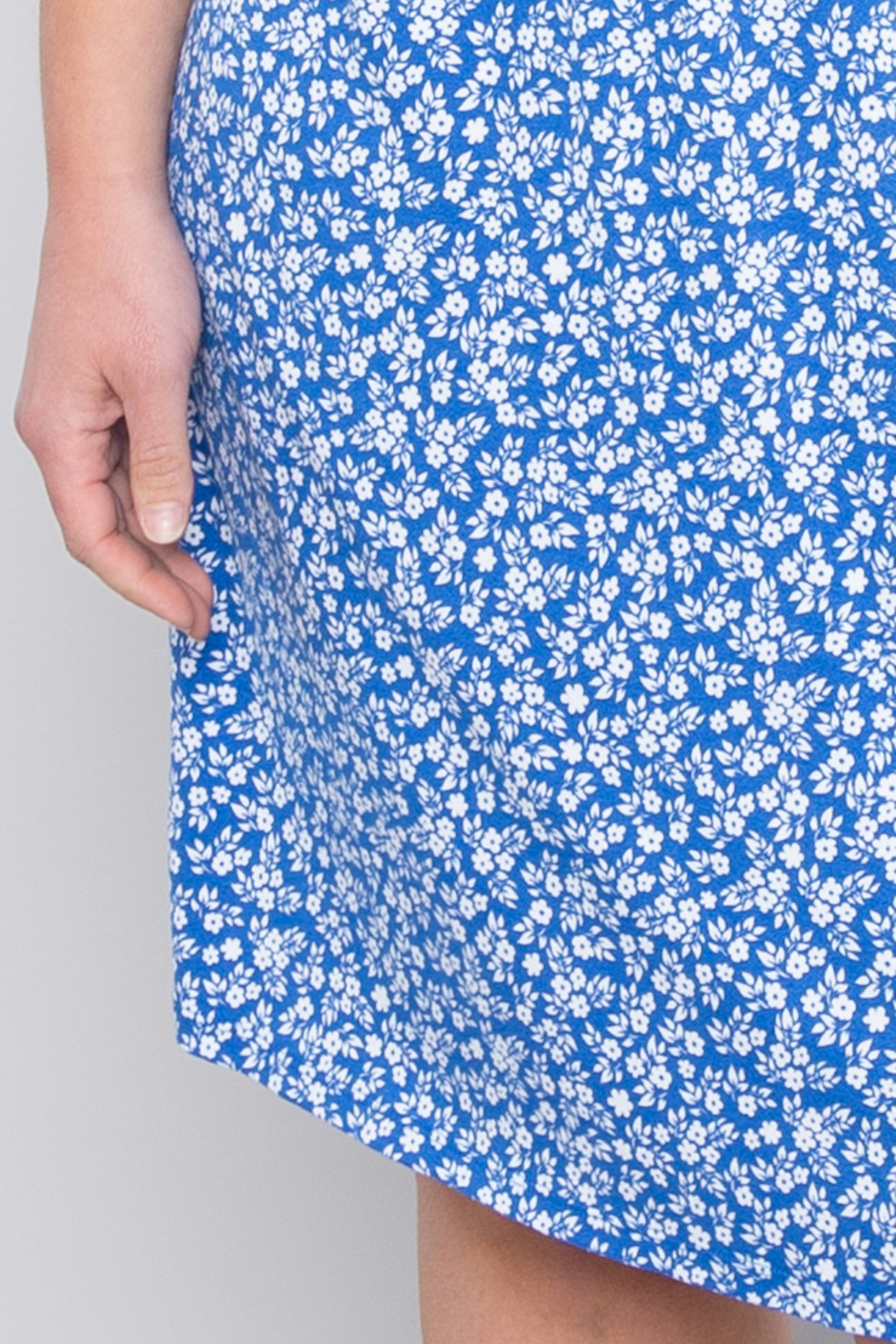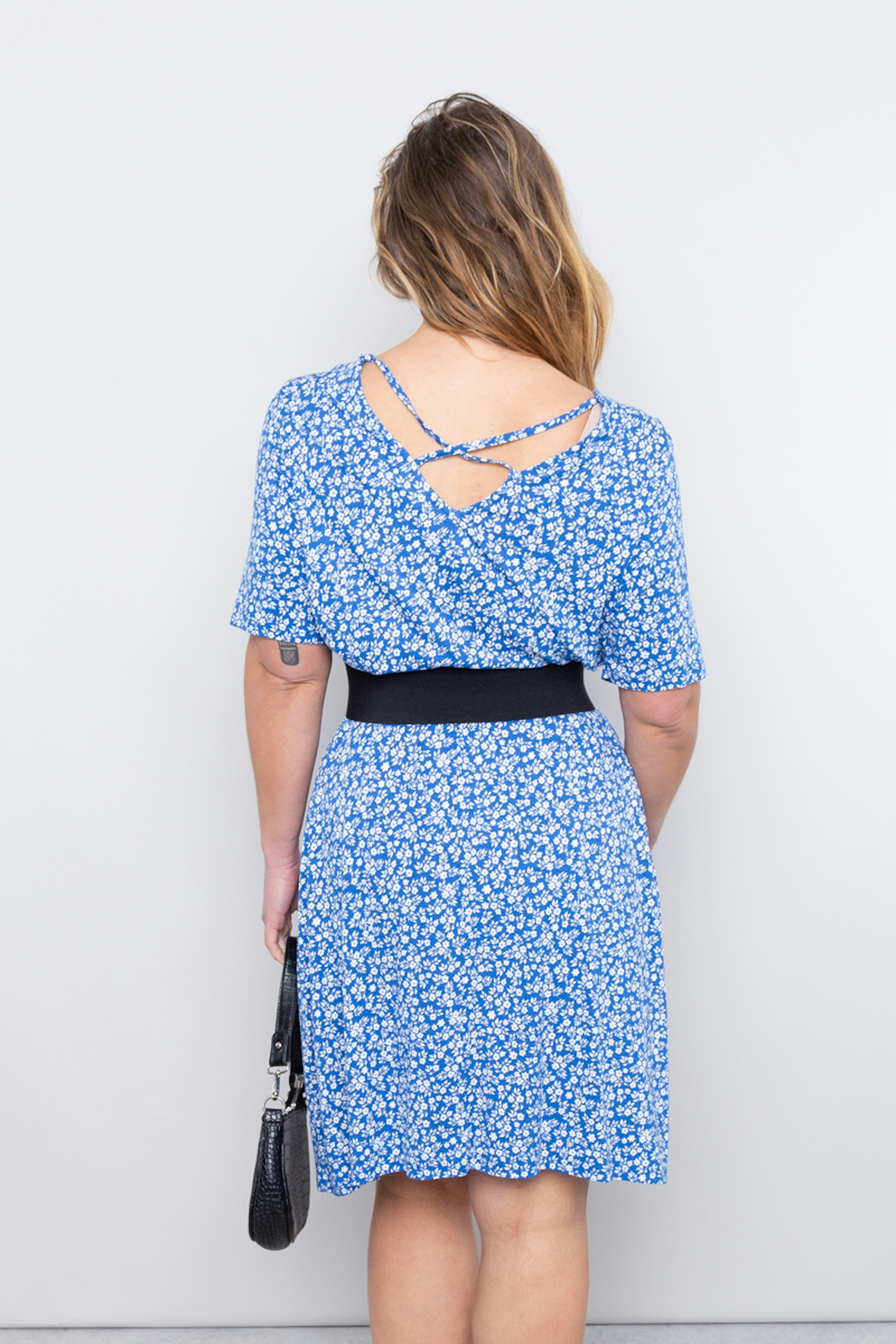 โข Robe bleue ร imprimรฉ fleuri blanc โข Col rond โข Manches courtes โข Coupe droite โข Dรฉcoupe รฉlรฉgante dans le haut du dos โข Longueur mi-cuisse