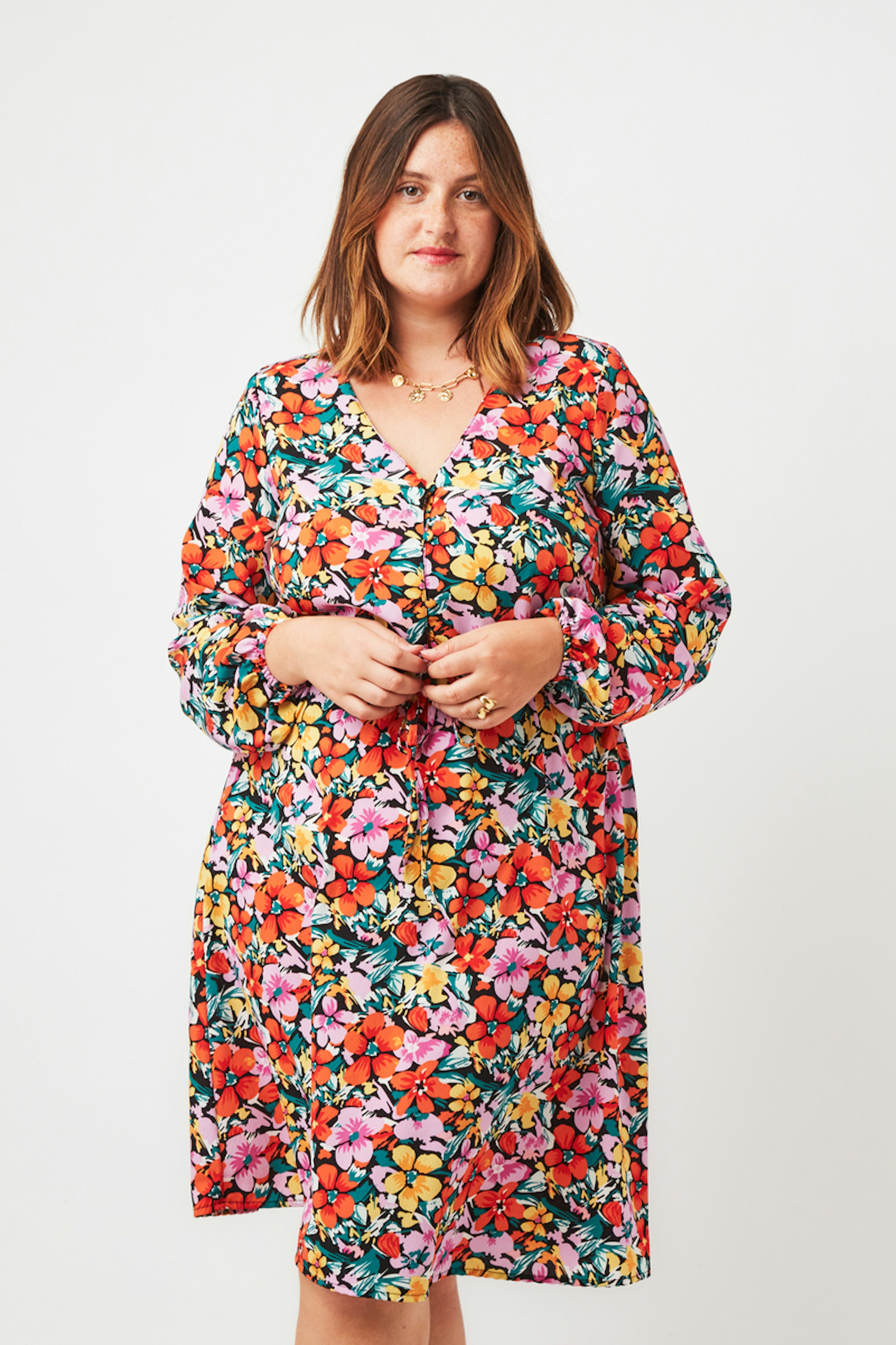 โข Robe courte ร motifs fleuris multi couleurs โข Manches longues resserrรฉes aux poignets โข Encolure en V plongeant avec patte de boutonnage โข Coupe droite lรฉgรจrement รฉvasรฉe