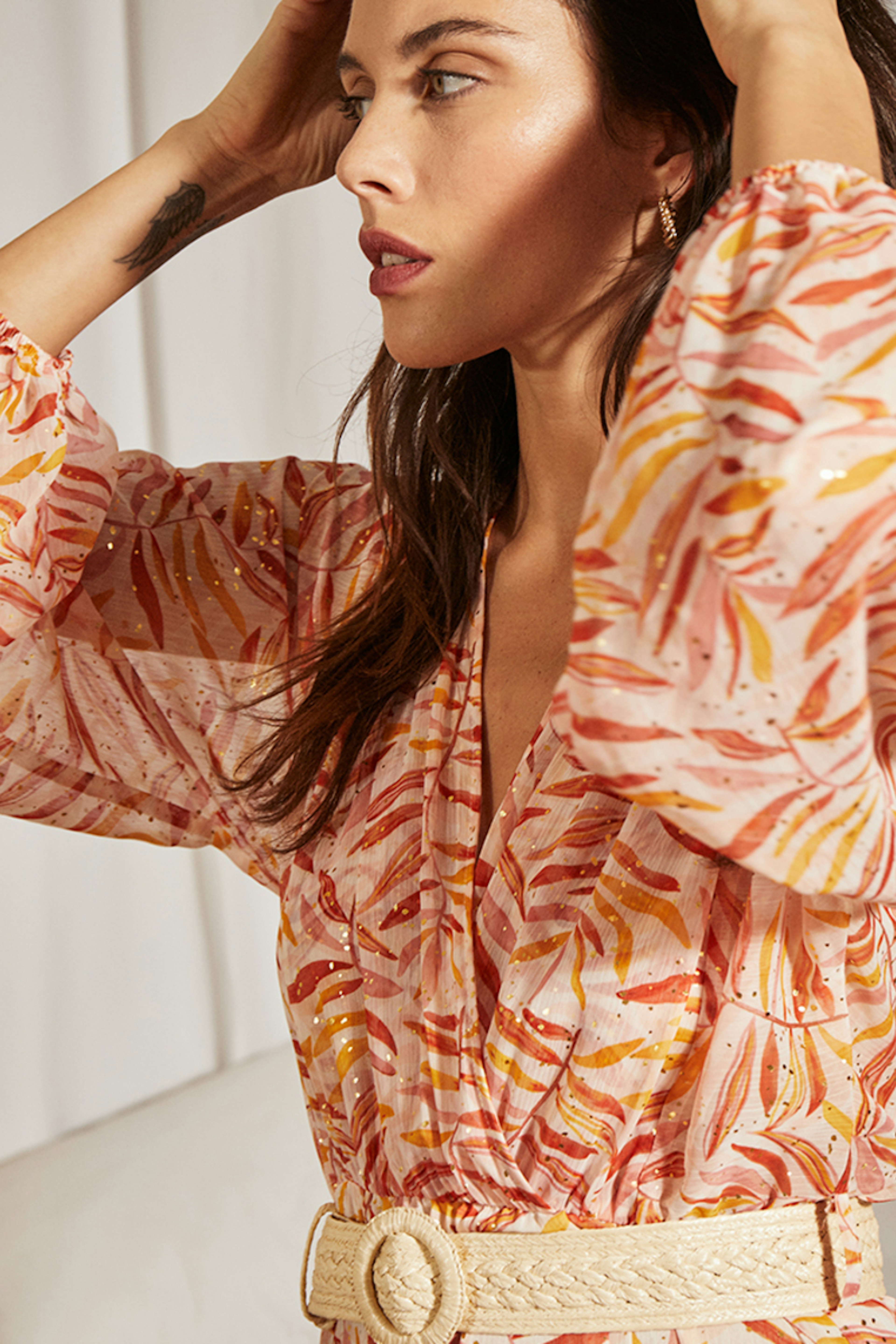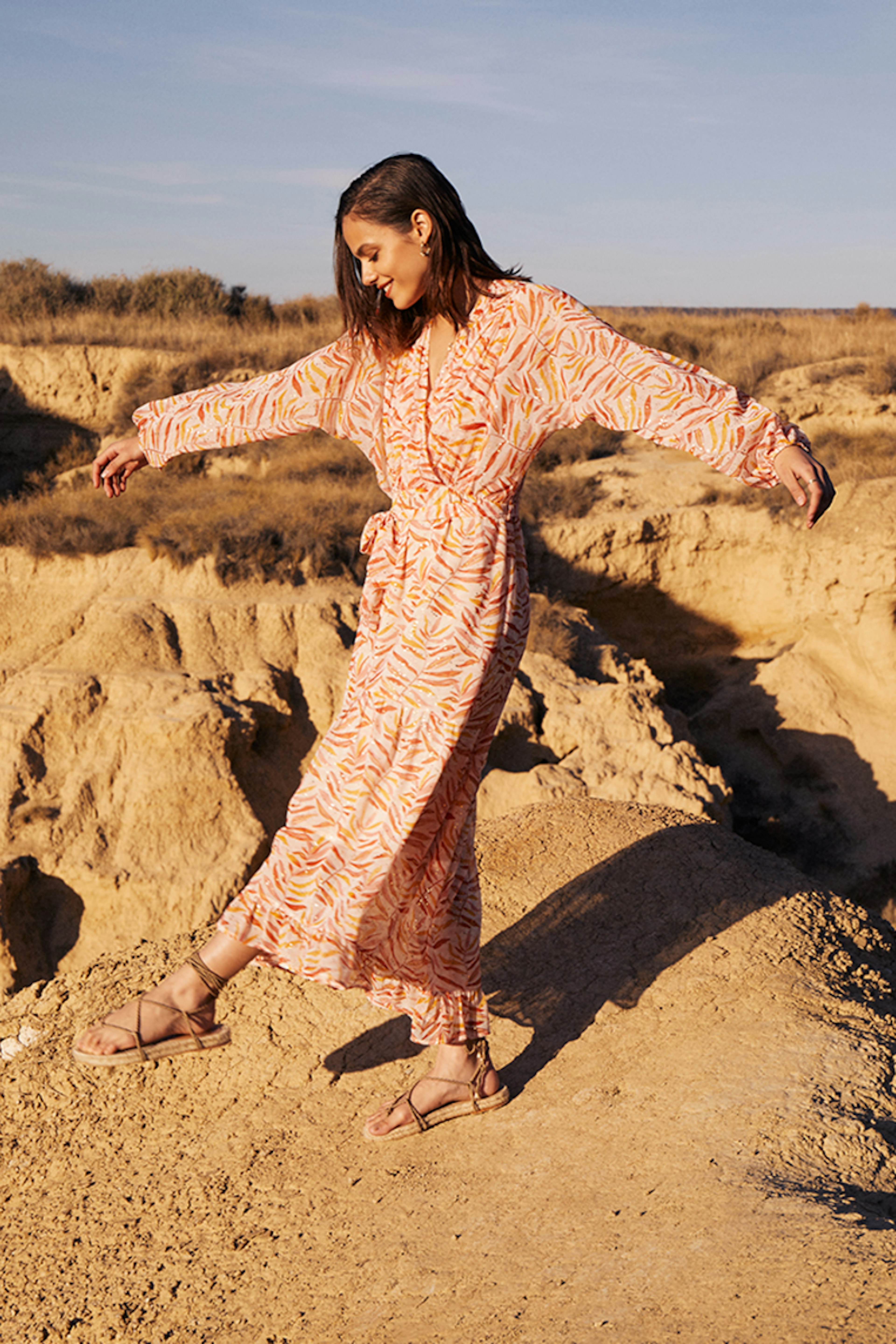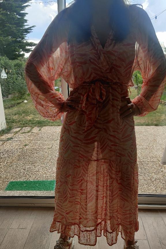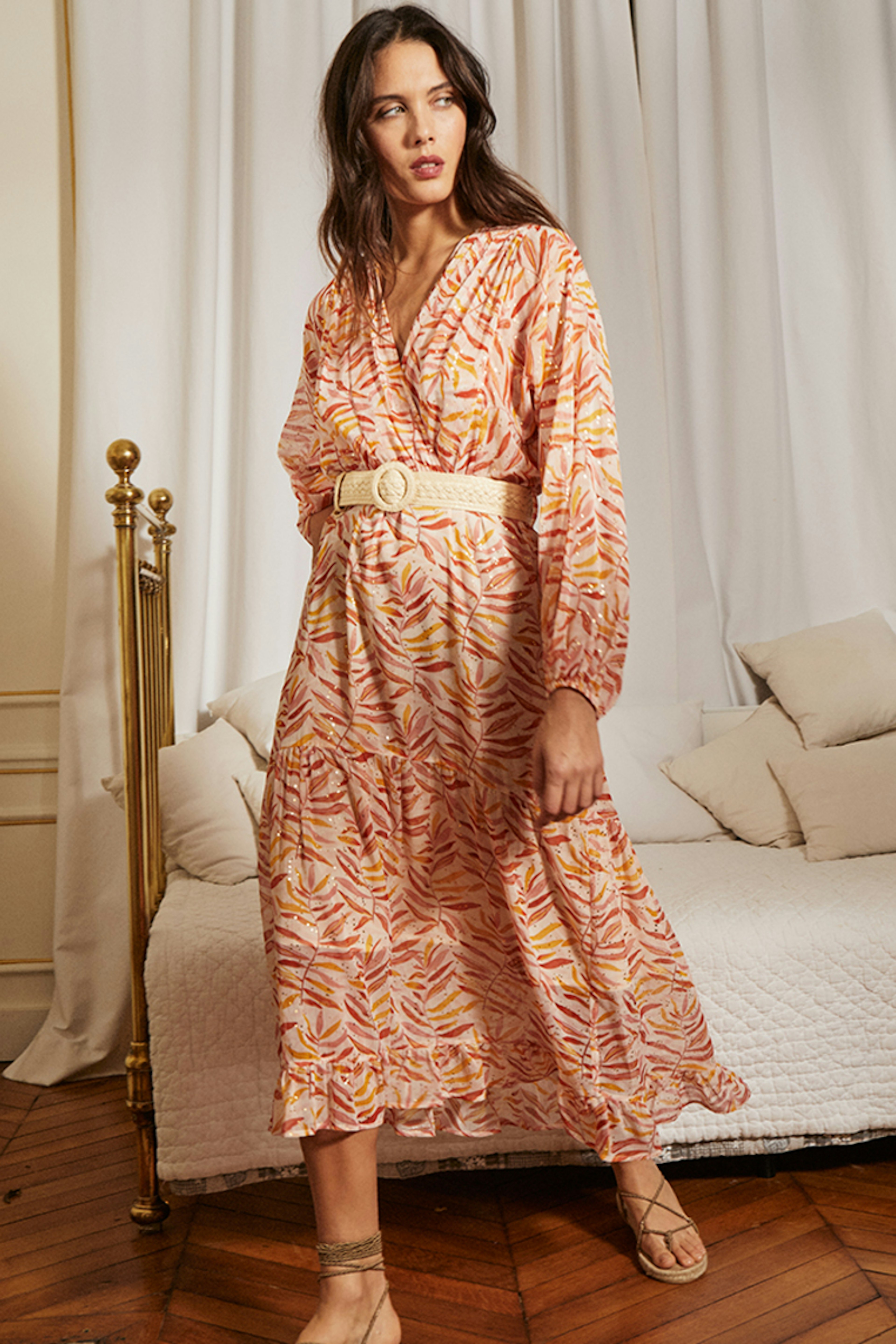 Coup de coeur pour cette robe longue bohรจme et vaporeuse. โข Robe longue imprimรฉe rose โข Taille รฉlastiquรฉe avec ceinture ร nouer โข Manches longues โข Doublure : 100% polyester