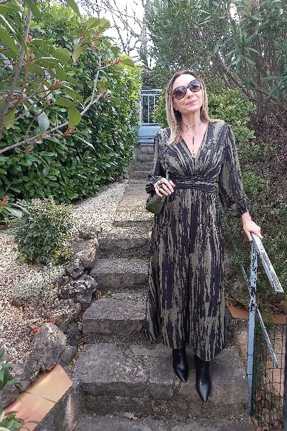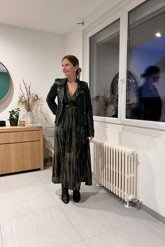 โข Robe longue cache-cลur imprimรฉ kaki et noire โข Manches longues โข Elastique ร la taille โข Encolure en V โข Lรฉgรจre fente sur le cรดtรฉ bas gauche