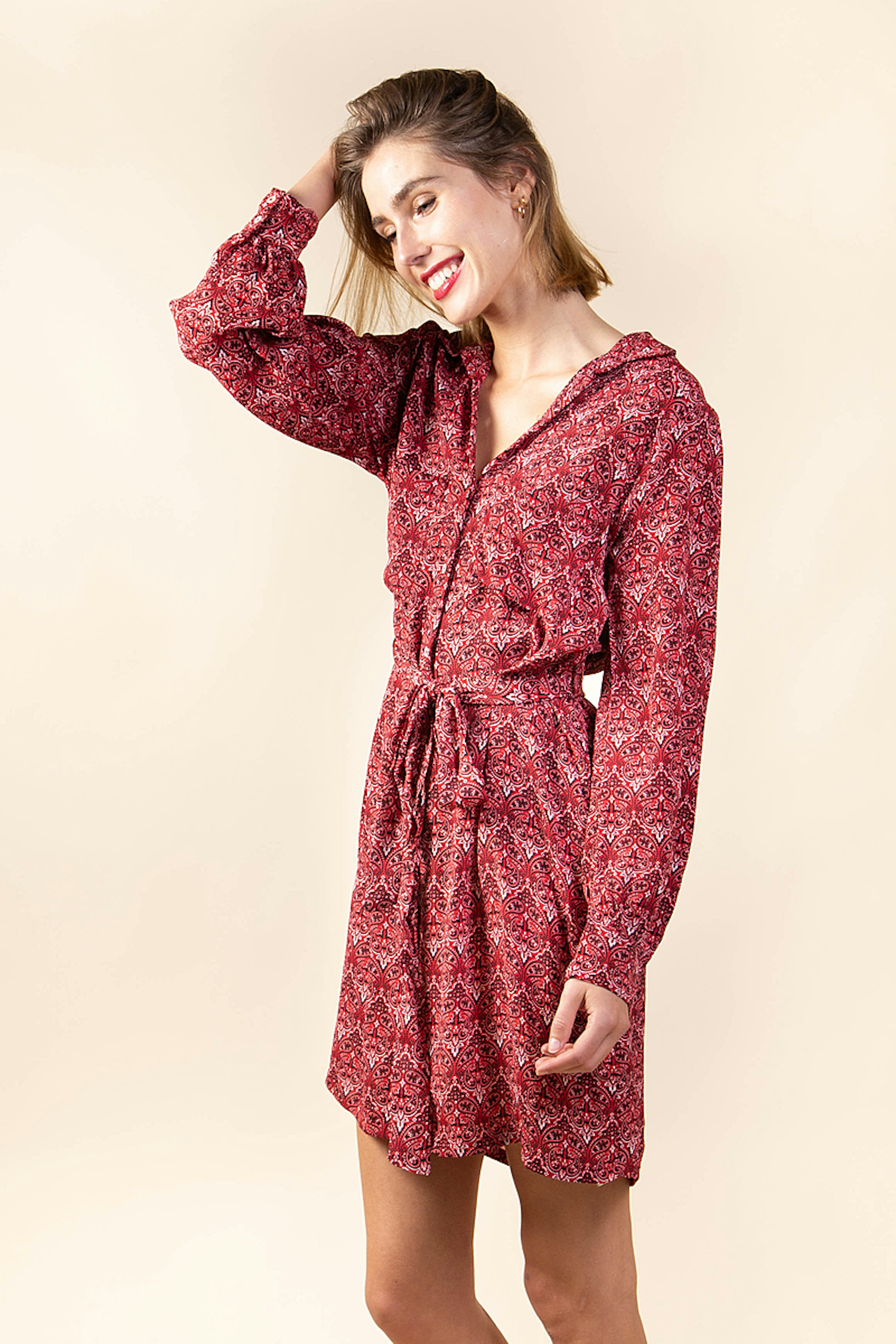 Craquez pour l'รฉlรฉgante robe chemise Celine. Avec son tissu fluide imprimรฉ bandana rouge, elle se portera facilement au quotidien. On aime les dรฉtails de ses boutons nacre et coco qui sont la marque de fabrique de Bizance. On vous conseille de la porter avec des bottes hautes camel.