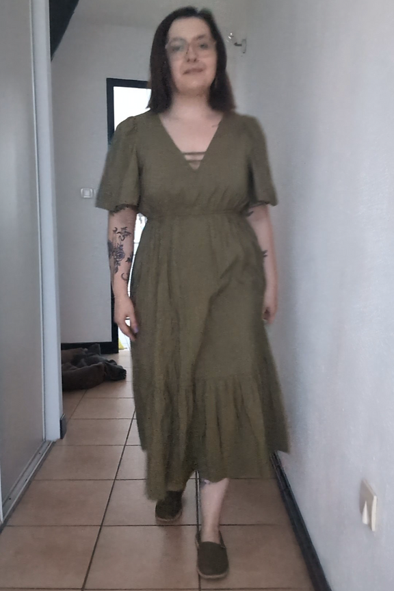 Pour une allure chic et décontractée, associez cette robe kaki à un joli panier tressé et des sandales dorées. Son élégance estivalement affirmée la rend idéale pour les escapades estivales. • Robe longue • Col en V flatteur • Manches 2/4 amples • Taille élastiquée • Plis subtils au bas