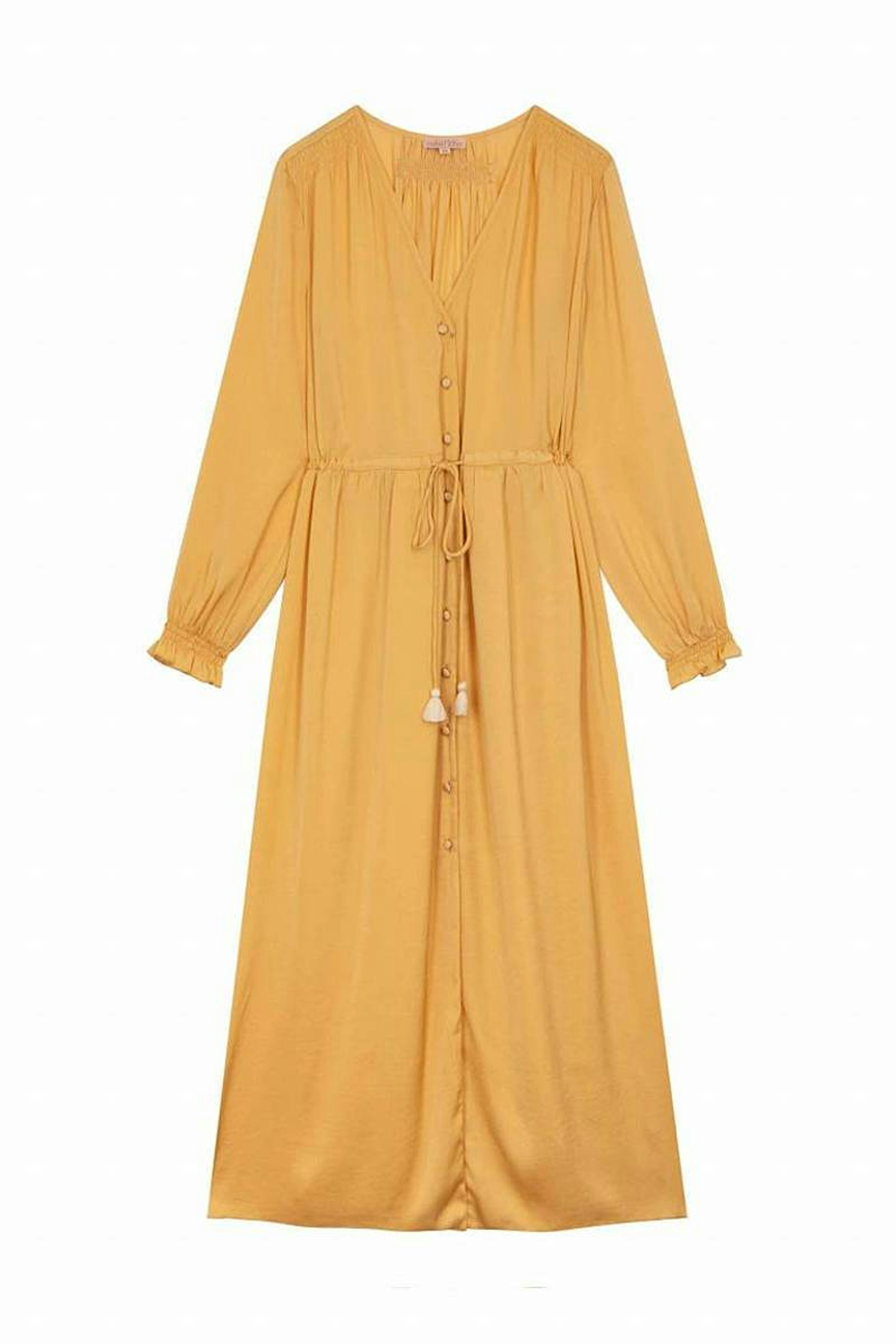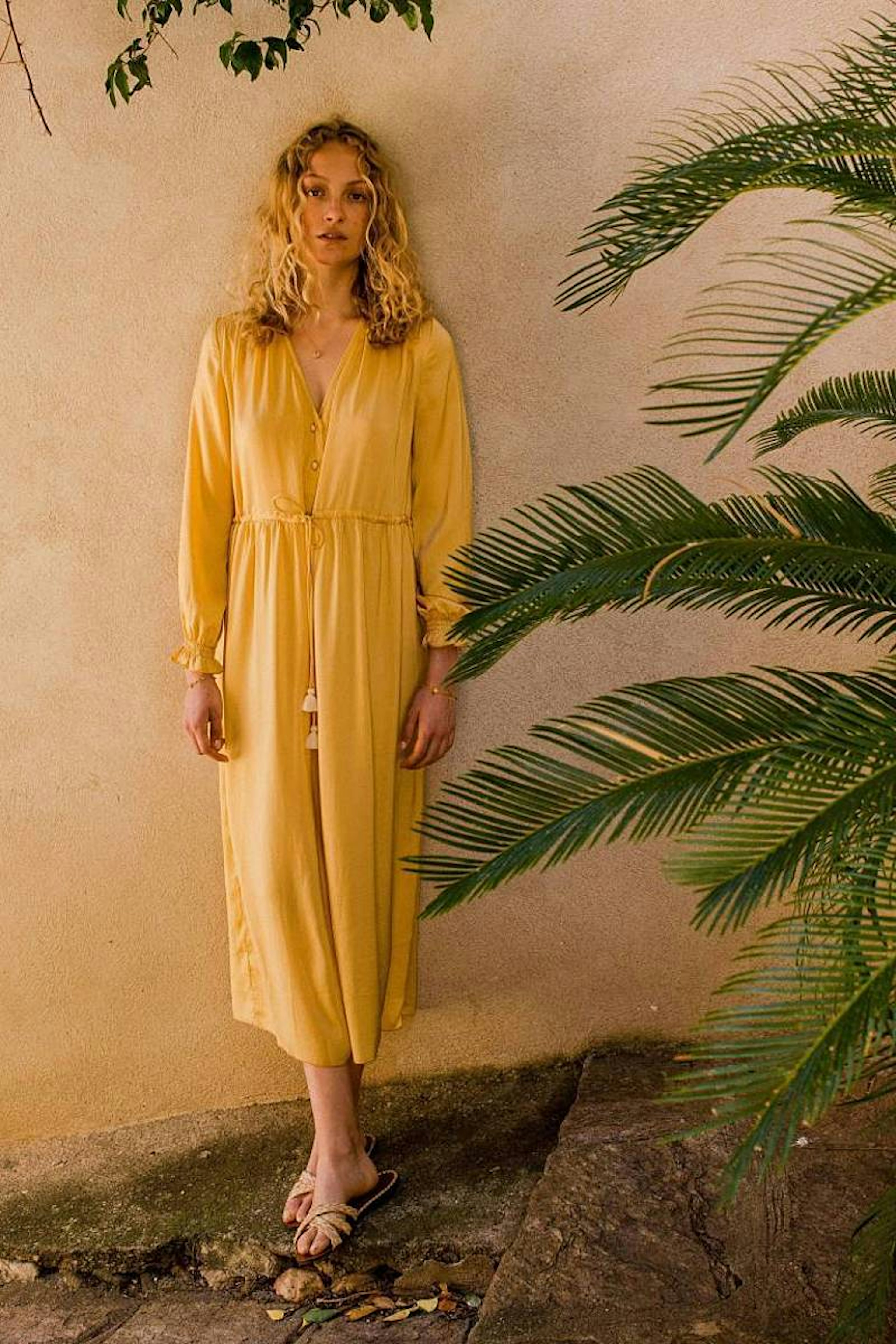 โข Robe bohรจme chic longue en viscose โข Manches longues et resserrรฉes aux poignets โข Ouverture boutonnรฉe sur toute la longueur โข Cordon ร pompons ร nouer ร la taille