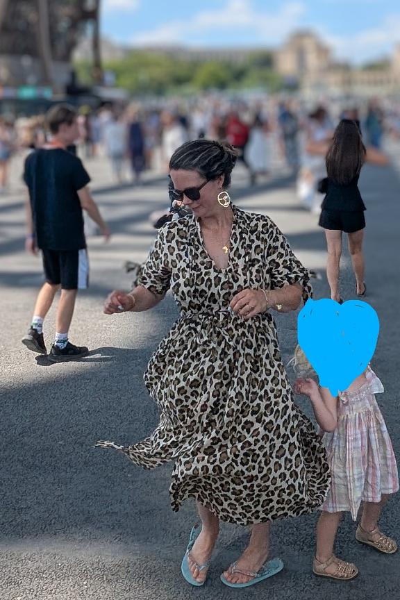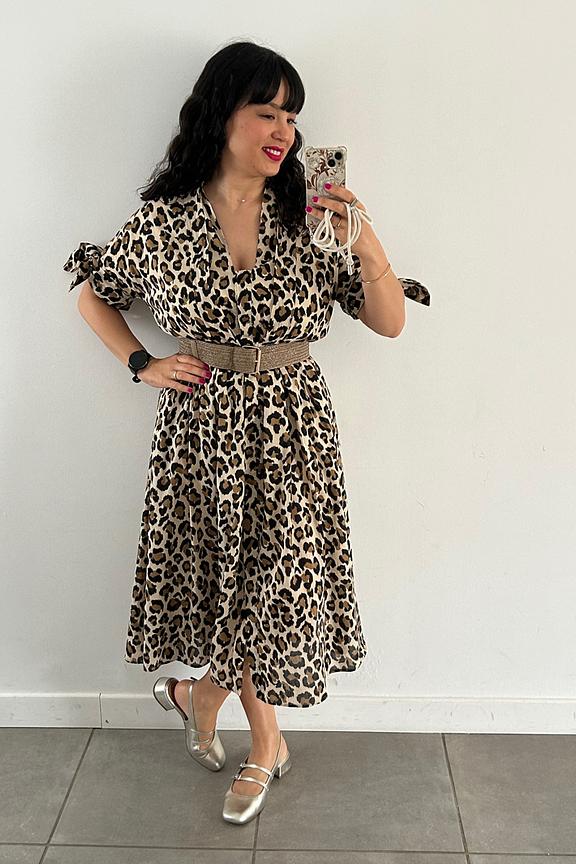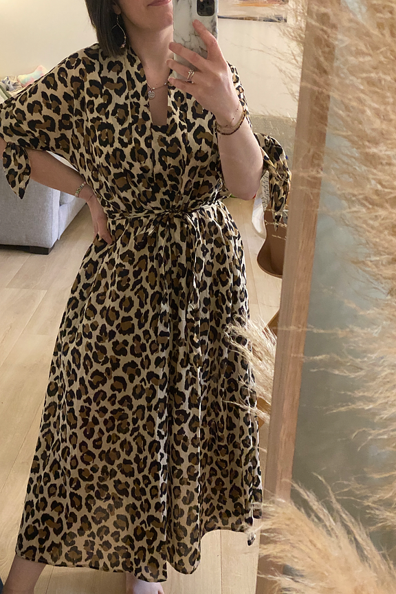Cette robe flirte avec un charme félin qui se marie parfaitement à des sandales dorées pour une élégante allure estivale. • Robe en coton • Coupe portefeuille • Manches nouées • Longueur midi • Motif léopard