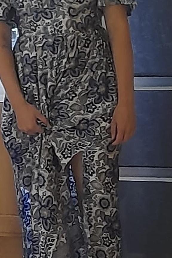 “Très belle robe , il ne fallait pas plus grand pour 1,63m. Décolleté mais cela fait l’affaire quand même Matière synthétique”