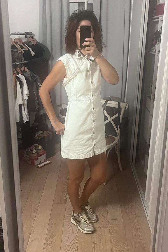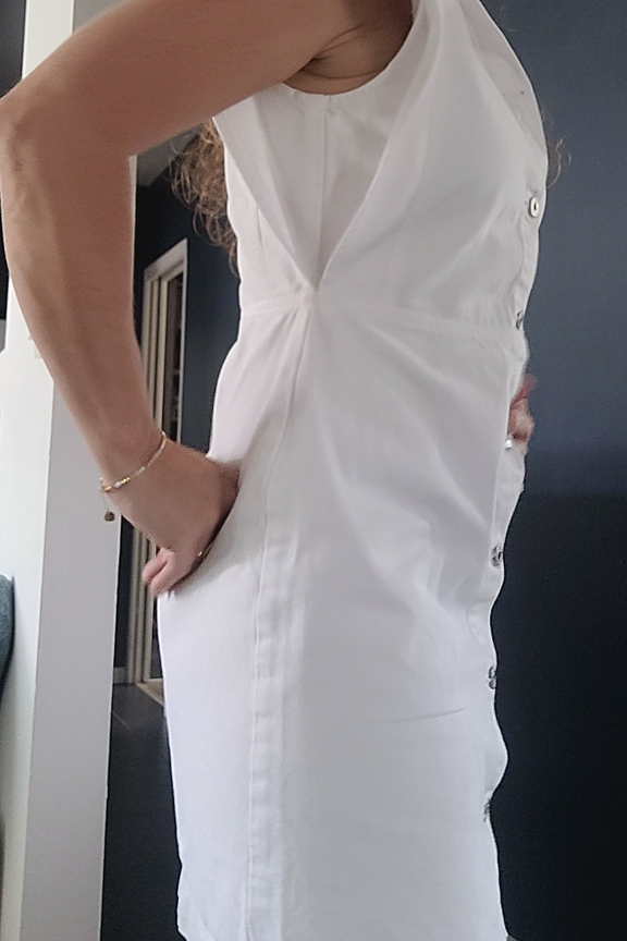 Associez cette robe blanche à une paire de sandales colorées et un sac en osier pour une allure estivale chic. Parfaite pour les journées ensoleillées ou une soirée décontractée. • Robe droite en coton • Col chemise élégant • Sans manches modernes • Boutons sur le devant • Couleur blanc éclatant