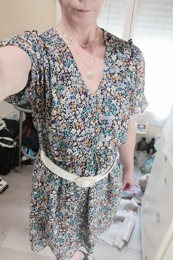โ€œJe nโ€™ai pas vraiment aimรฉ cette robe. Le motif est un peu vieillot ร  mon goรปt et les manche au bout รฉlastique ne sont pas trรจs confortables. La longueur est bien en revanche, et la robe taille plutรดt bien.โ€