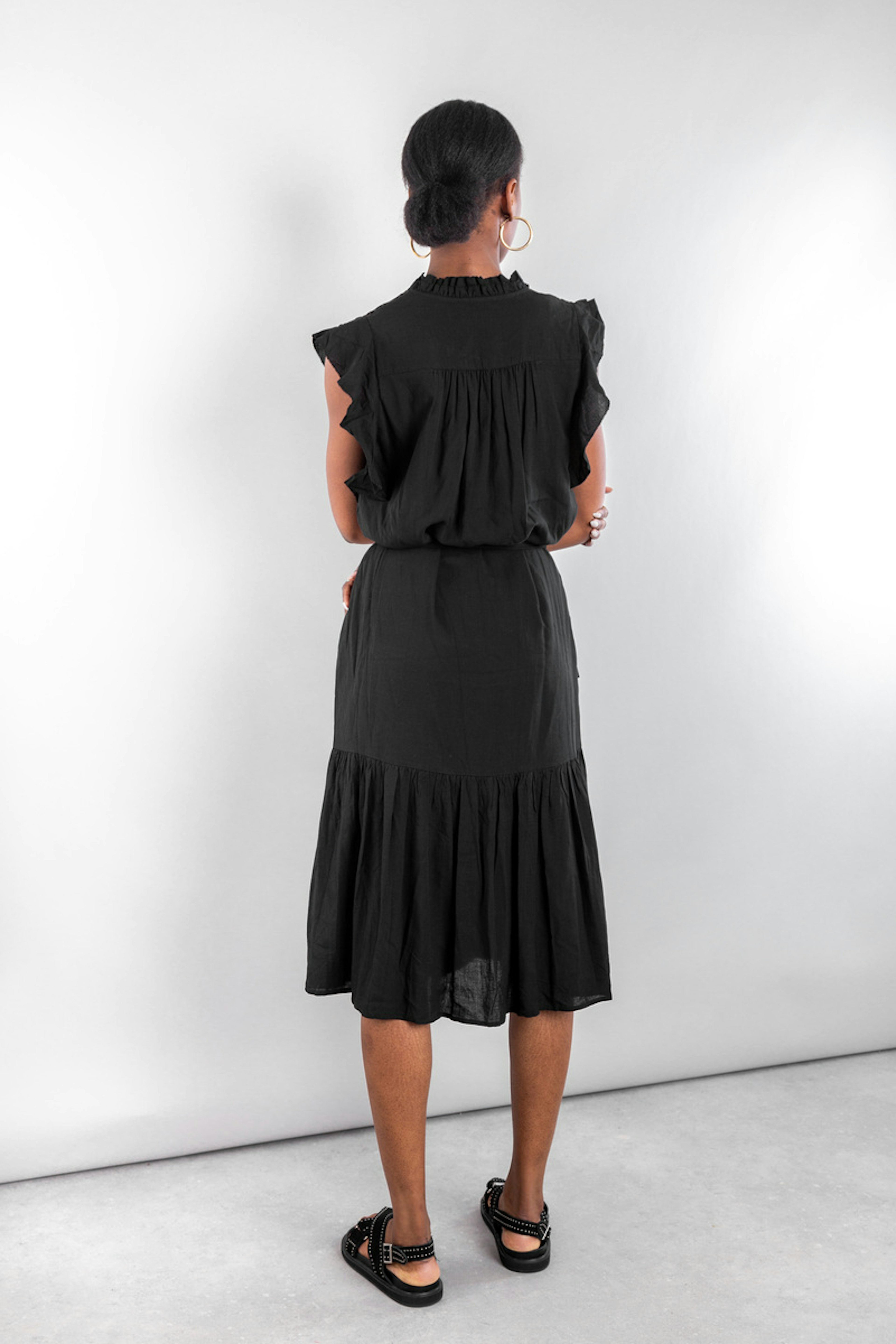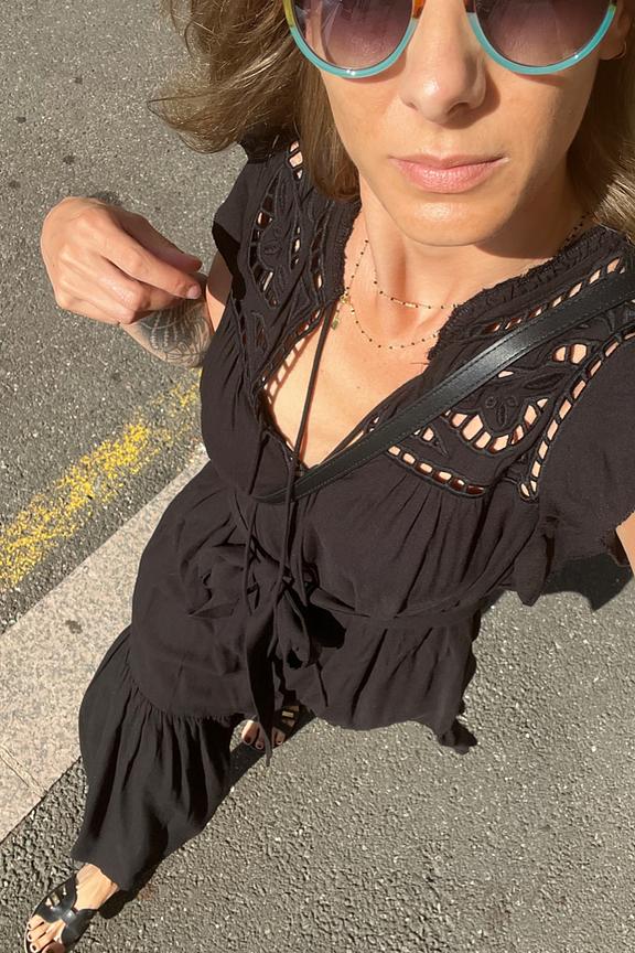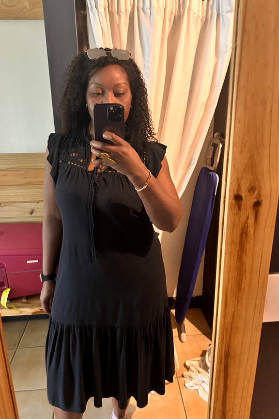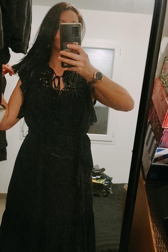 โข Robe midi noire ร broderie โข Col rond ร nouer โข Empiรจcement en broderie anglaise aux รฉpaules โข Manches courtes โข Passants pour la ceinture + ceinture amovible inclue โข Dรฉcoupe bas โข En viscose et lin mรฉlangรฉs โข Longueur de robe : 110 cm