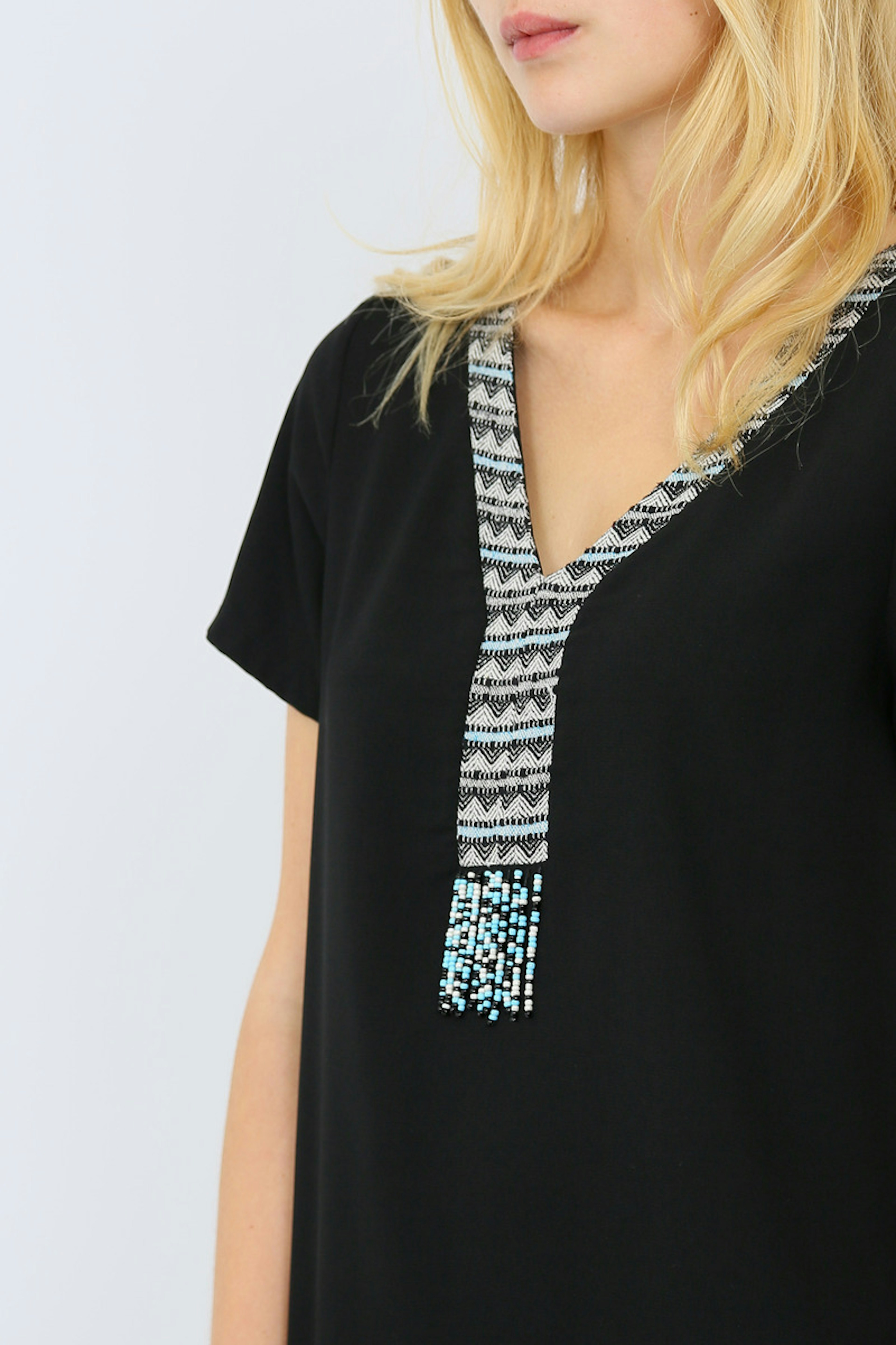 Robe noire manches courtes et col V avec dรฉtails de franges perles bleues.