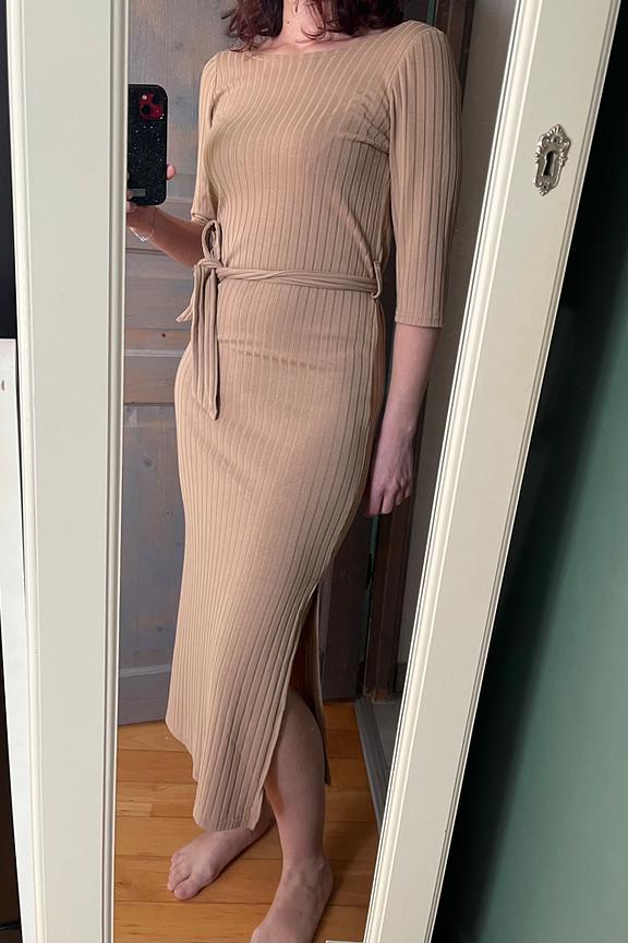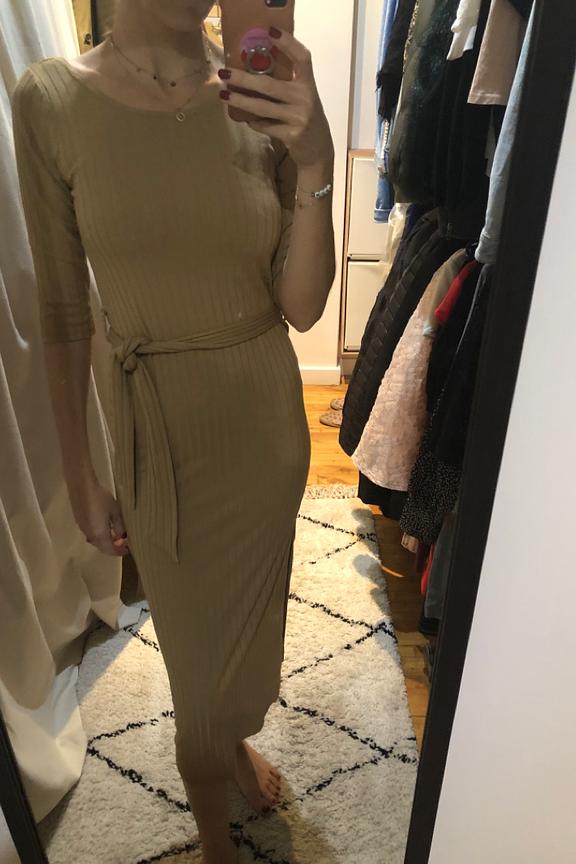 โข Robe longueur midi โข Manches 3/4 โข Decolletรฉ dos โข Col rond โข Ceinture avec passants ร nouer โข Maille douce โข Coupe prรจs du corps โข Matiรจre moulante