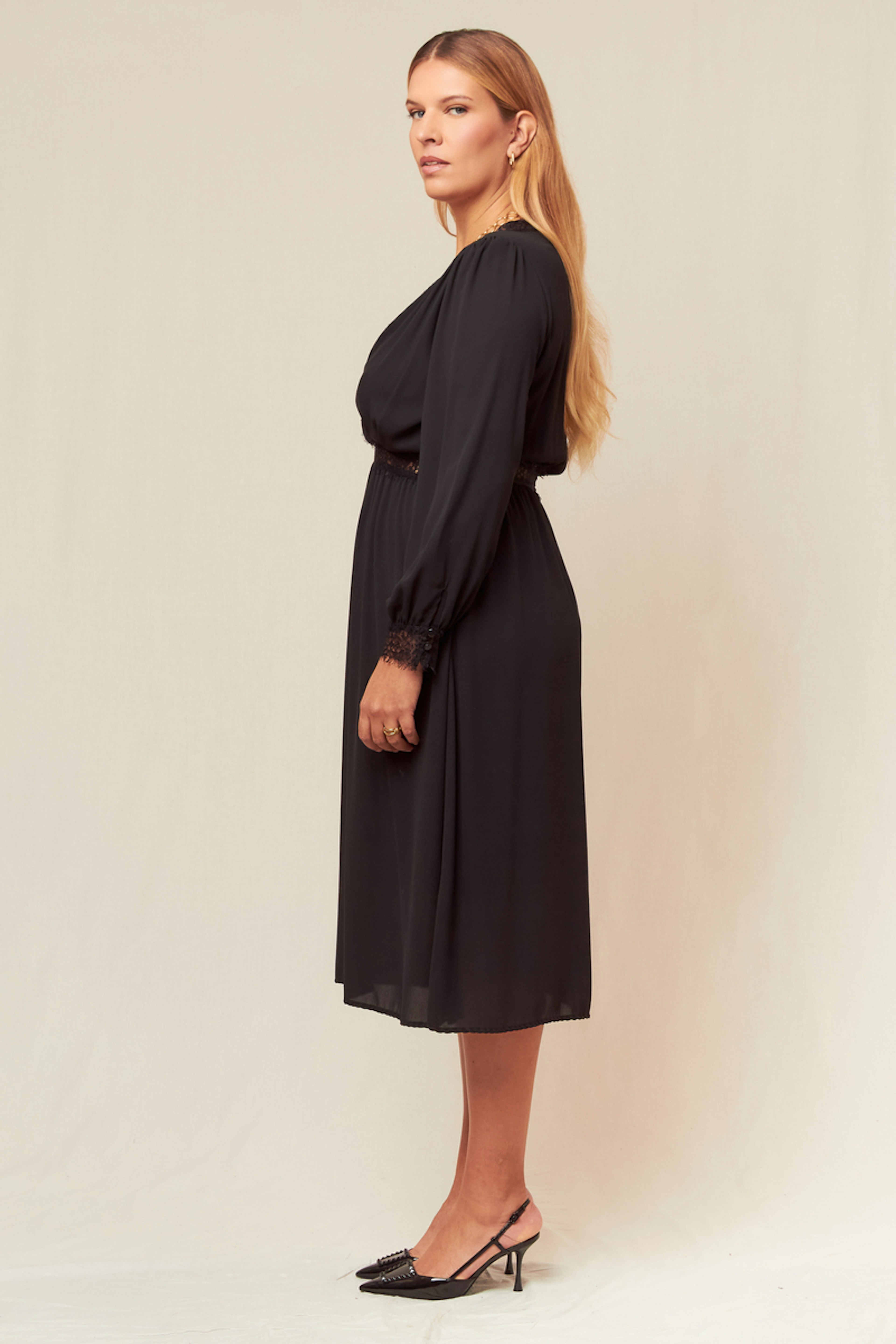 • Robe longue avec empiècement en dentelle à la taille • Col V plongeant avec empiècement en dentelle • Manches longues avec poignets en dentelle