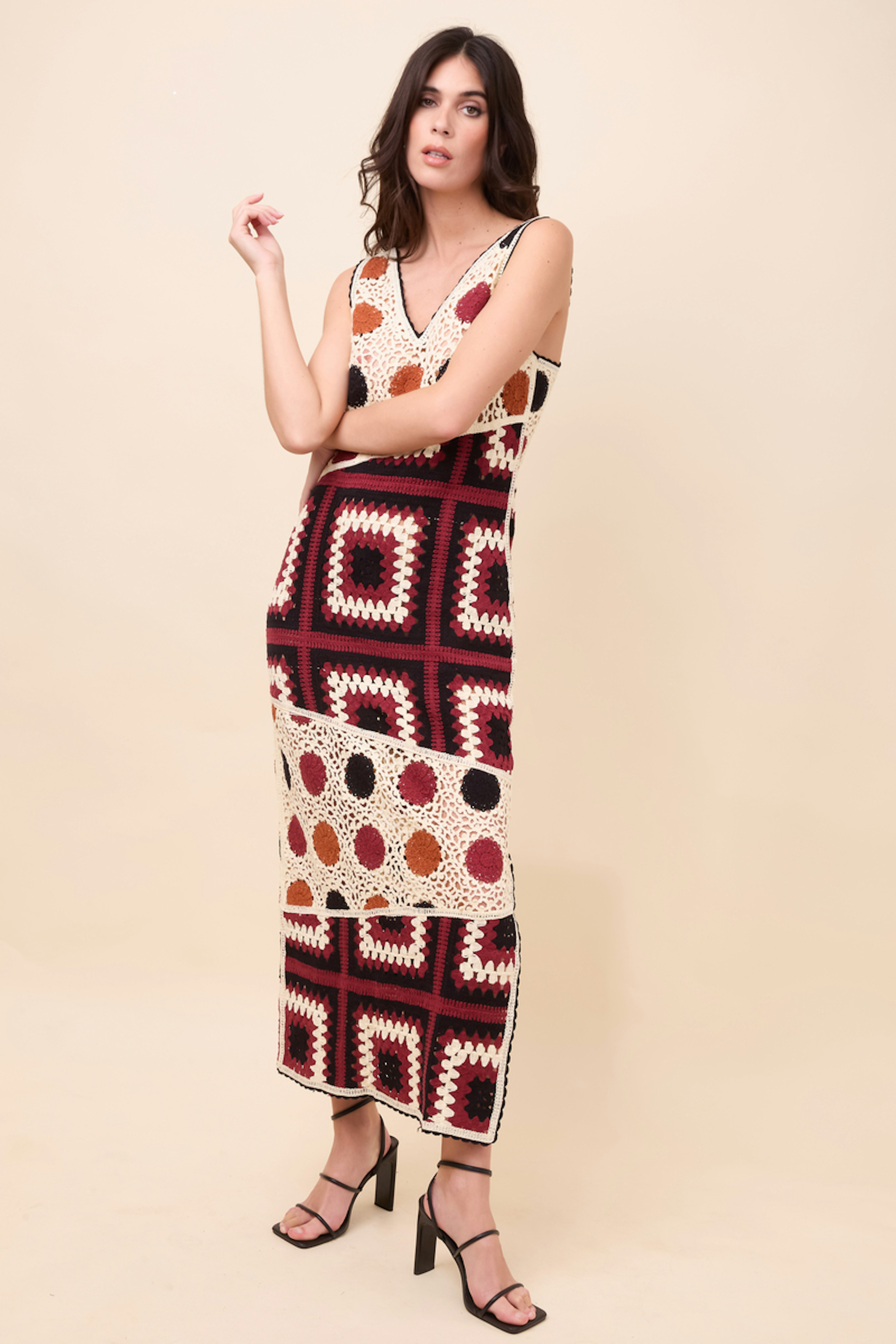 Associez cette robe crochetée à des sandales légères et un panier en osier pour un look estival chic. Idéale pour une journée ensoleillée ! • Robe longue en coton • Décolleté en V • Motif crocheté • Sans manches • Imprimé graphique
