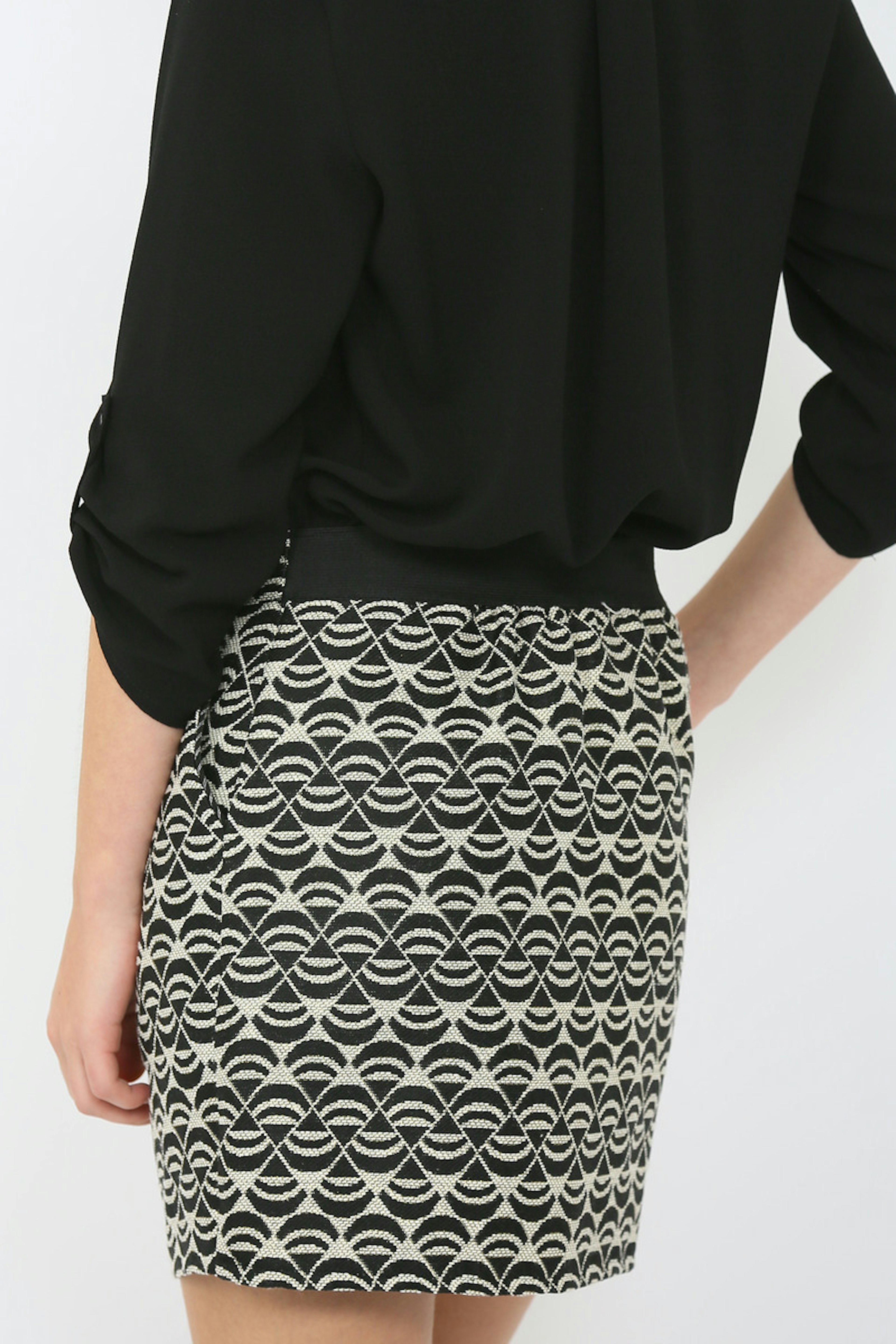 Robe noire et crรจme avec haut blousant col V et jupe en jacquard graphique.