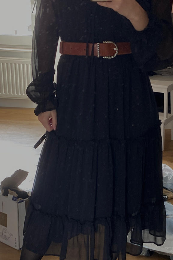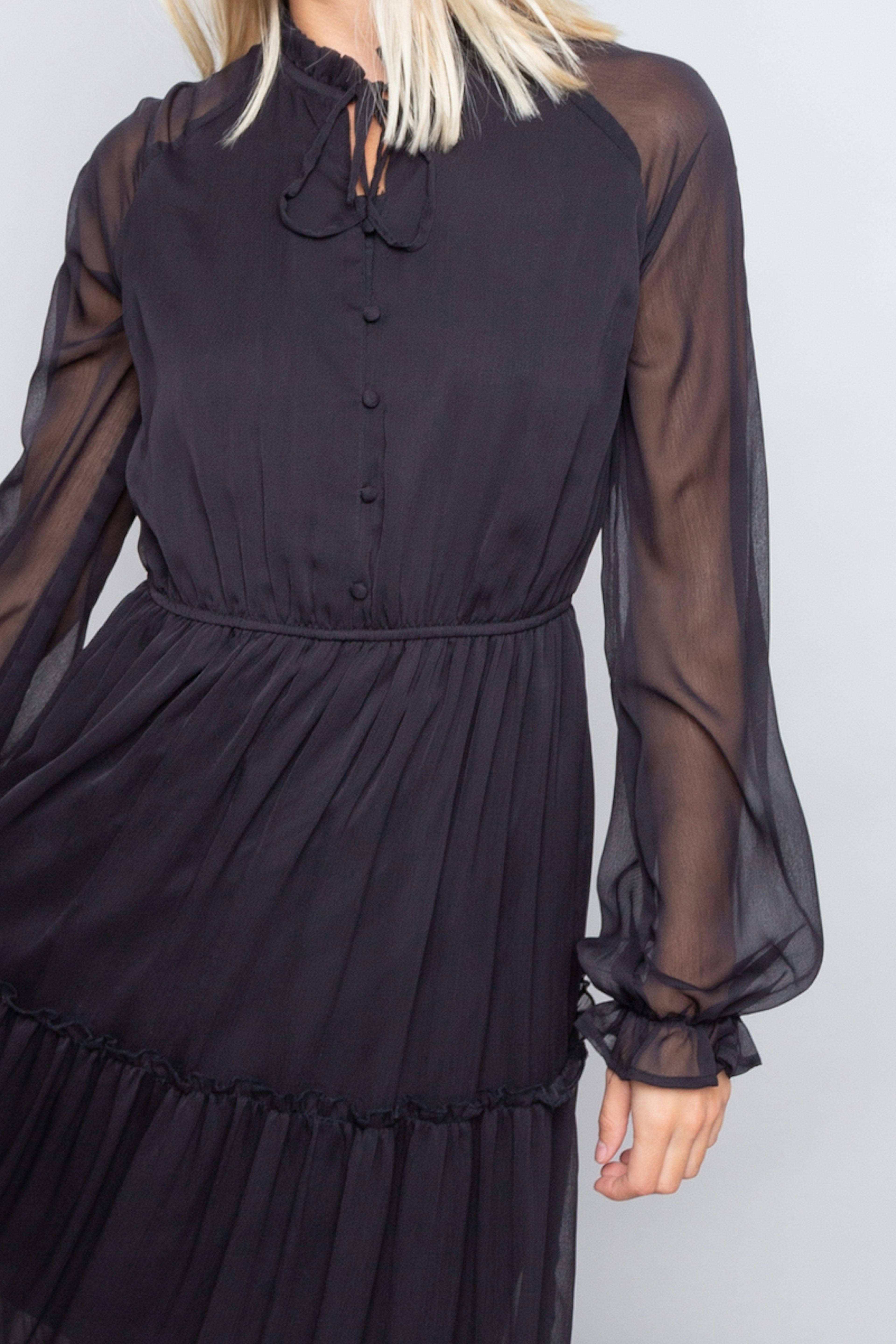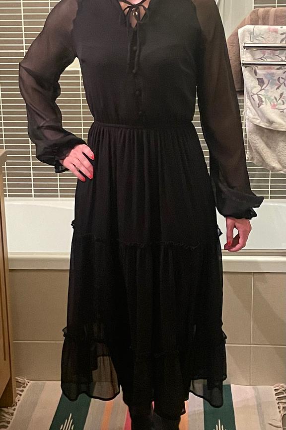 โข Robe longue รฉvasรฉe en tulle noire โข Doublure noire โข Haut chemisier boutonnรฉe jusqu'ร la taille โข Col montant froncรฉ qui peut se fermer avec de petites ficelles โข Manches longues en tulle noire transparente โข Poignets resserrรฉs โข Volants