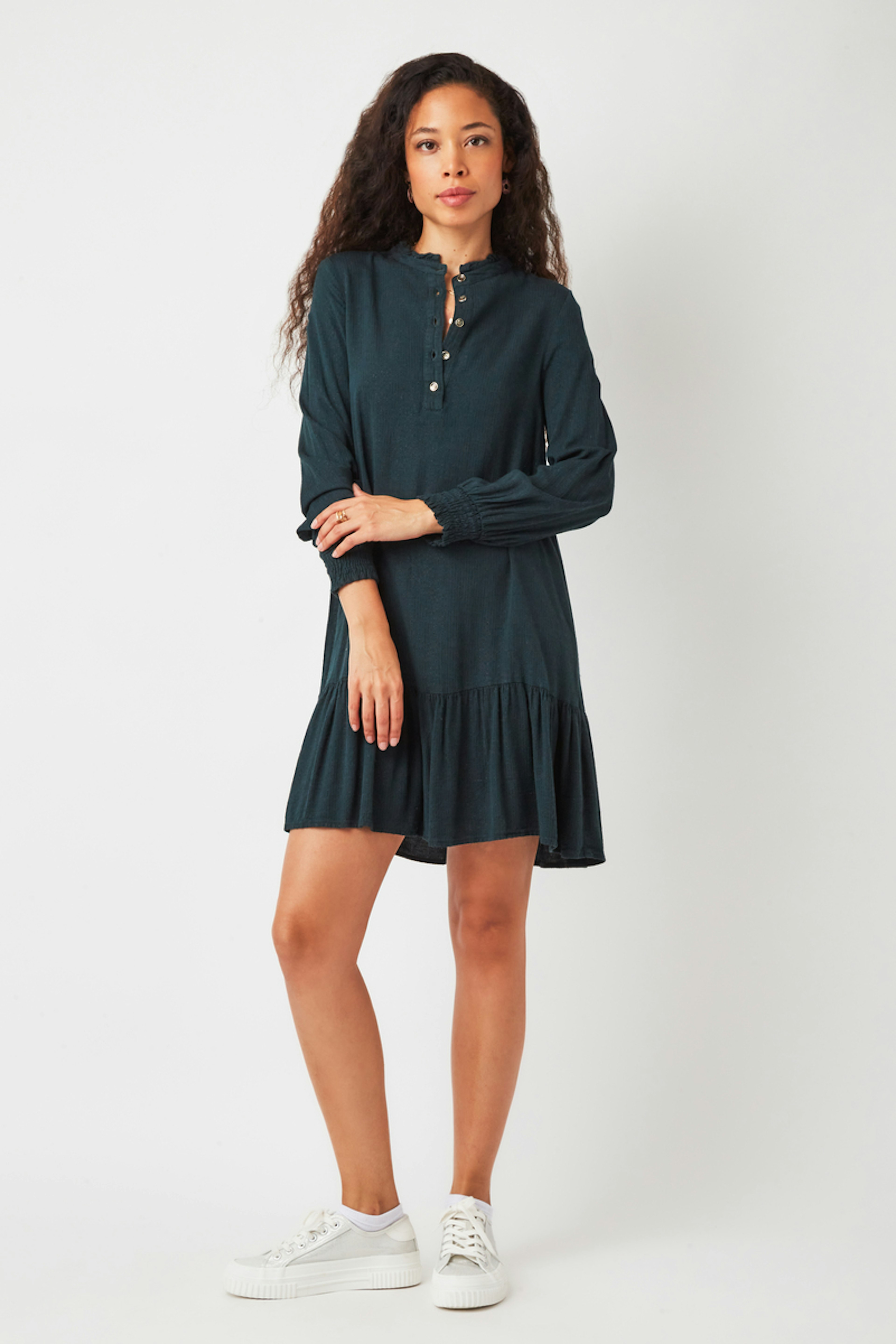 โข Robe courte rayรฉe avec fils mรฉtallisรฉs couleur pรฉtrole โข Encolure ronde avec pieds de col et volants โข Patte de boutonnage โข Manches longues avec bas de manches smockรฉs โข Volant froncรฉ en bas de robe. โข Longueur : 92 cm