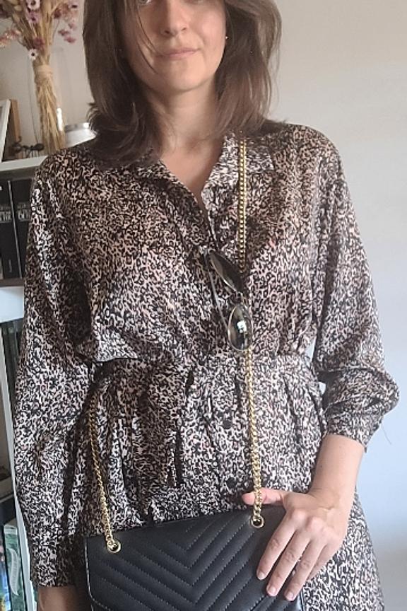 • Robe mi longue chemise imprimé animalier leopard • Boutonnière • Coupe classique • Manches longues • Fentes basses de chaque côté • Ceinture incluse