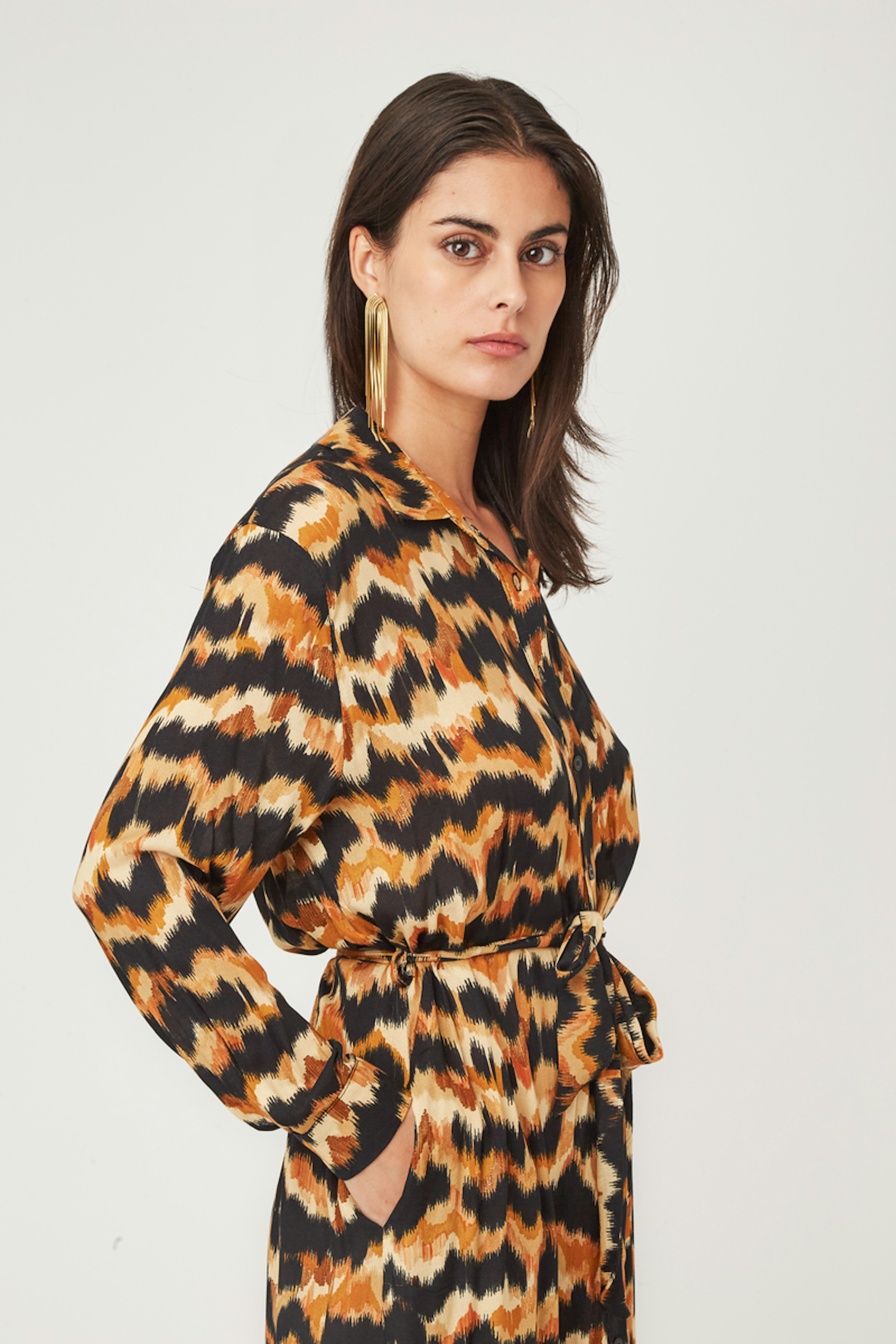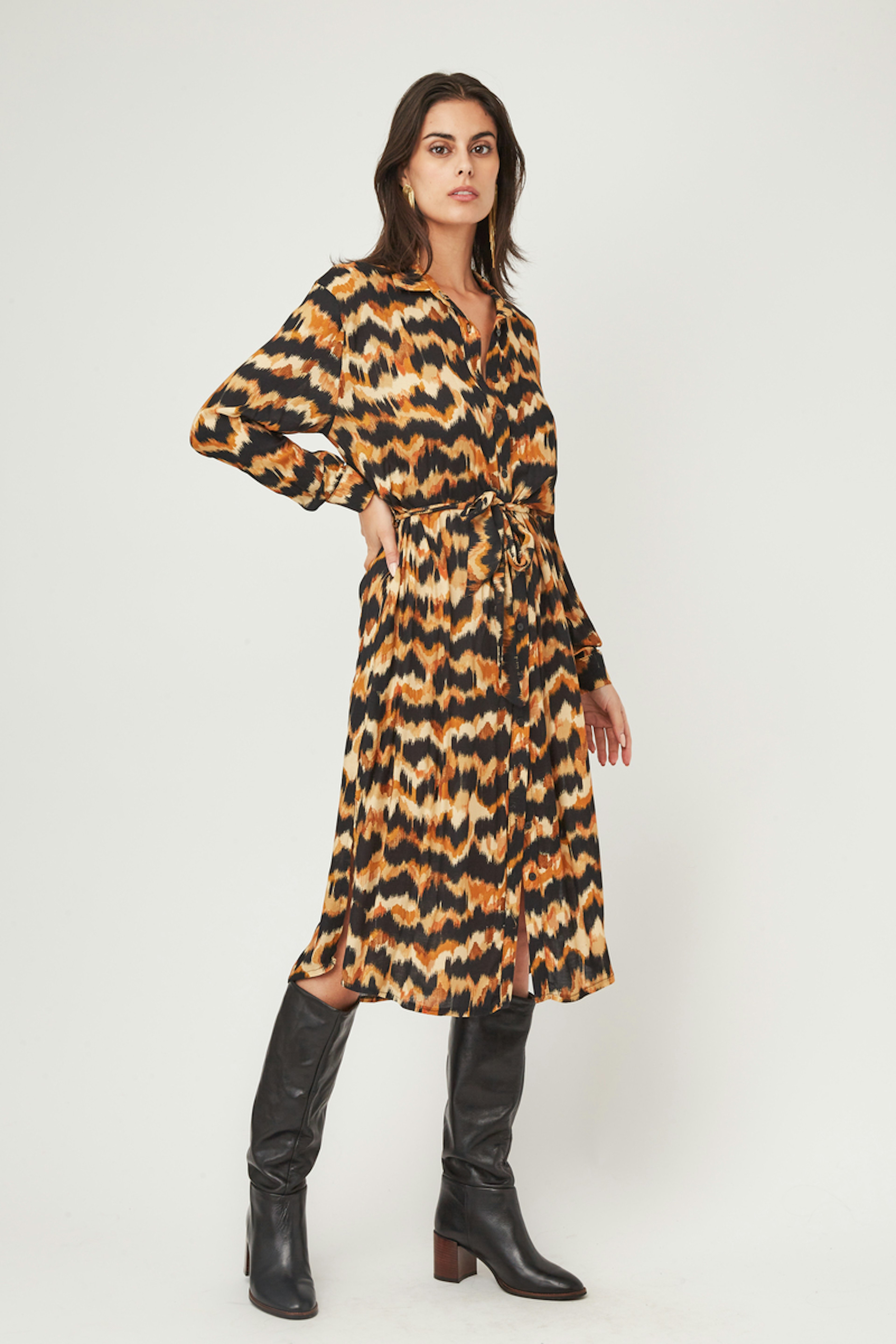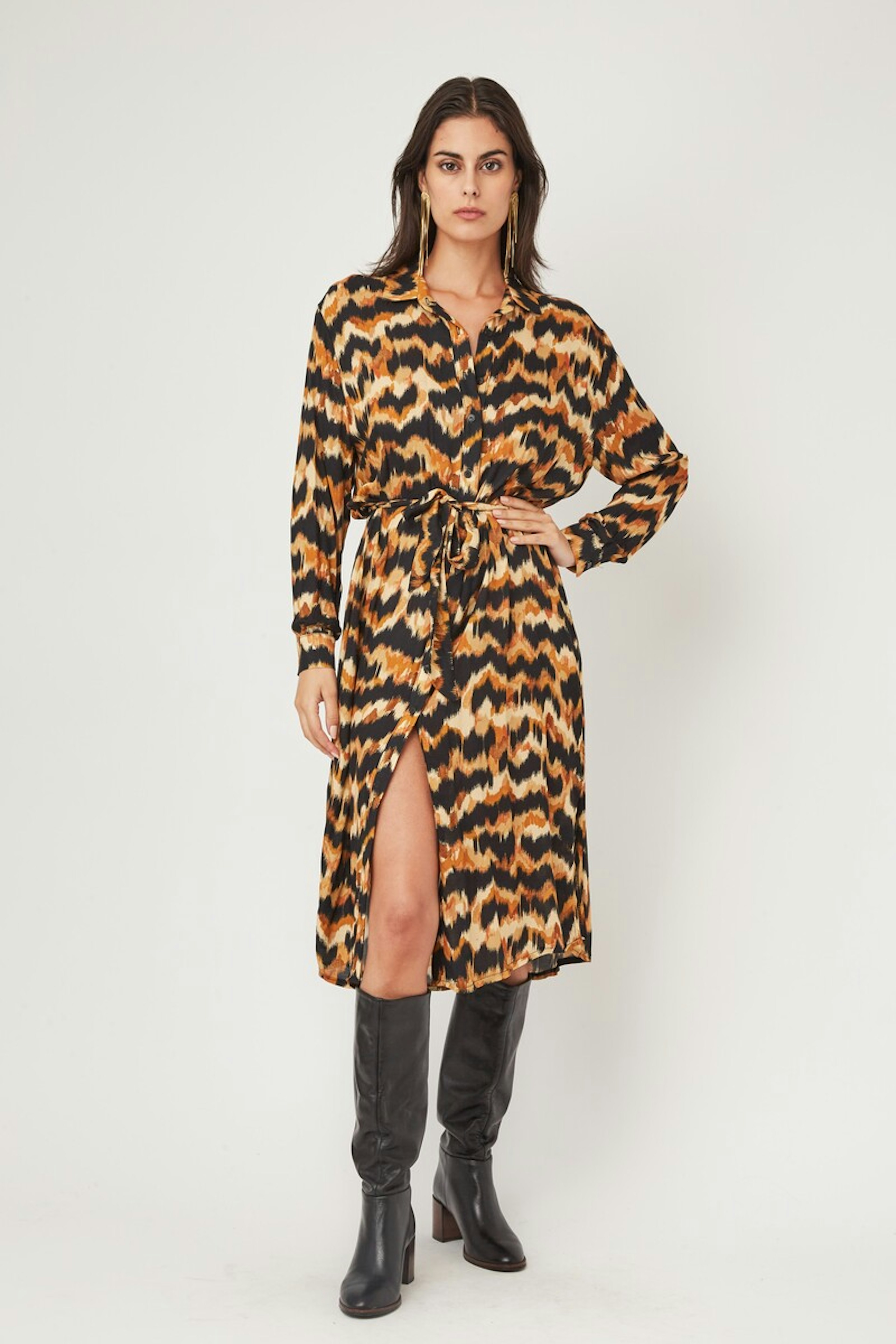 โ€ข Robe cache cล“ur bohรจme โ€ข Manches longues dรฉlicatement resserrรฉes aux poignets โ€ข Ouverture devant boutonnรฉe jusqu'en haut du nombril โ€ข Col chemise โ€ข Longueur midi โ€ข Echancrรฉe devant