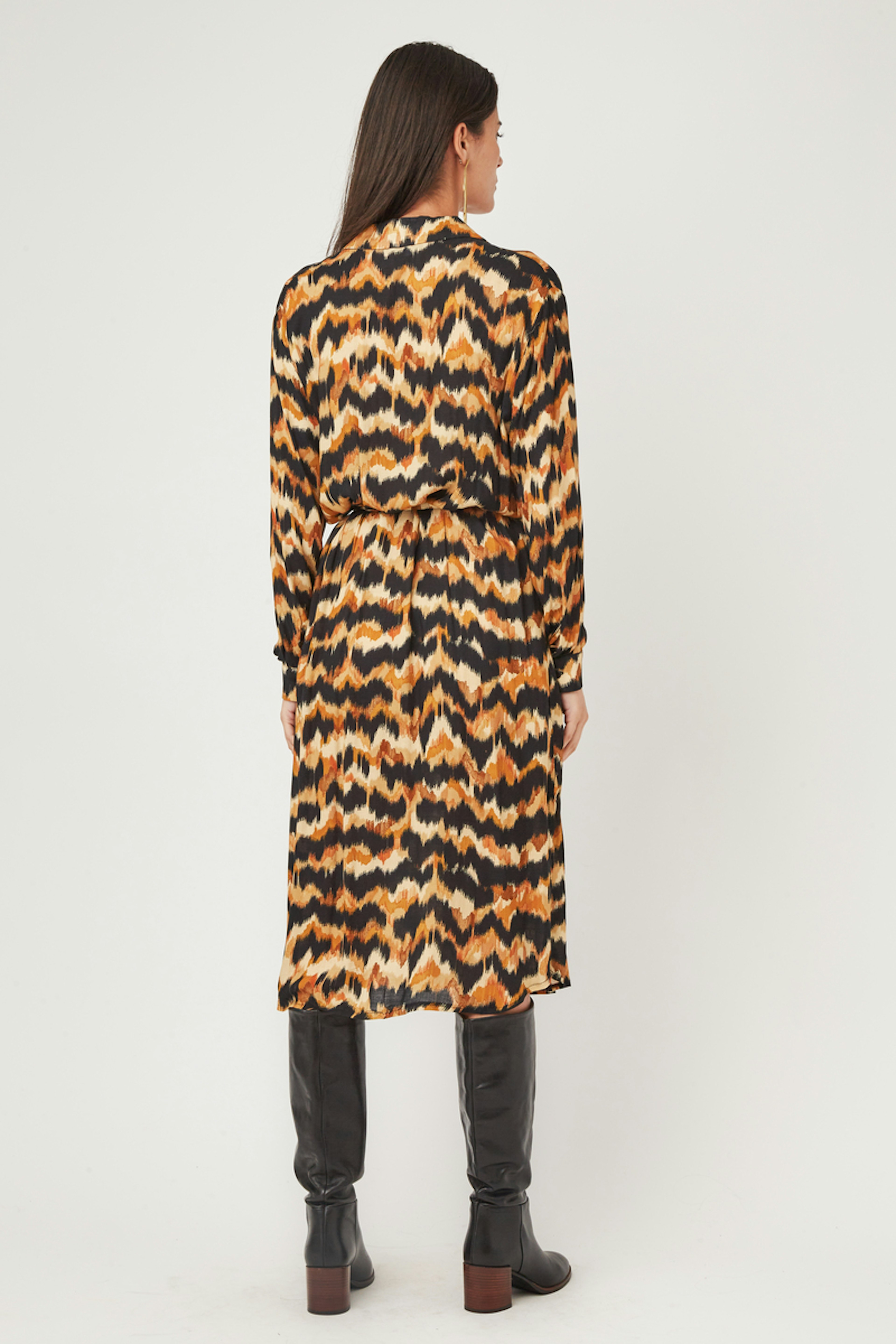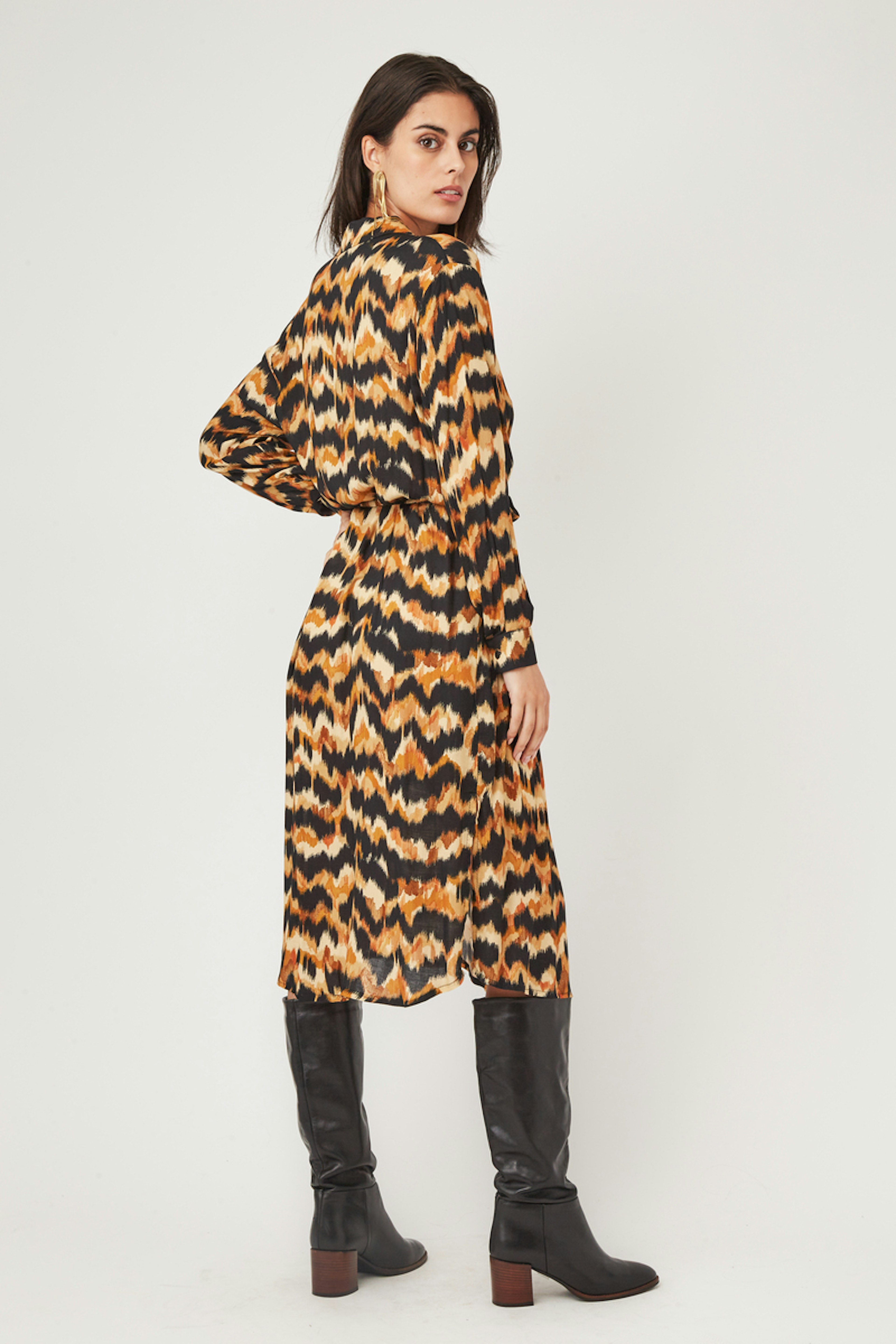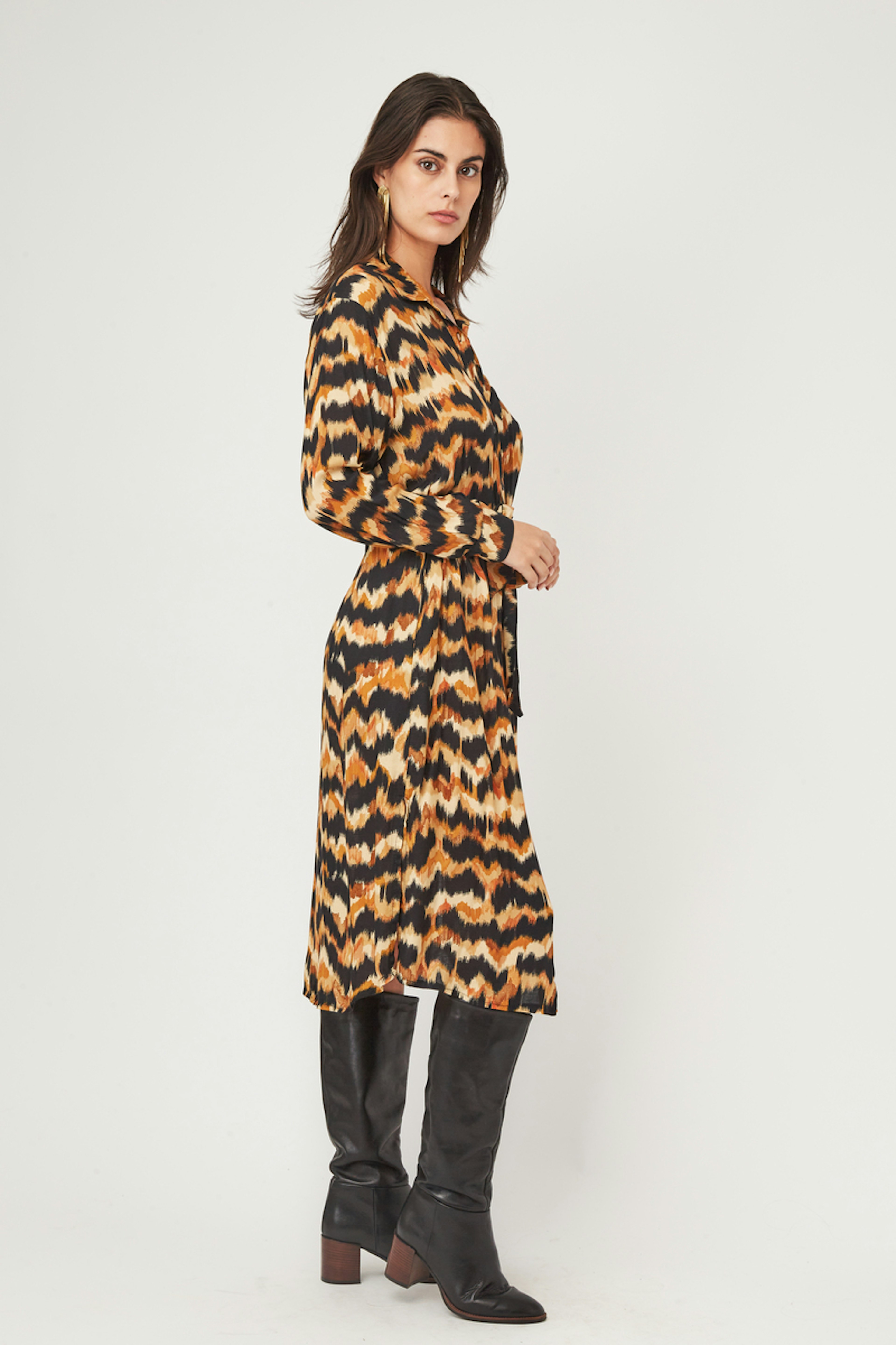 โ€ข Robe cache cล“ur bohรจme โ€ข Manches longues dรฉlicatement resserrรฉes aux poignets โ€ข Ouverture devant boutonnรฉe jusqu'en haut du nombril โ€ข Col chemise โ€ข Longueur midi โ€ข Echancrรฉe devant