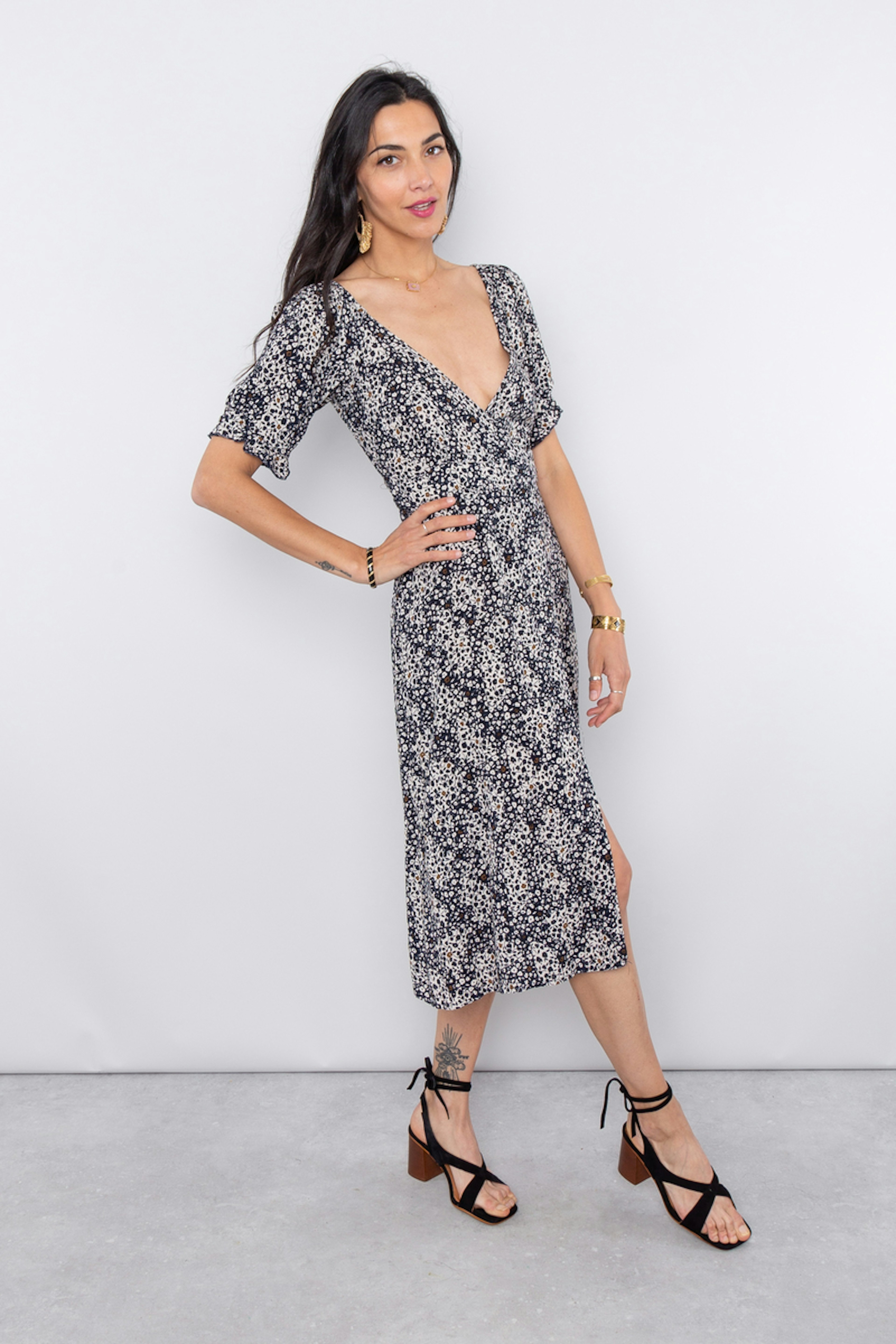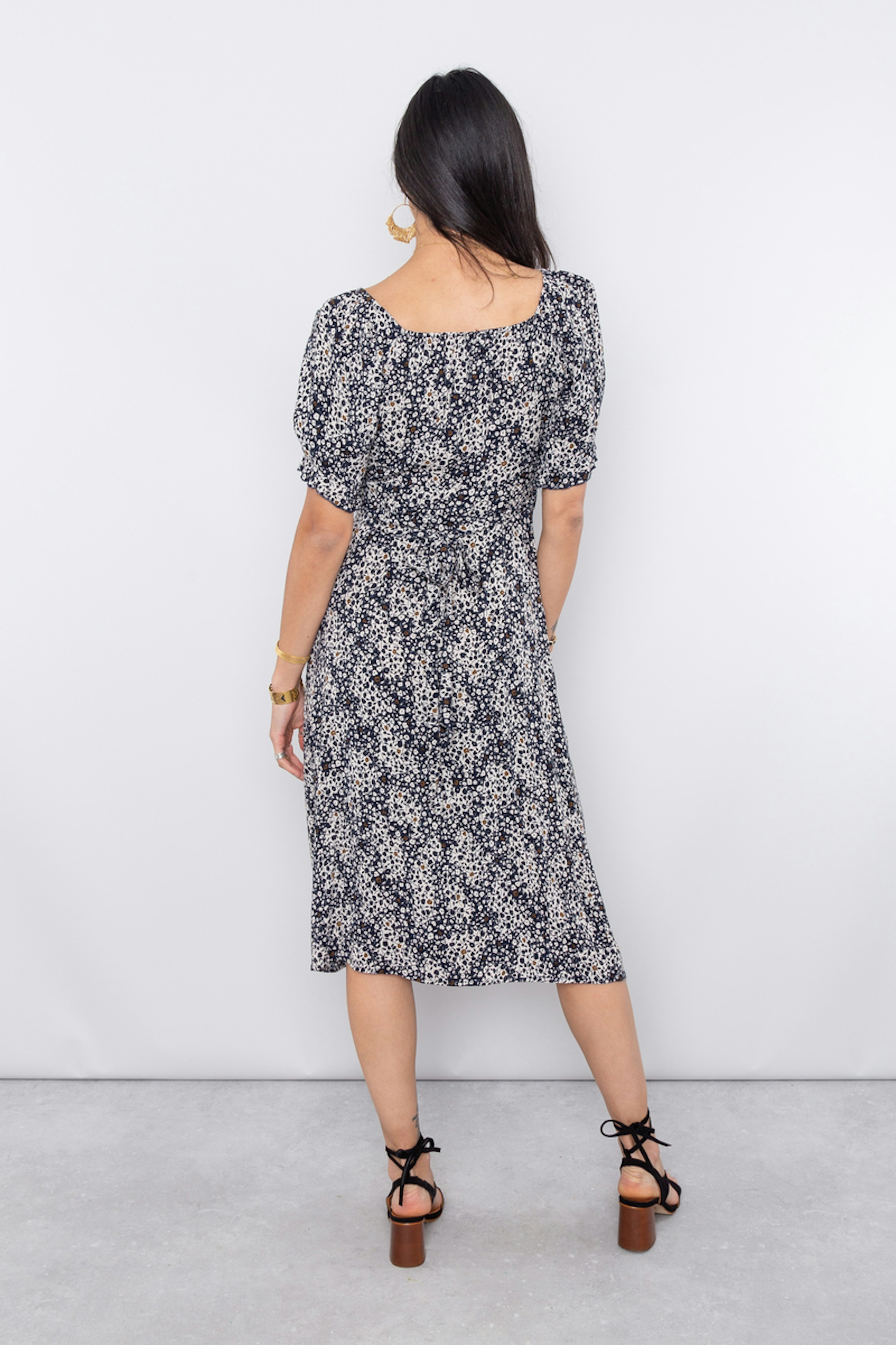 Cette robe ceinturรฉe ร la taille dessine joliment les courbes et met en valeur le dรฉcolletรฉ avec sa coupe cache-coeur. โข Robe cache-coeur ร manches courtes ballon imprimรฉe marine โข Encolure en V โข Ceinture ร nouer ร la taille โข Corsage smockรฉ au dos