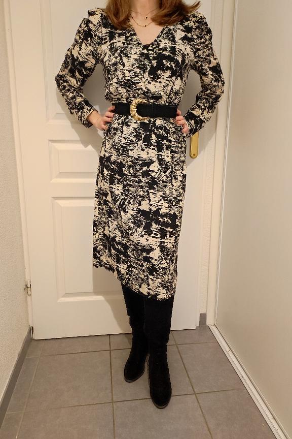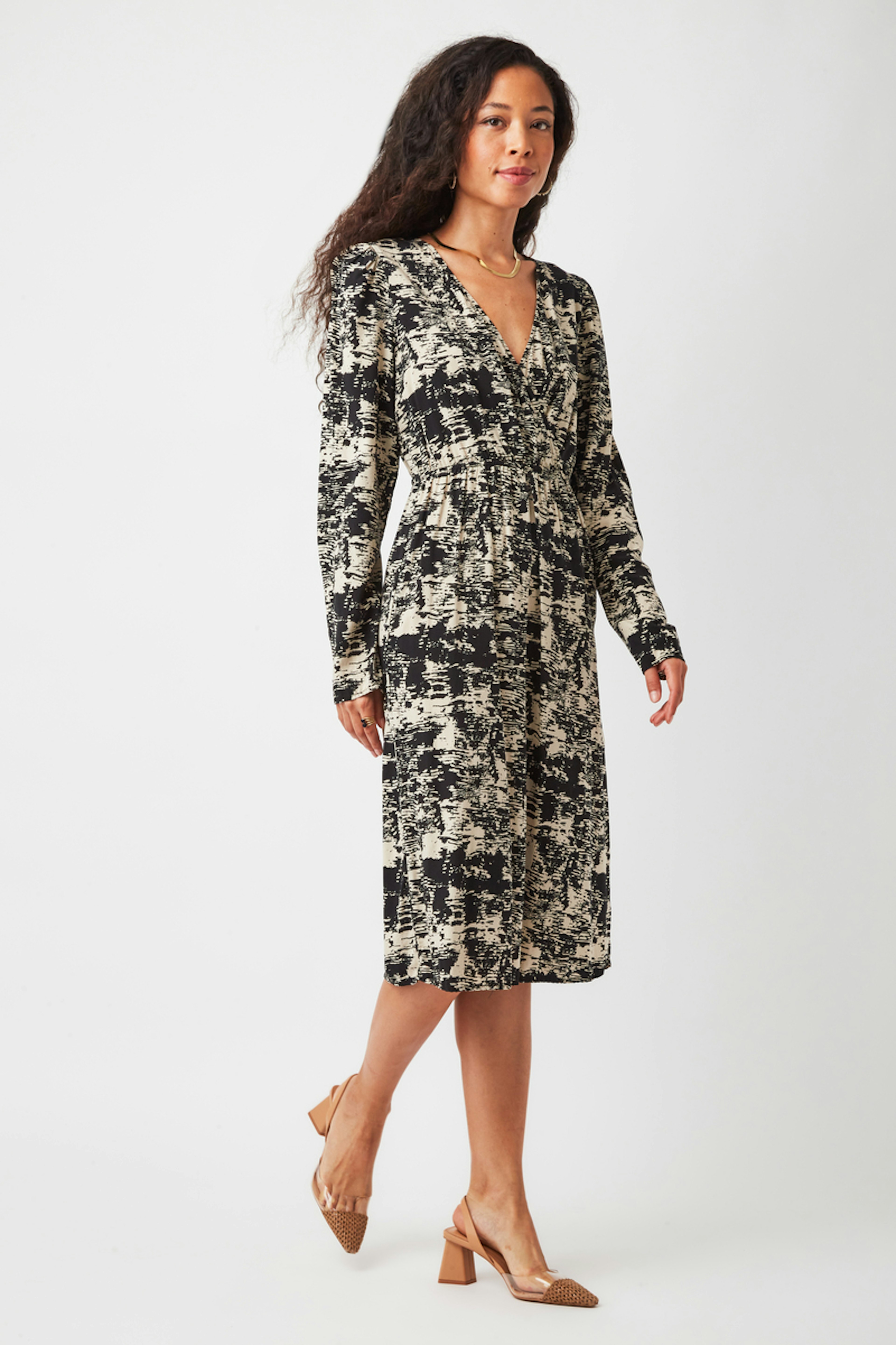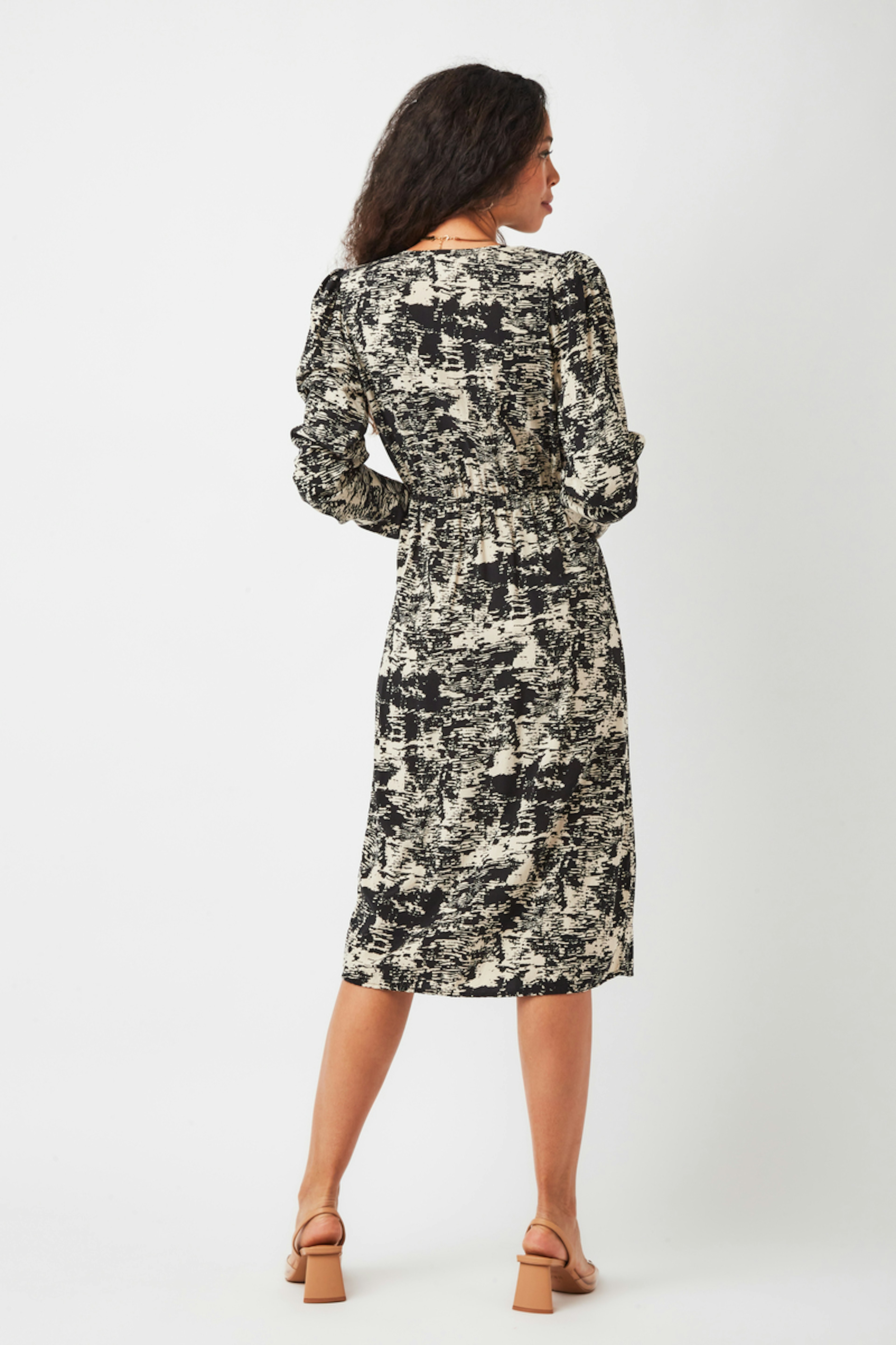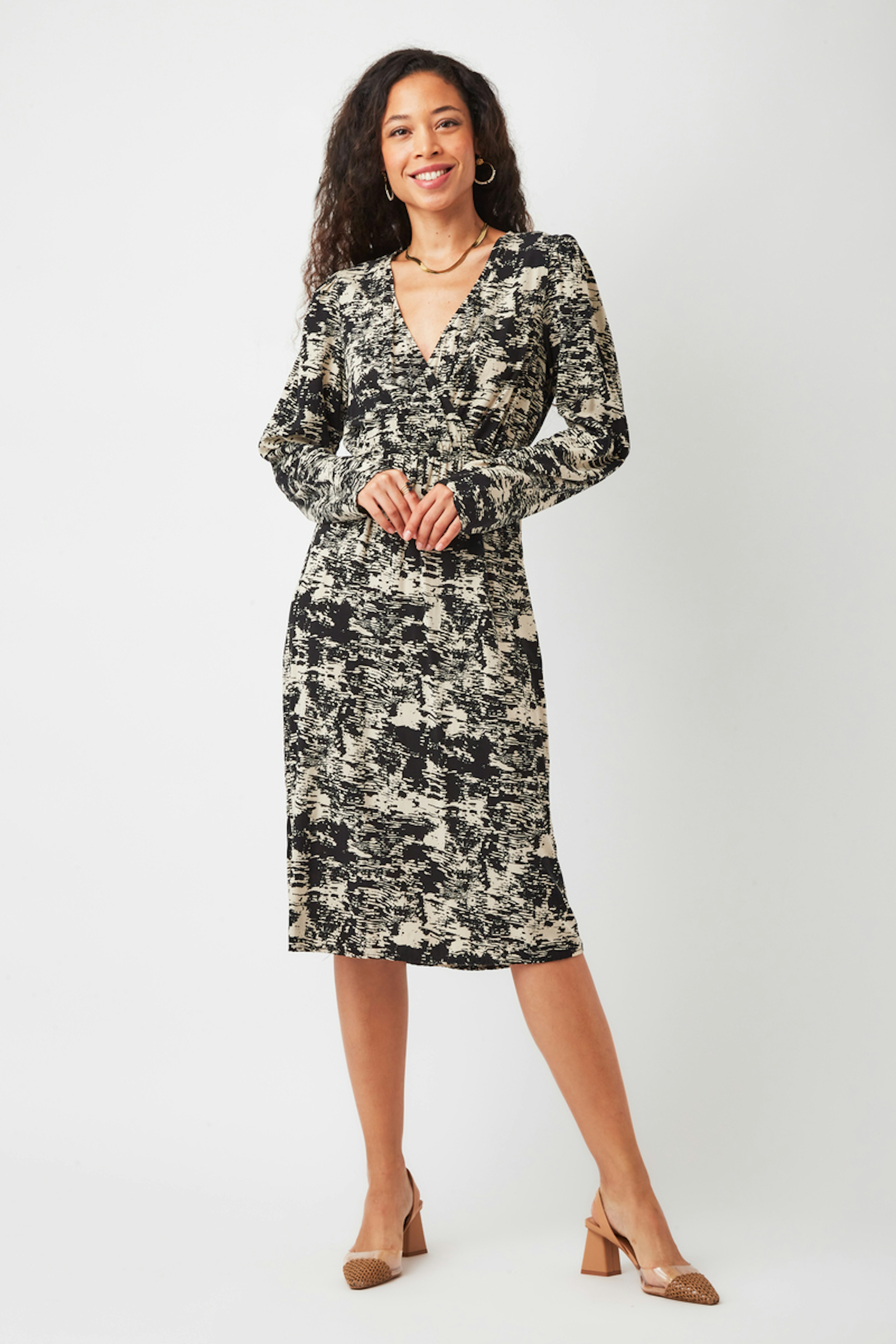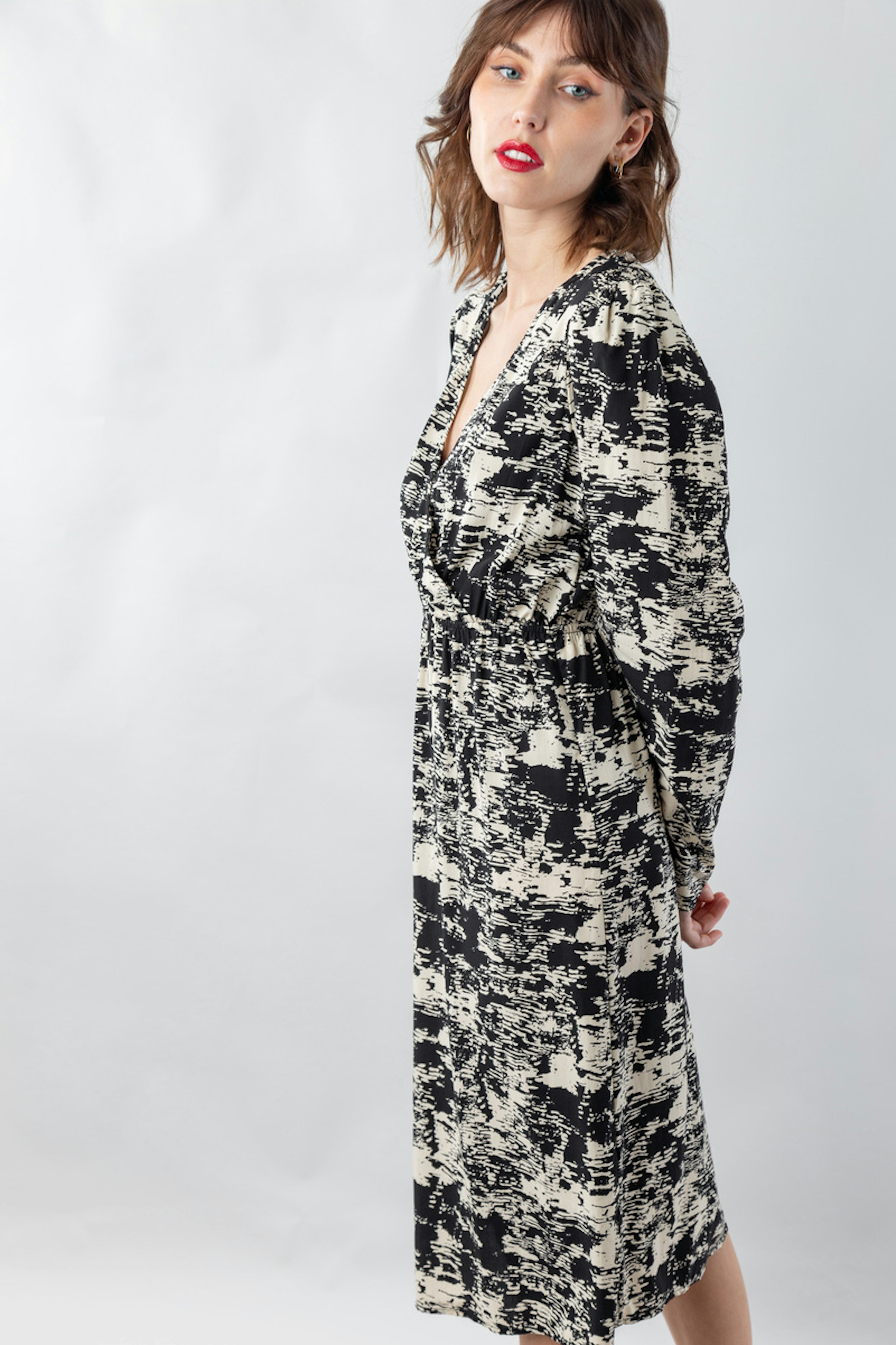 โข Robe mi-longue ร manches longues et ร motif โข รpaules lรฉgรจrement bouffante โข Ligne de coupe รฉlastiquรฉe ร la taille โข Haut style cache-cลur pour sublimer le dรฉcolletรฉ et apporter une touche de sensualitรฉ โข Longueur : 115 cm en taille 38 โข Longueur des manches : 63 cm en taille 38