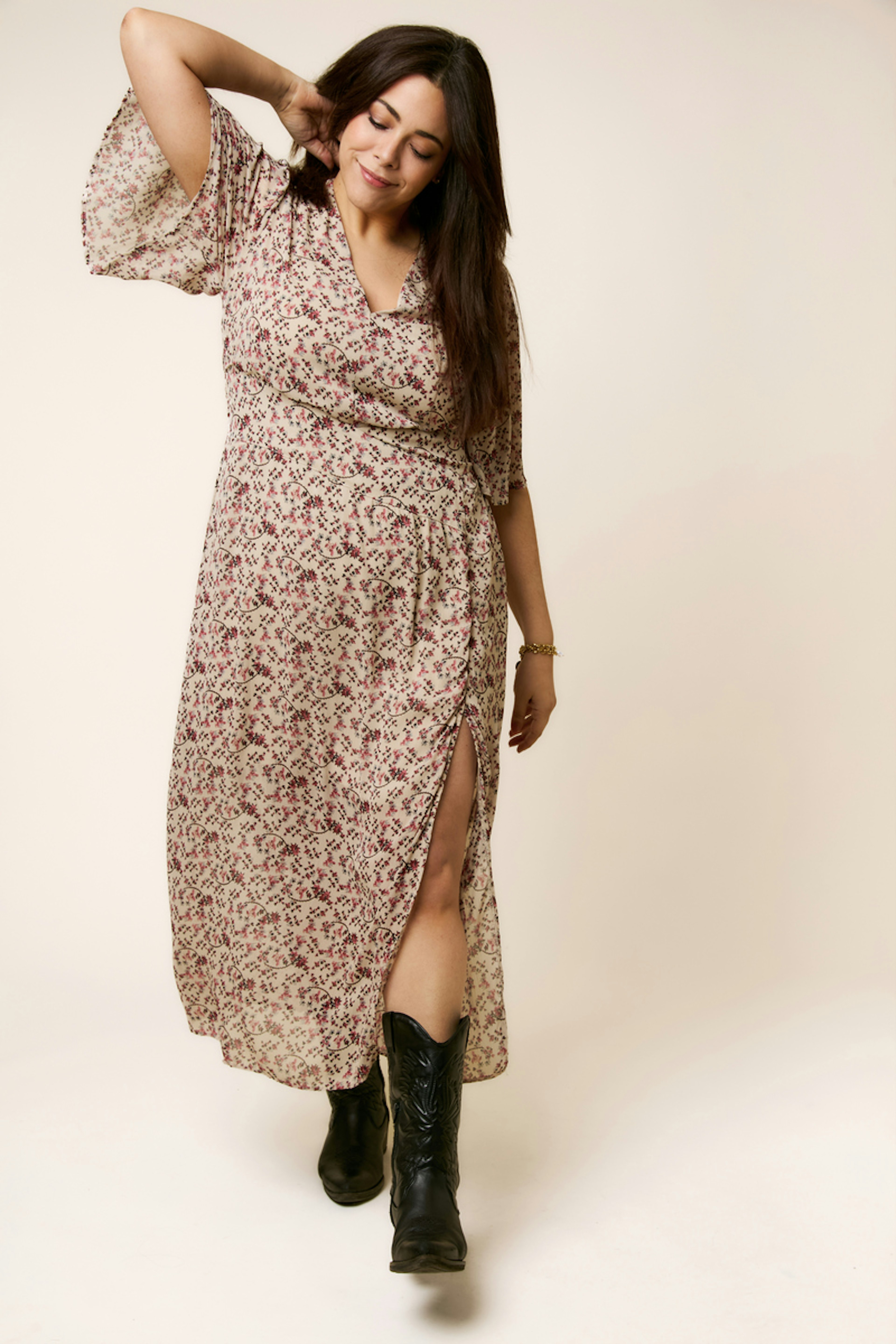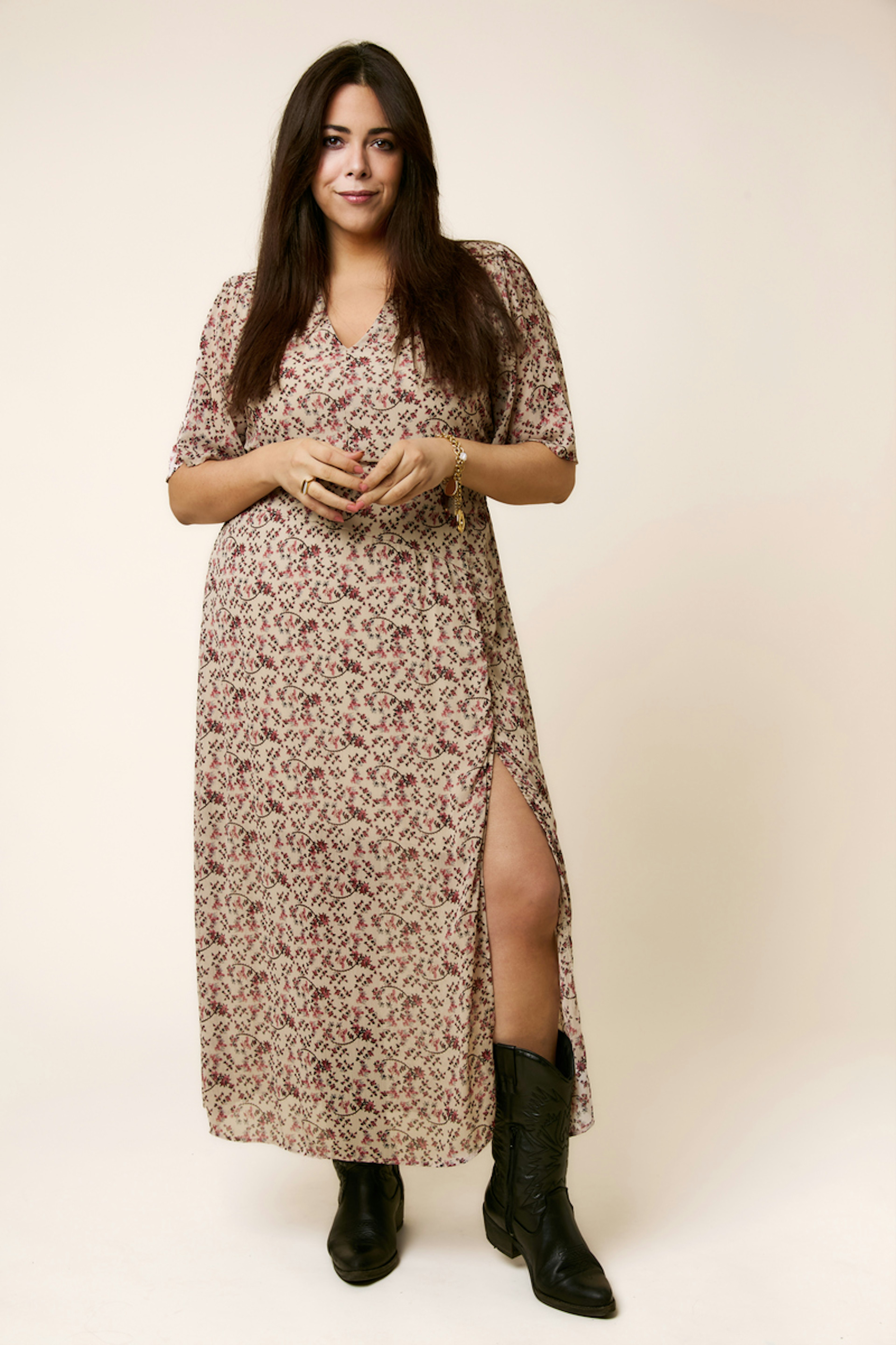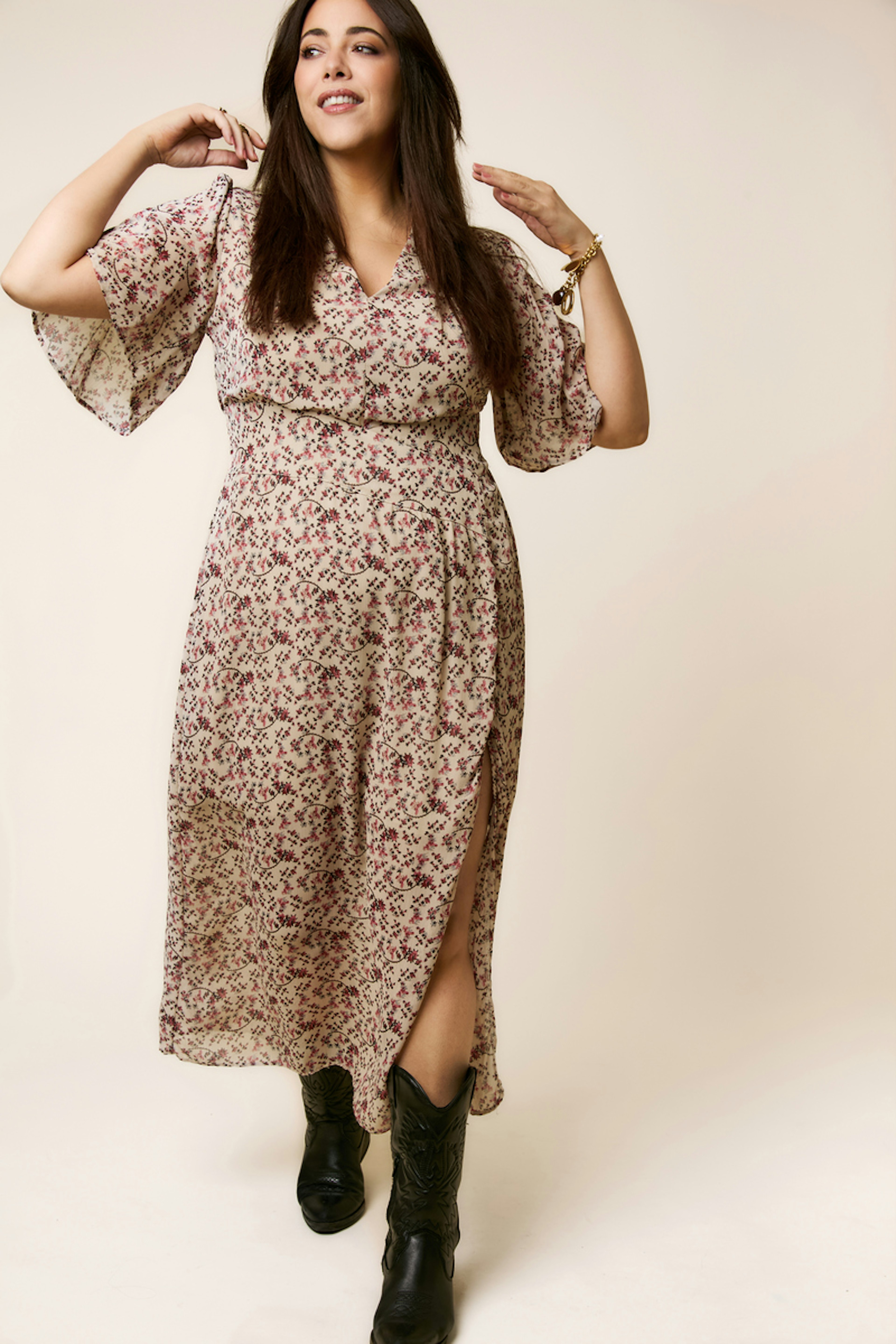 Associez cette robe imprimée à des sandales dorées et un sac en osier pour un look estival chic. • Robe longue • Manches larges • Décolleté en V • Taille cintrée • Fente latérale