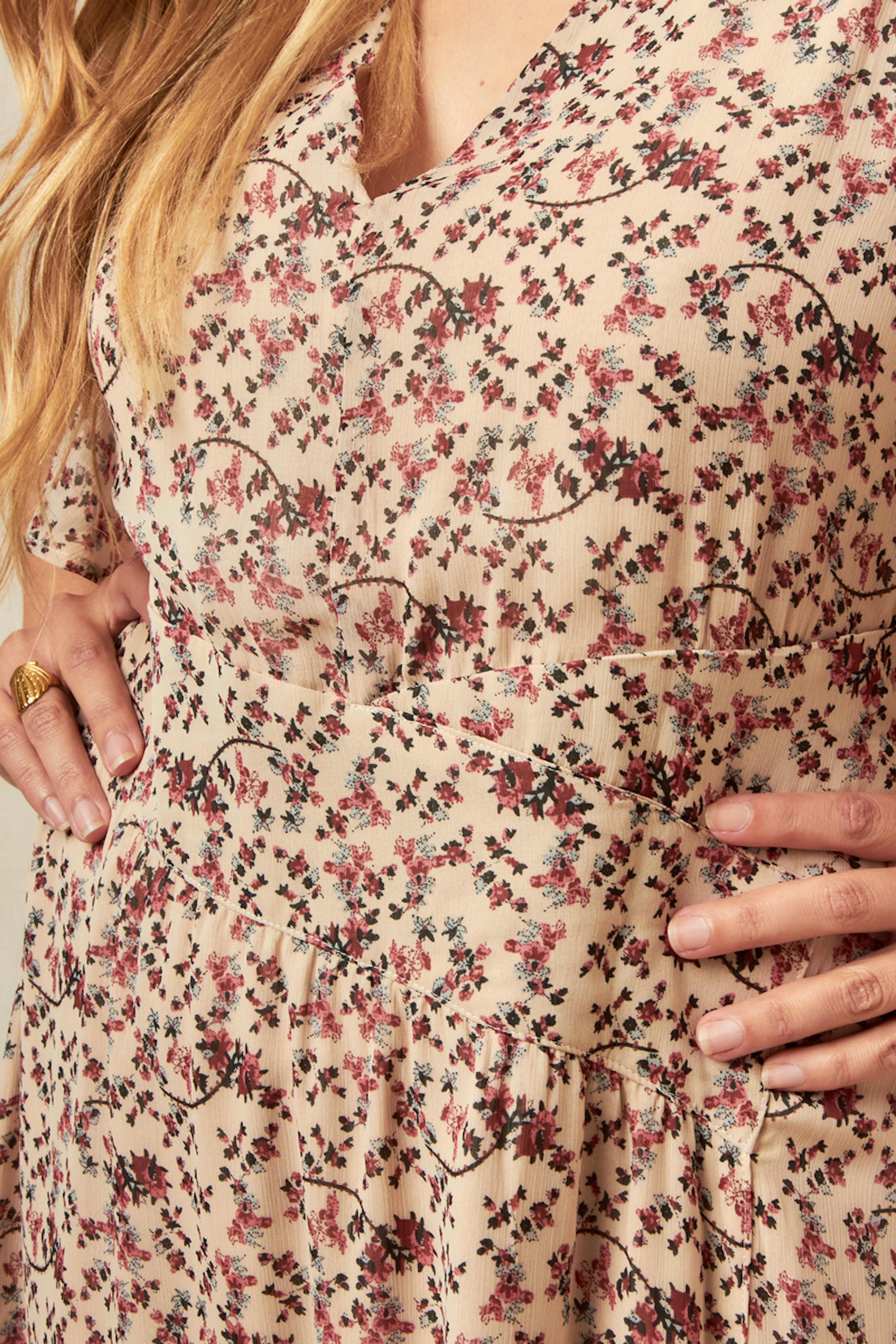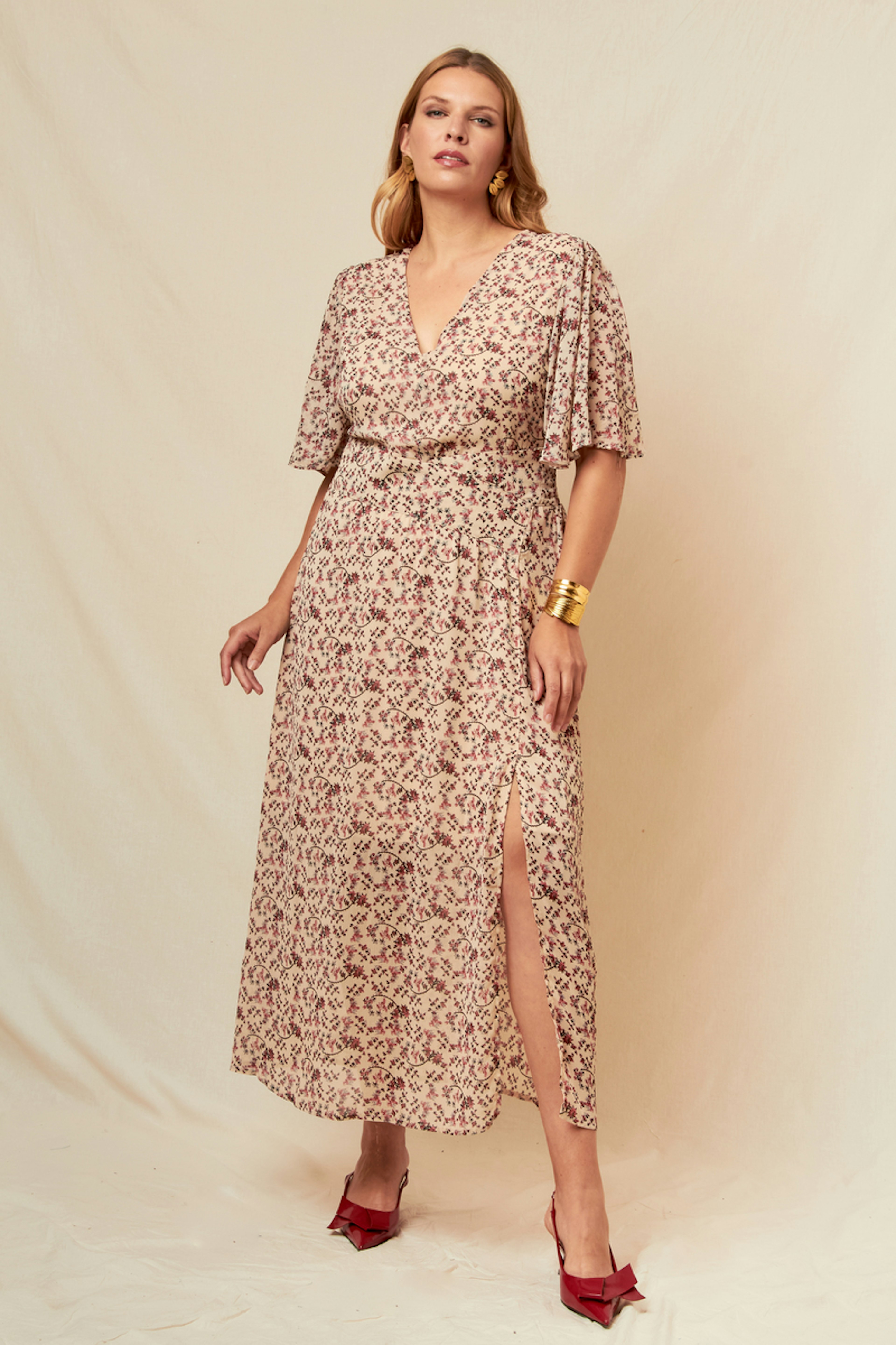 Associez cette robe imprimée à des sandales dorées et un sac en osier pour un look estival chic. • Robe longue • Manches larges • Décolleté en V • Taille cintrée • Fente latérale