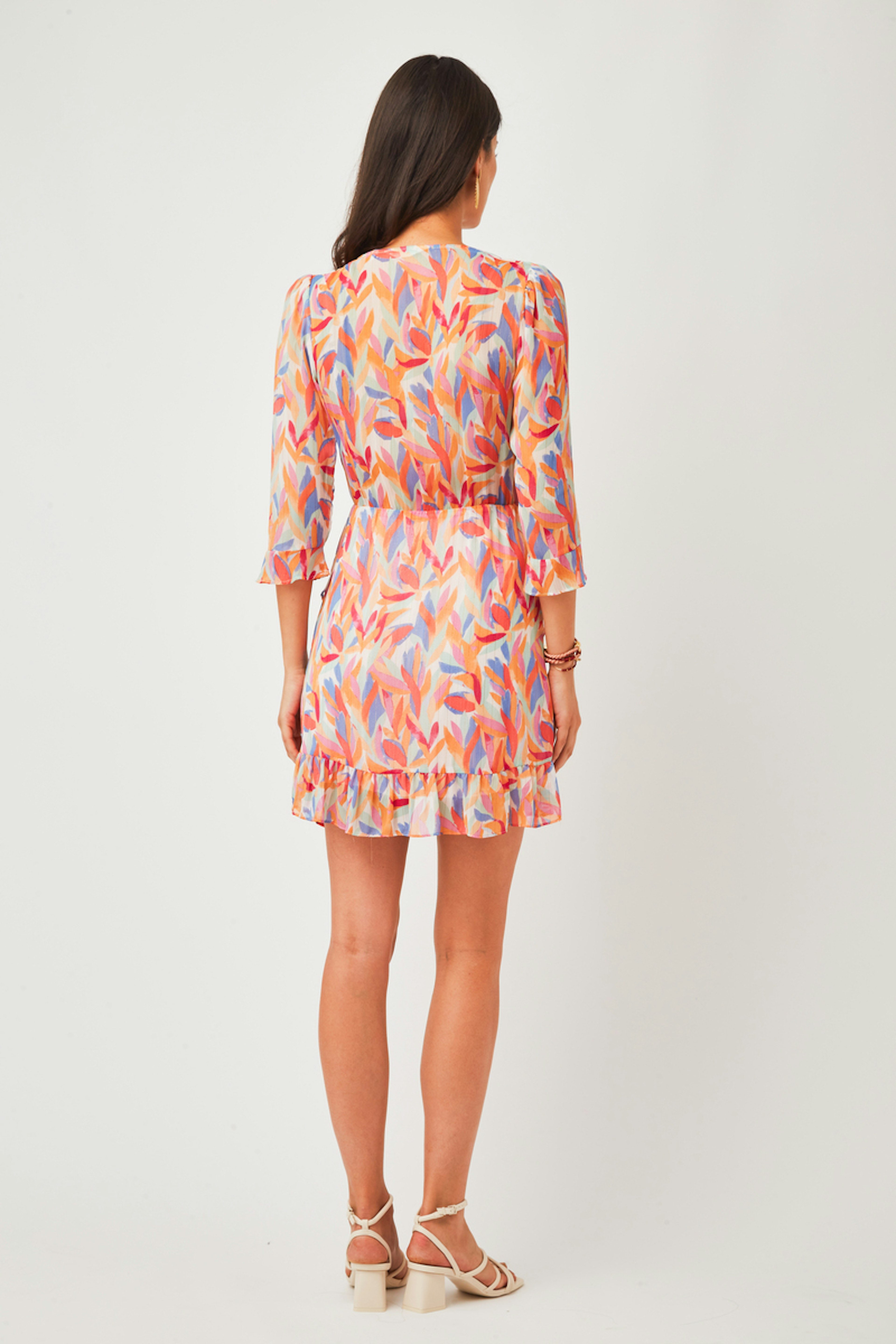 โ€ข Robe ร  manches 3/4 imprimรฉe fleurie โ€ข Longueur genou โ€ข Volants poignets et รฉpaules โ€ข Dรฉcolletรฉ portefeuille V โ€ข Taille รฉlastiquรฉe