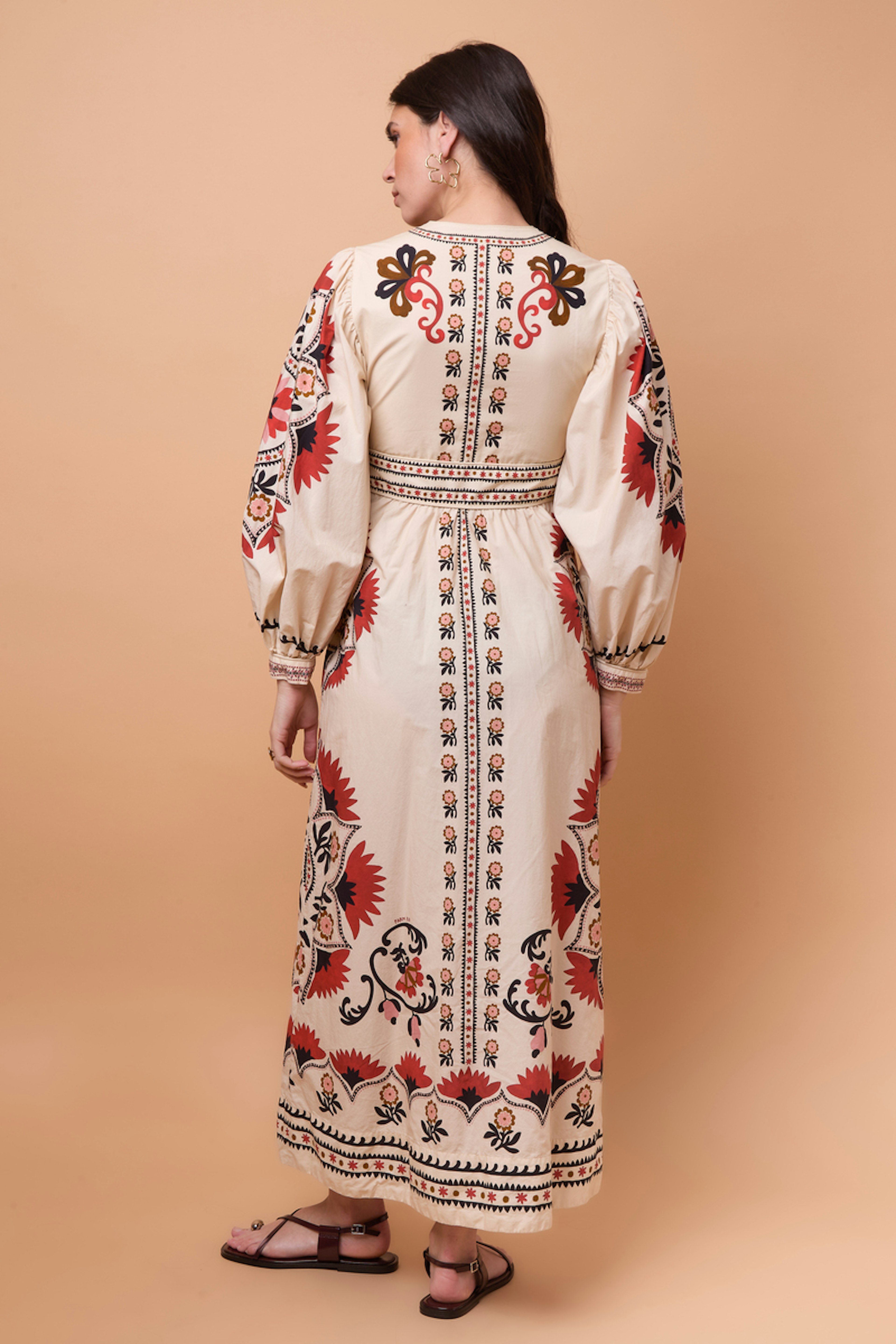 Associez cette robe longue à des bottes en daim noir et des boucles d'oreilles pendantes pour une allure bohème chic, idéale pour les soirées estivales. • Robe longue en coton • Robe longue crème mandala noix de cajou • Décolleté en V • Manches bouffantes • Imprimé mandala • Taille cintrée