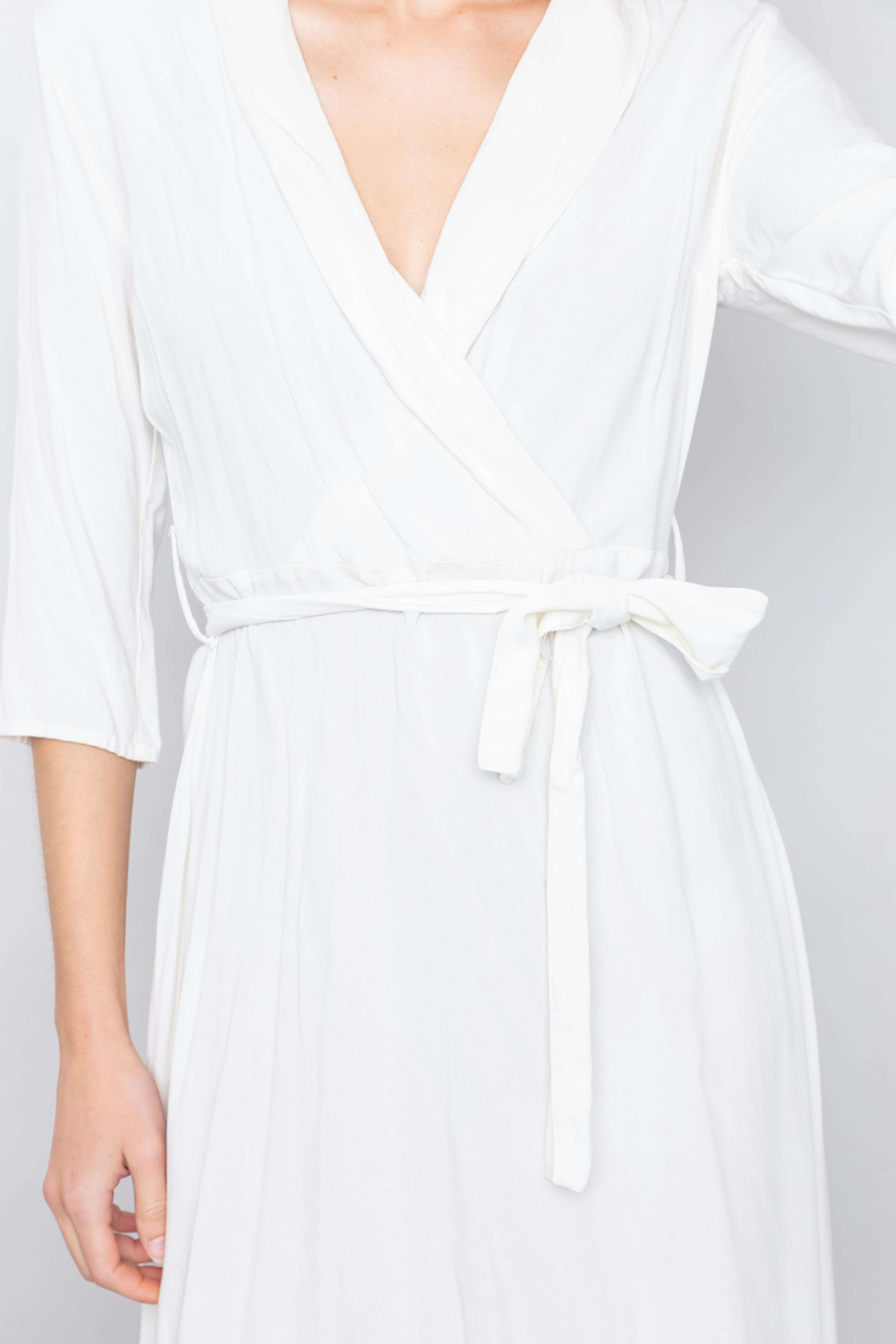 โข Robe longue couleur blanc รฉcru โข Ceinturรฉe ร la taille par une ceinture en tissu โข Encolure en V