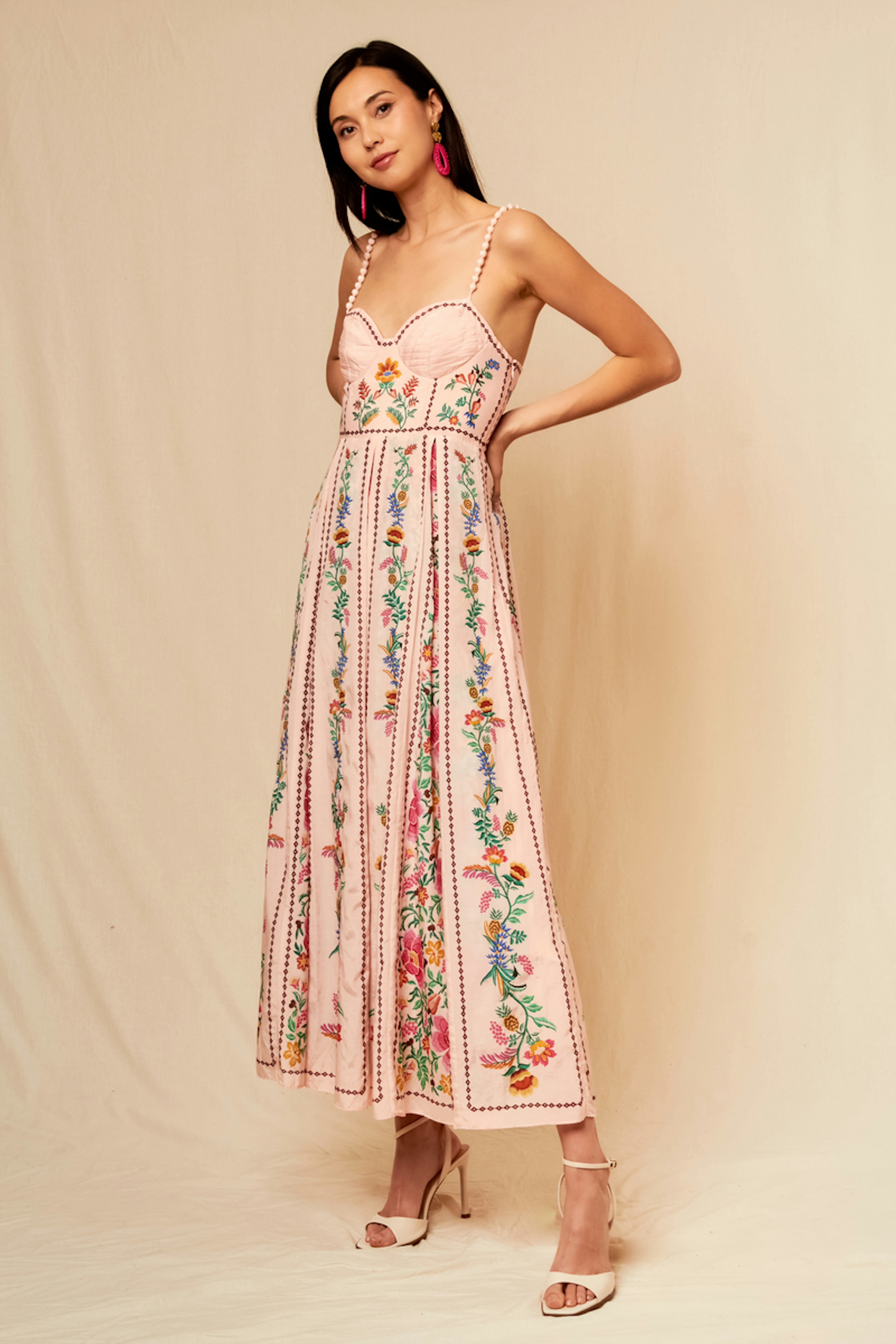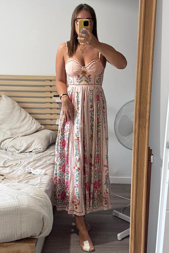 Portez cette robe FARM RIO florale avec des sandales nude et des boucles d’oreilles vives pour un style estival frais. • Robe longue en coton/viscose • Bretelles fines • Décolleté en cœur • Jupe ample • Motif floral