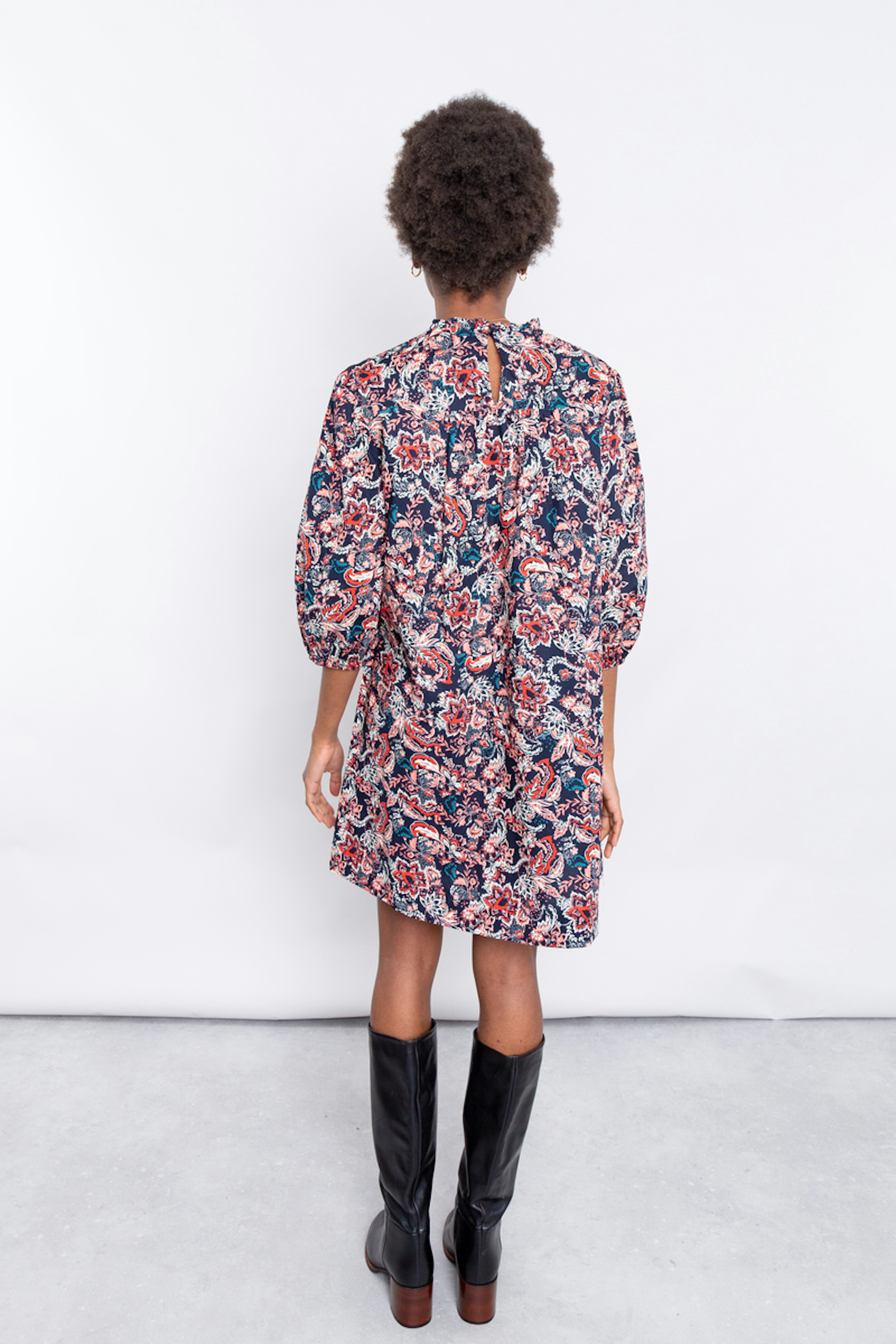 โข Robe coupe babydoll en popeline de coton โข Manches 3/4 bouffantes โข Imprimรฉ paisley marine