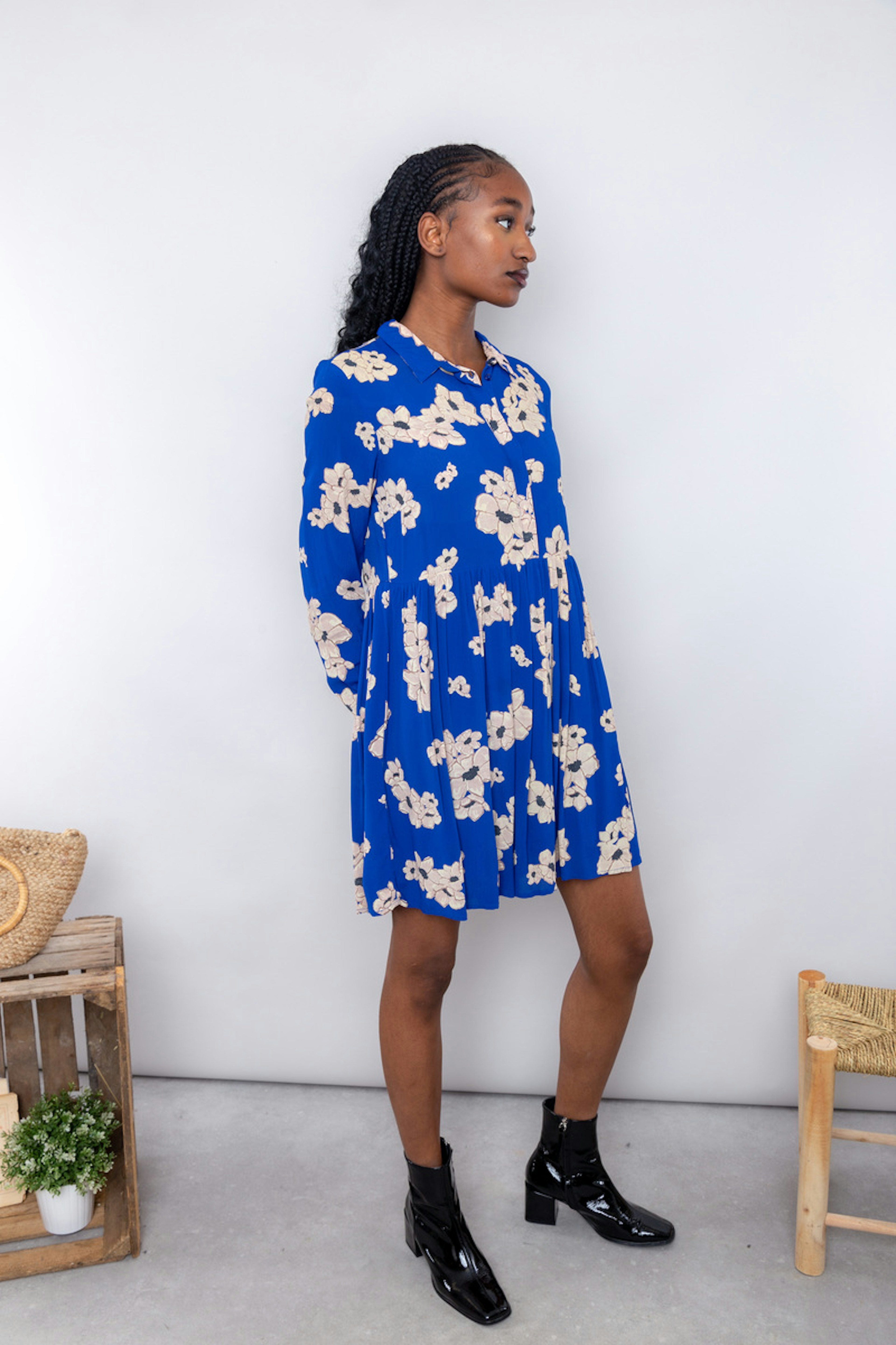 โข Robe courte bleu avec imprimรฉs fleuris โข Haut chemisier avec patte de boutonnage jusqu'ร la taille โข Col chemise โข Manches longues โข Jupe avec jeu de plis
