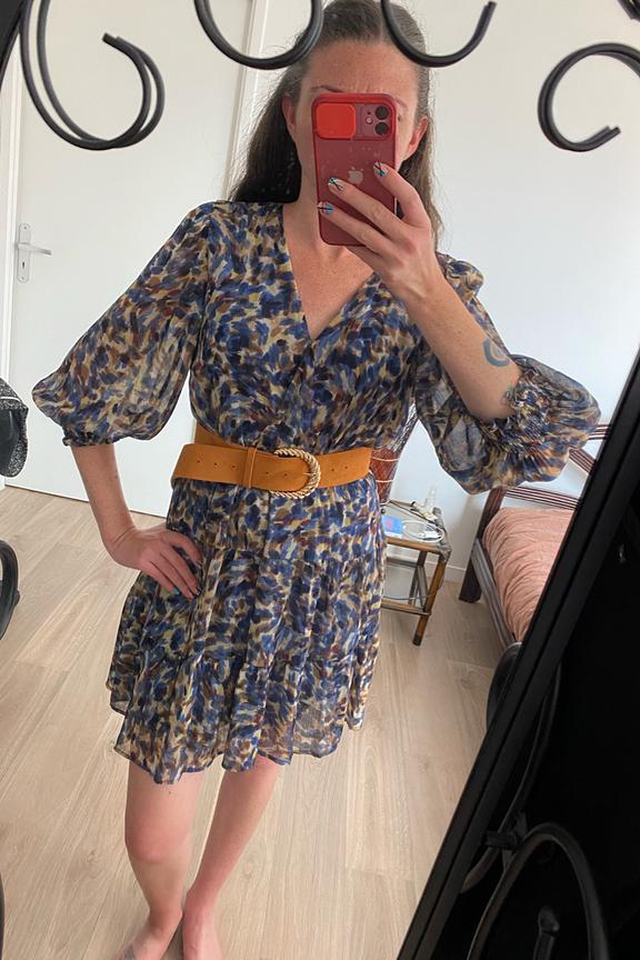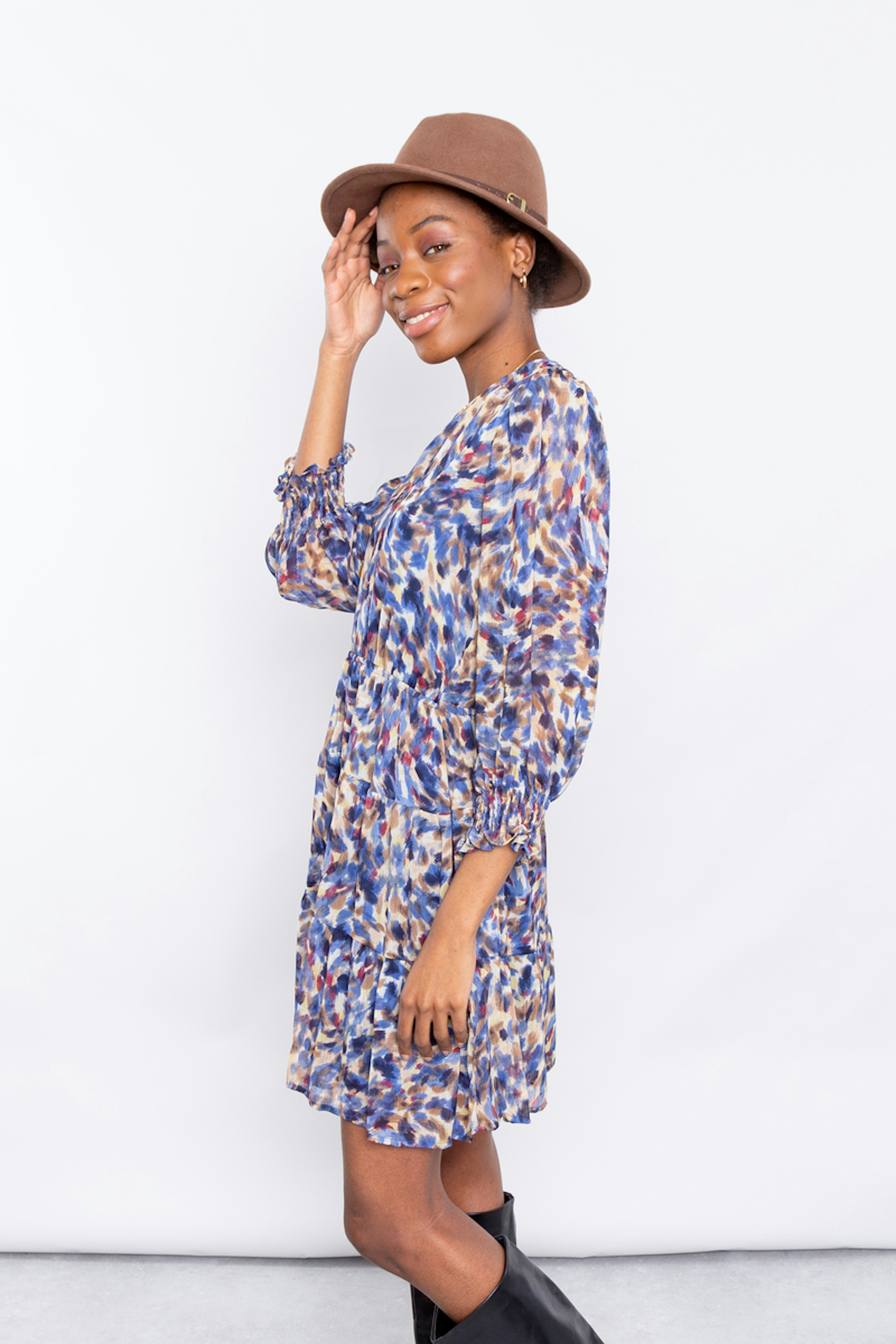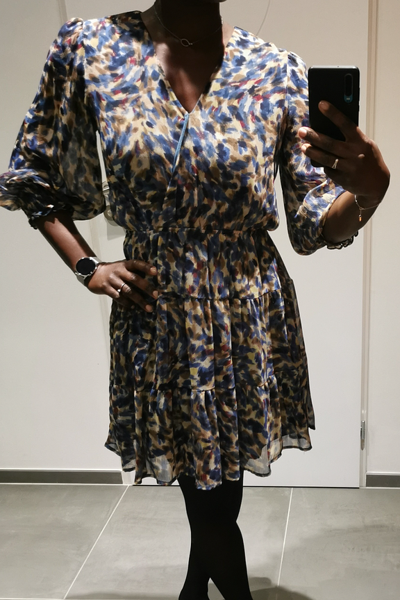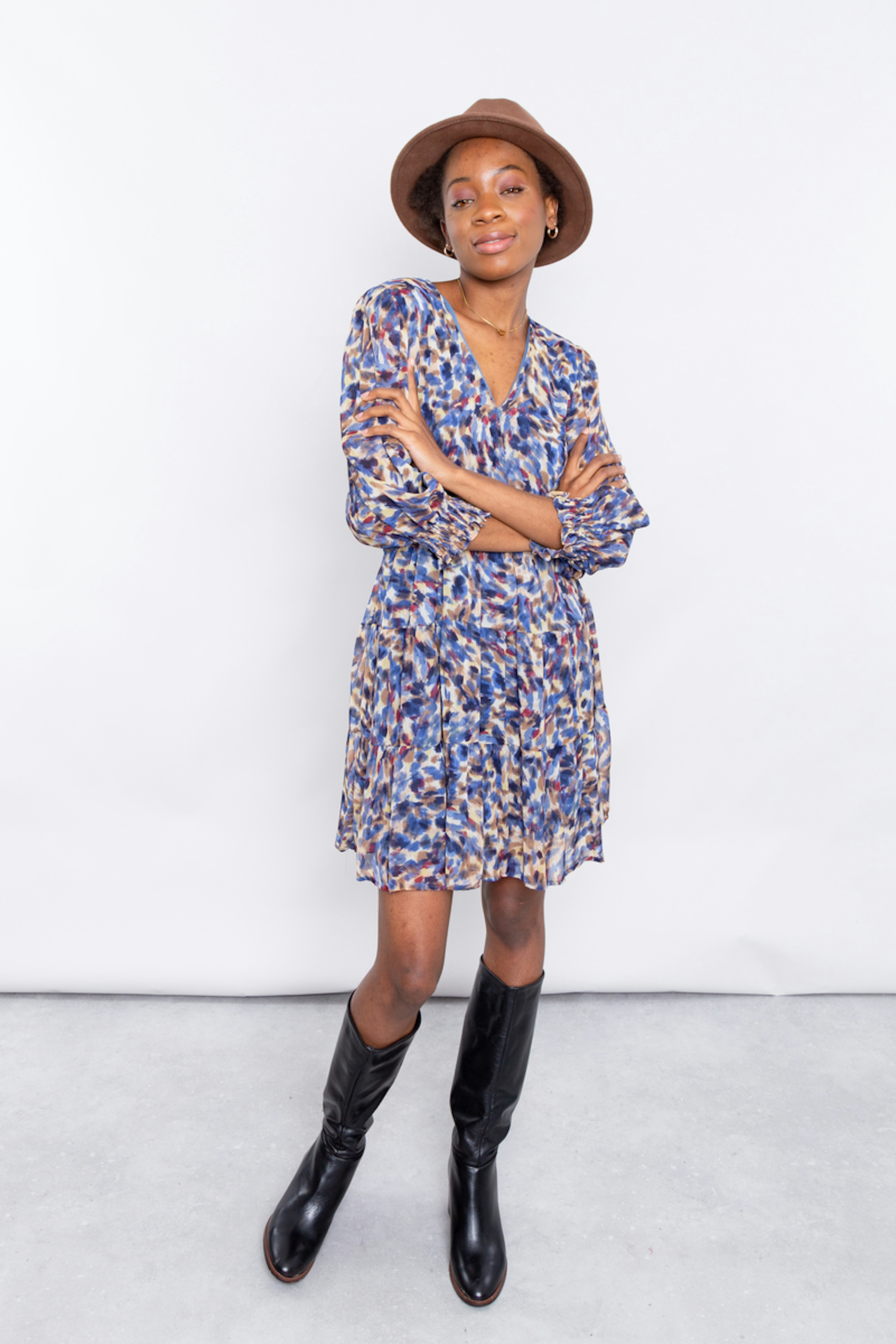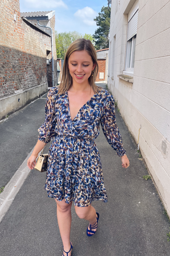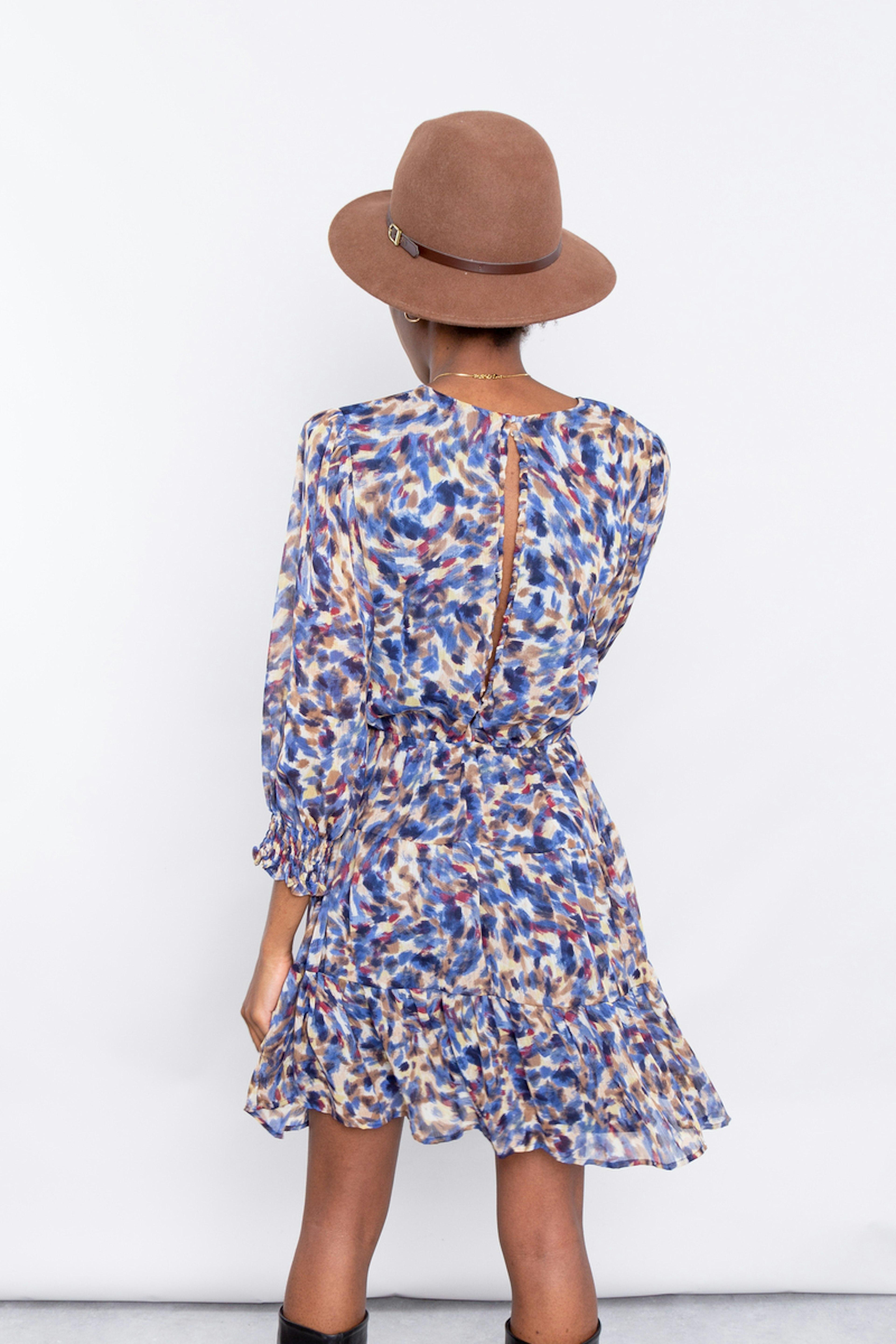 โข Robe courte bleue ร imprimรฉ pop et colorรฉ โข Taille cintrรฉe รฉlastiquรฉe โข Encolure en v โข Manches 3/4 smockรฉes โข Ouverture dans le dos โข Doublure