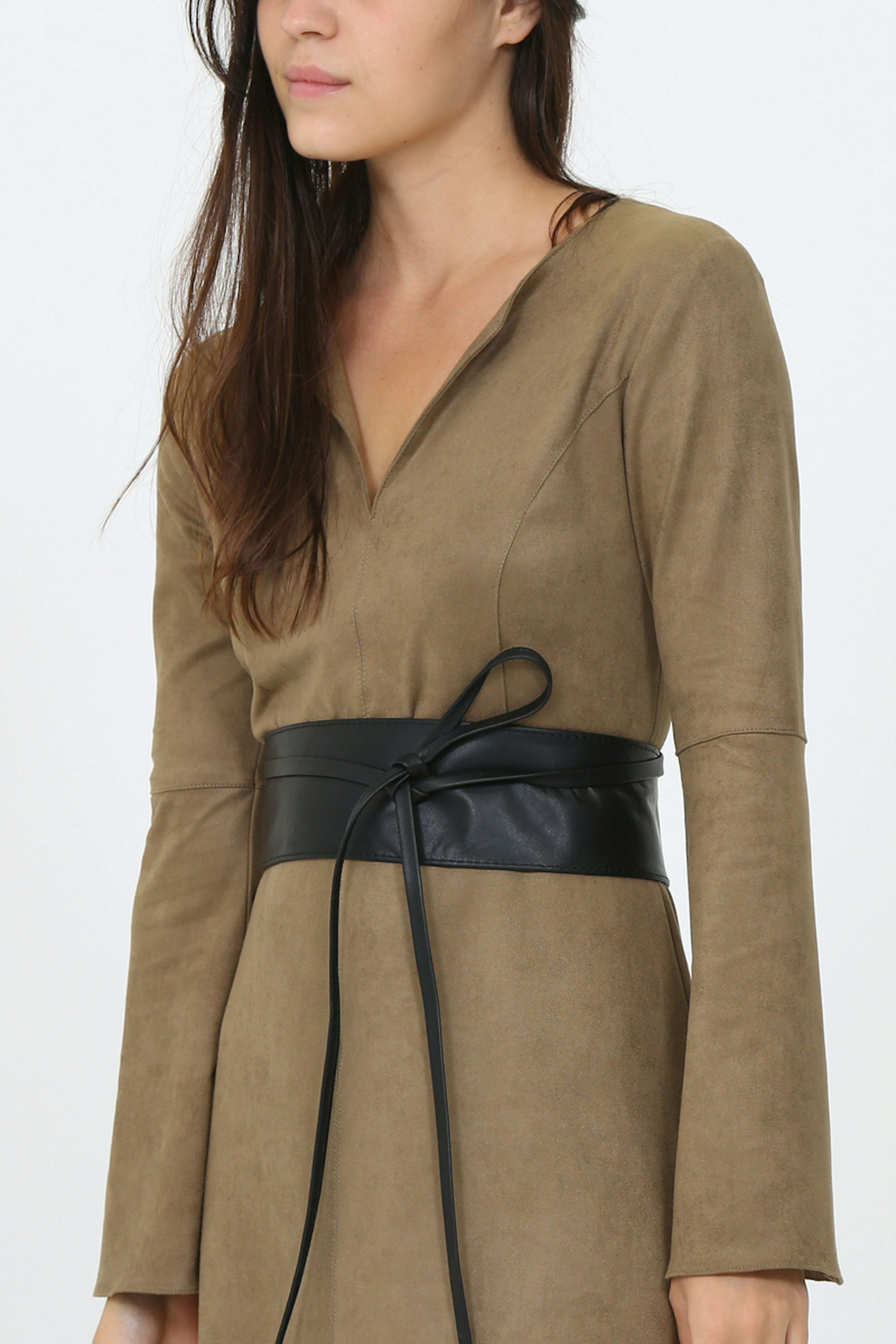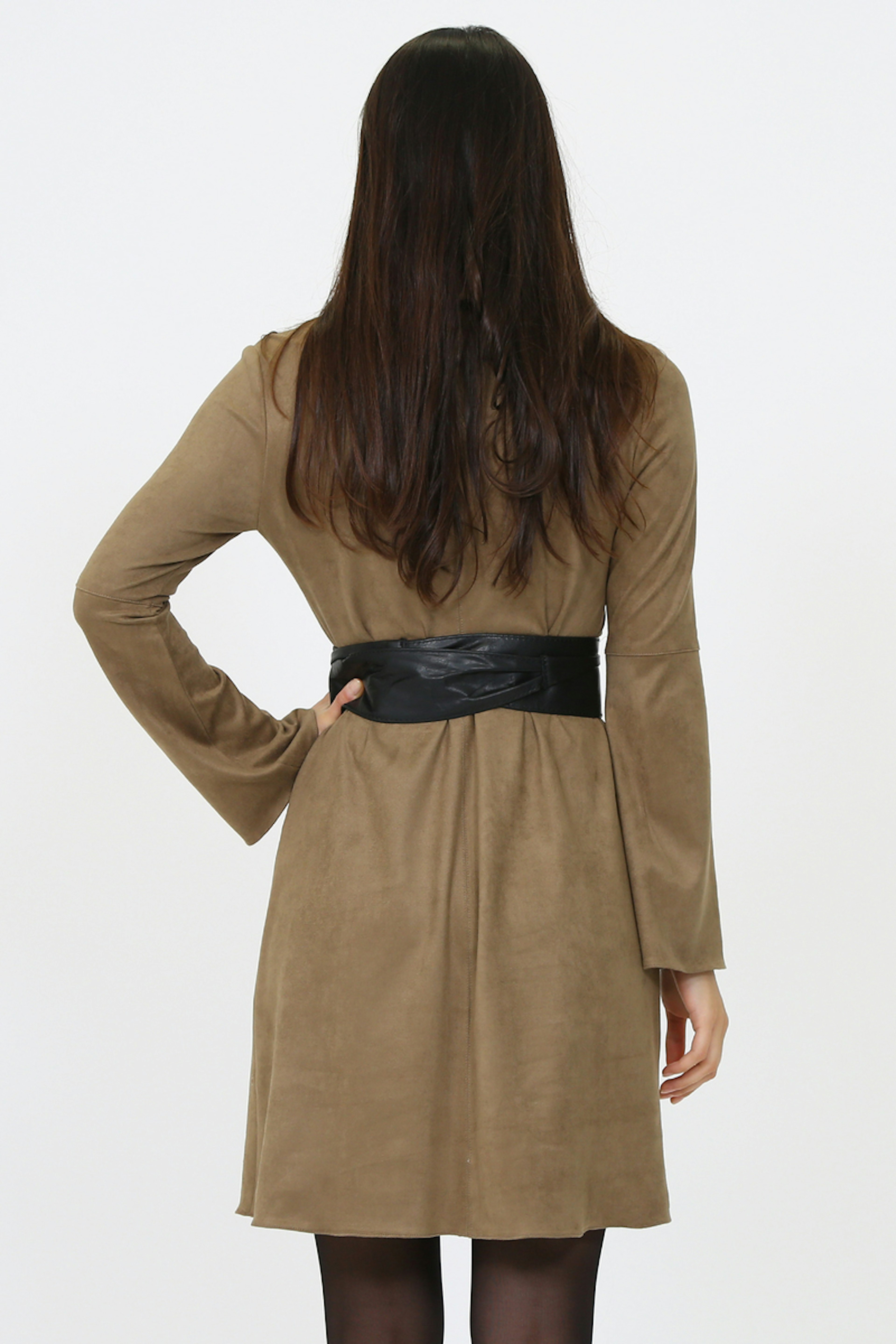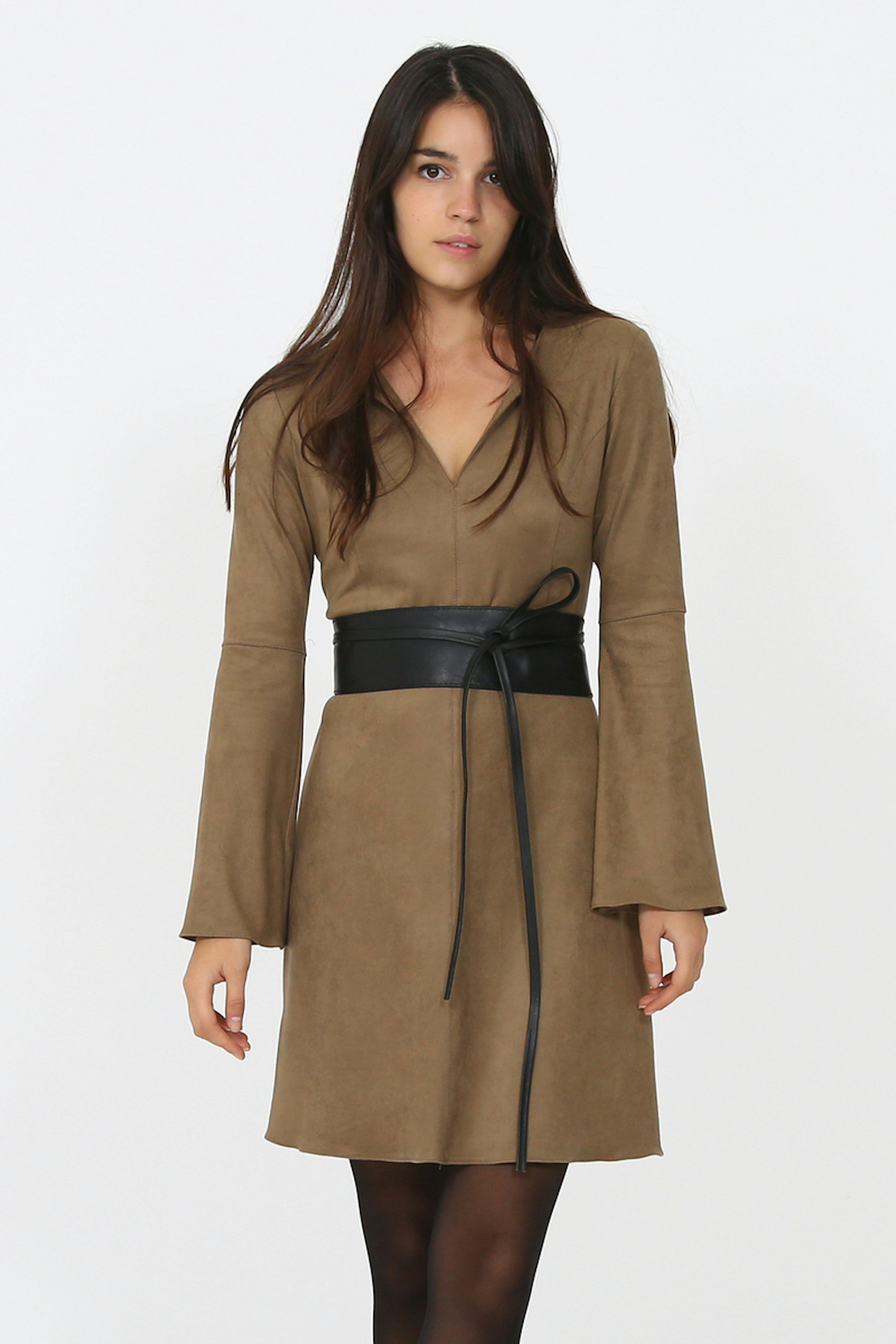 Robe en daim beige, manches longues lรฉgรจrement รฉvasรฉes et col en V. Sans ceinture.