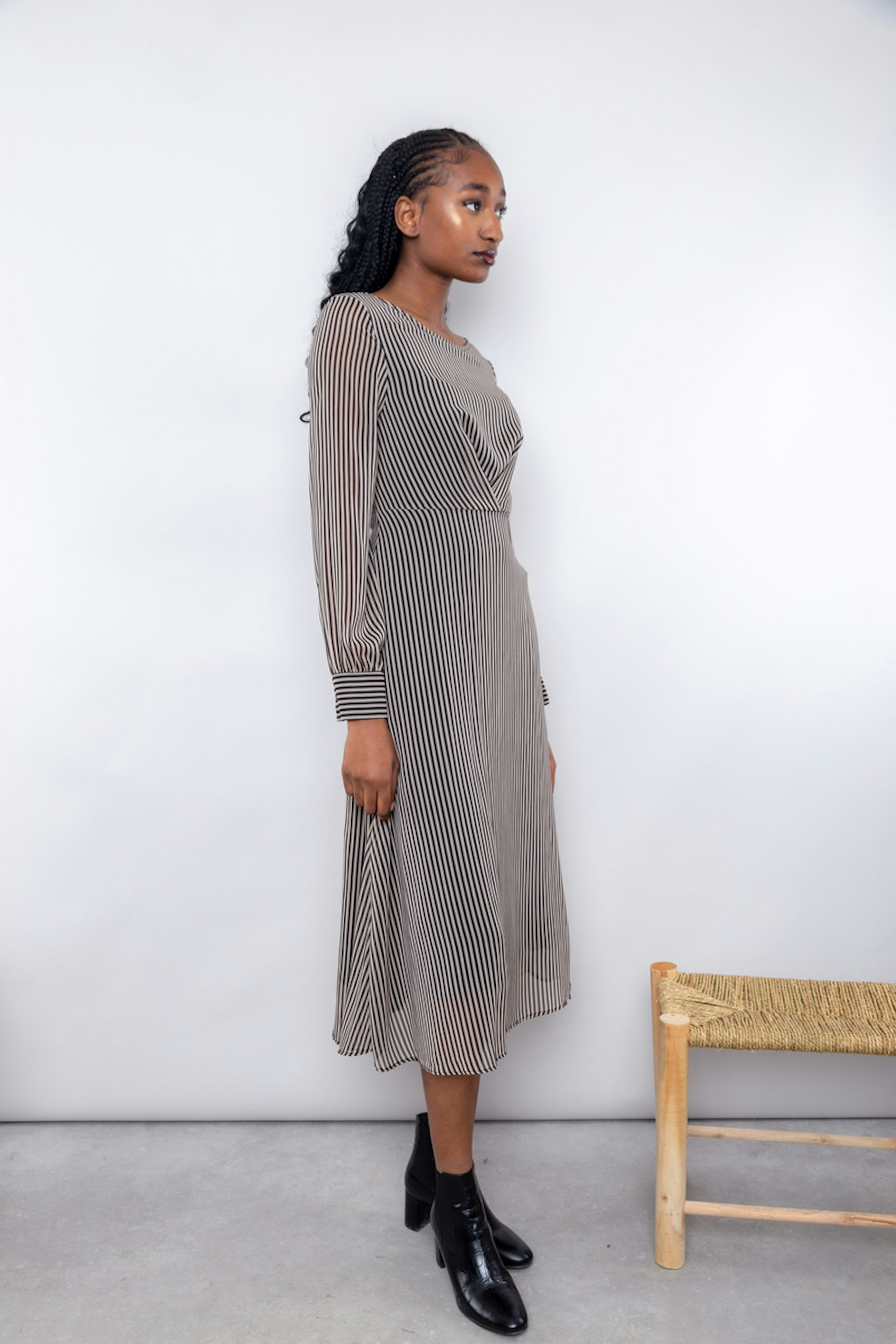 โข Robe midi ร rayures blanches et noires โข Doublรฉe โข Manches longues avec ourlets โข Col rond โข Tissu fluide โข Couture croisรฉe au-dessus de la taille โข Zippรฉe dans le dos