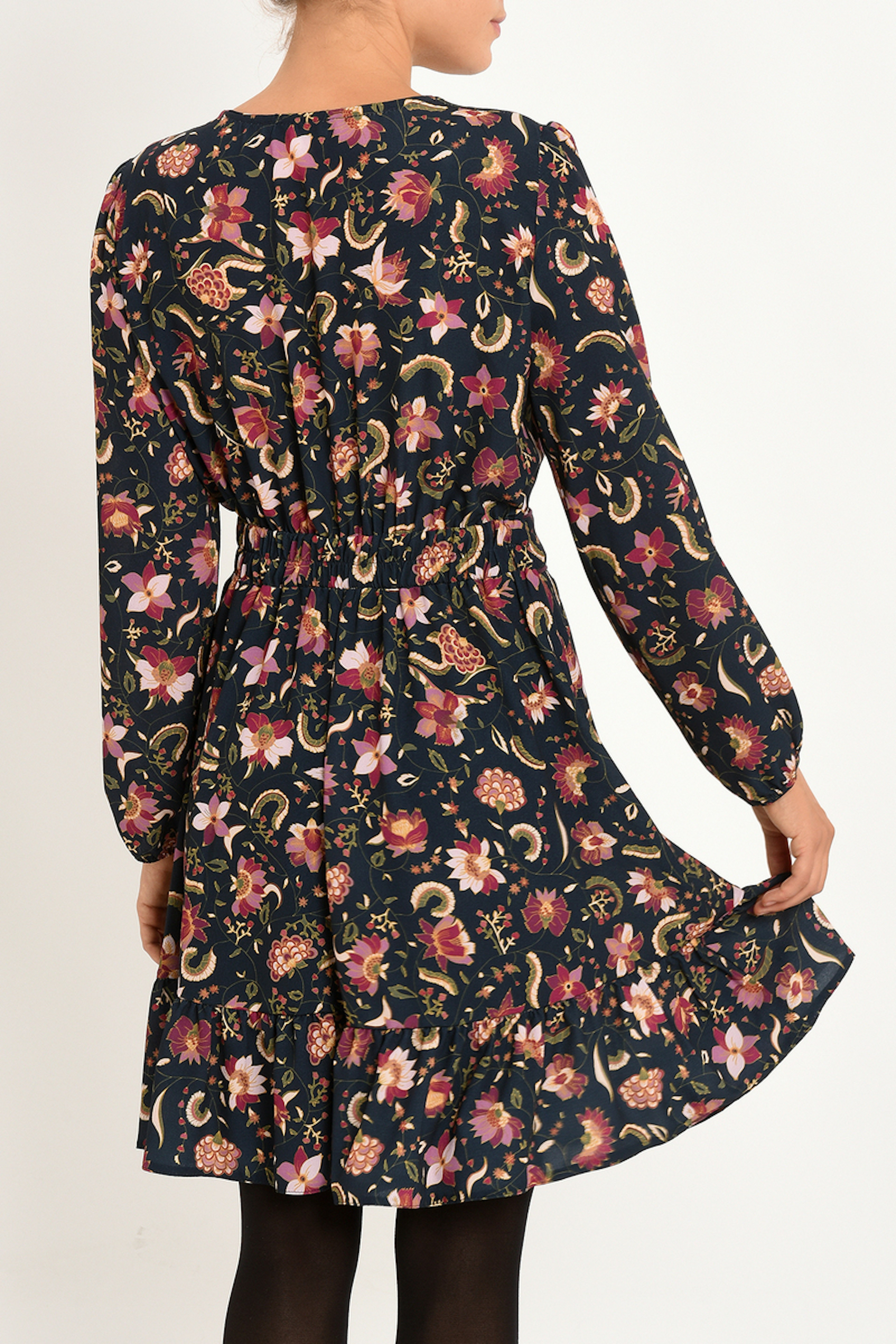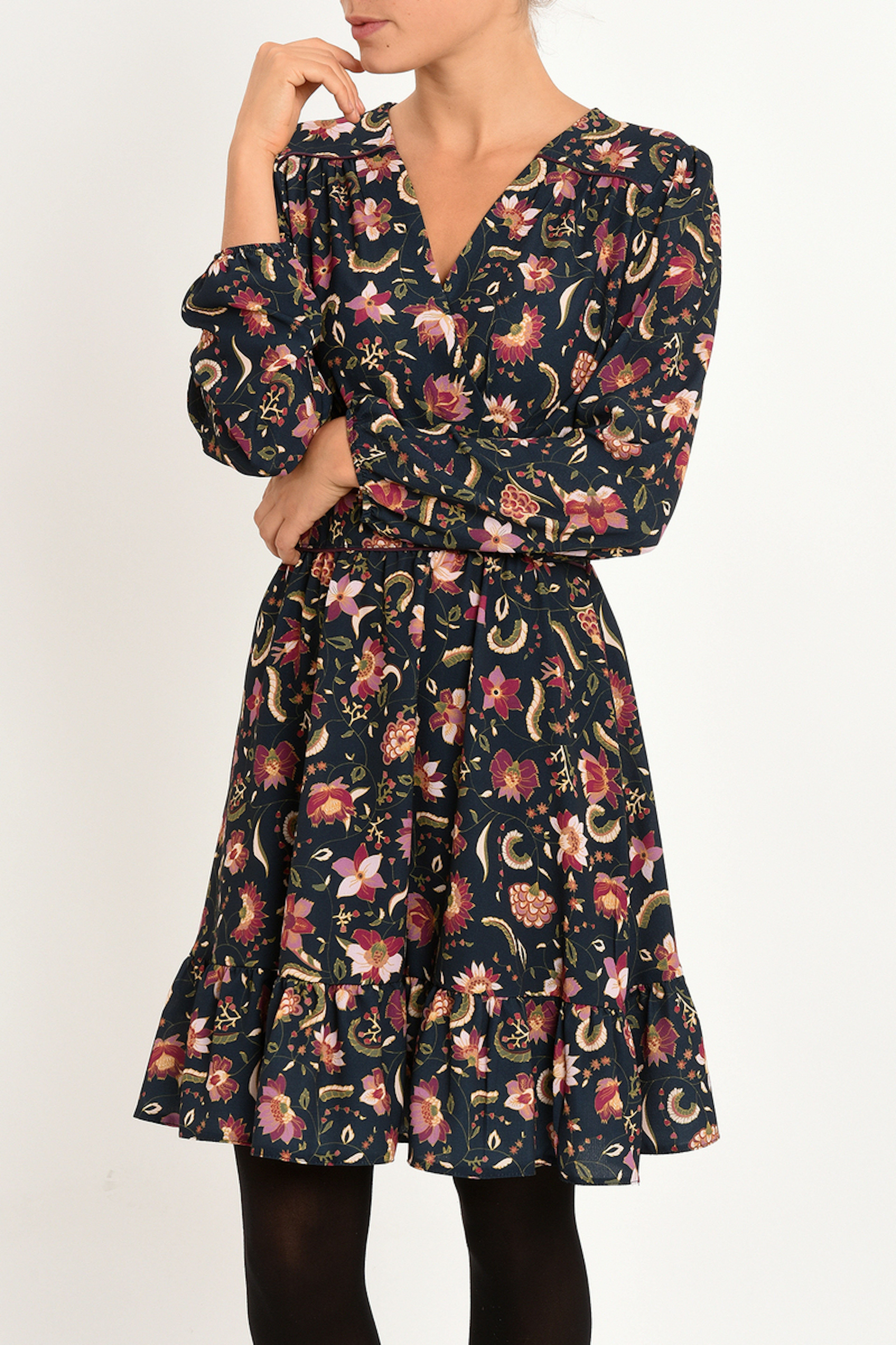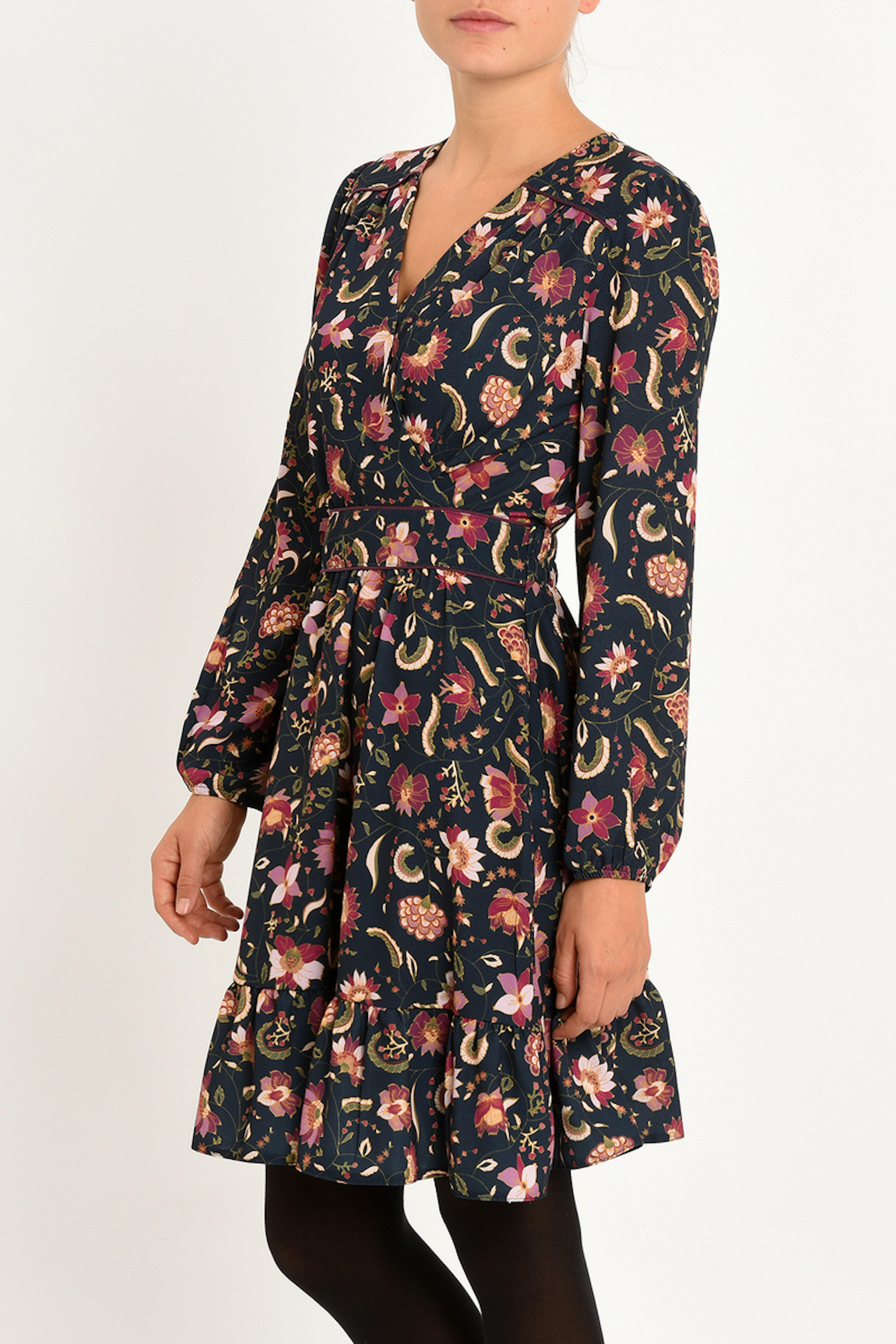 Robe bleu marine au dessus du genou avec imprimรฉ floral. Encolure en V croisรฉ. Ajustรฉe ร la taille grรขce ร un รฉlastique dans le dos. Robe doublรฉe.