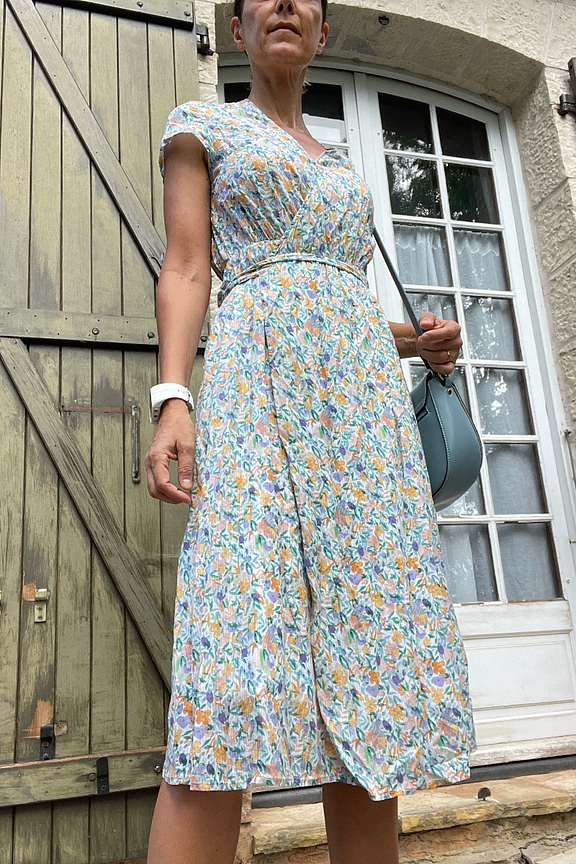 Pour un look estival frais et รฉlรฉgant, associez cette robe portefeuille ร des sandales ร talons en bois et des accessoires dorรฉs discrets. Idรฉale pour une sortie en ville ou un brunch entre amis. โข Robe portefeuille โข Manches courtes โข Imprimรฉ fleuri โข Tons pastel