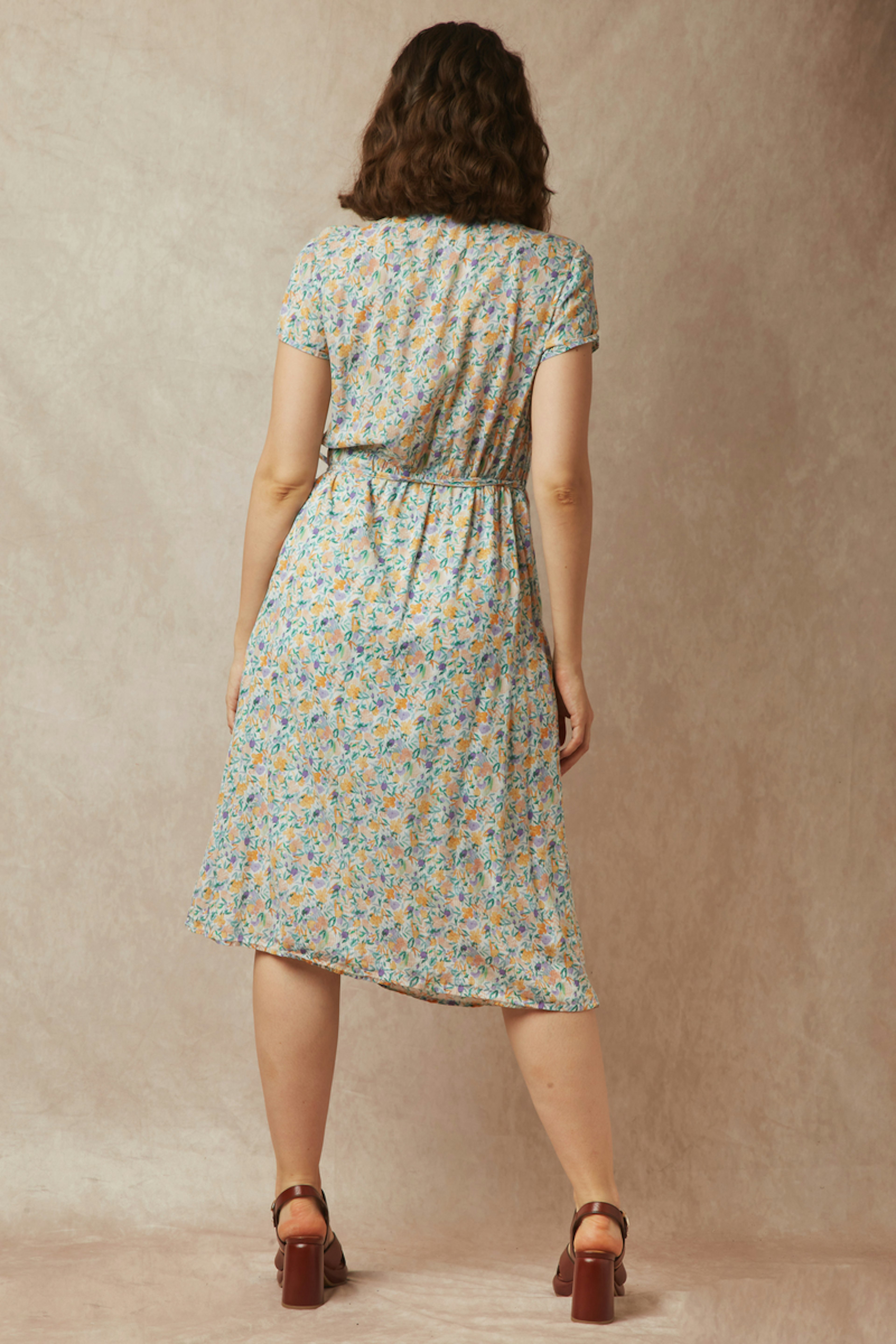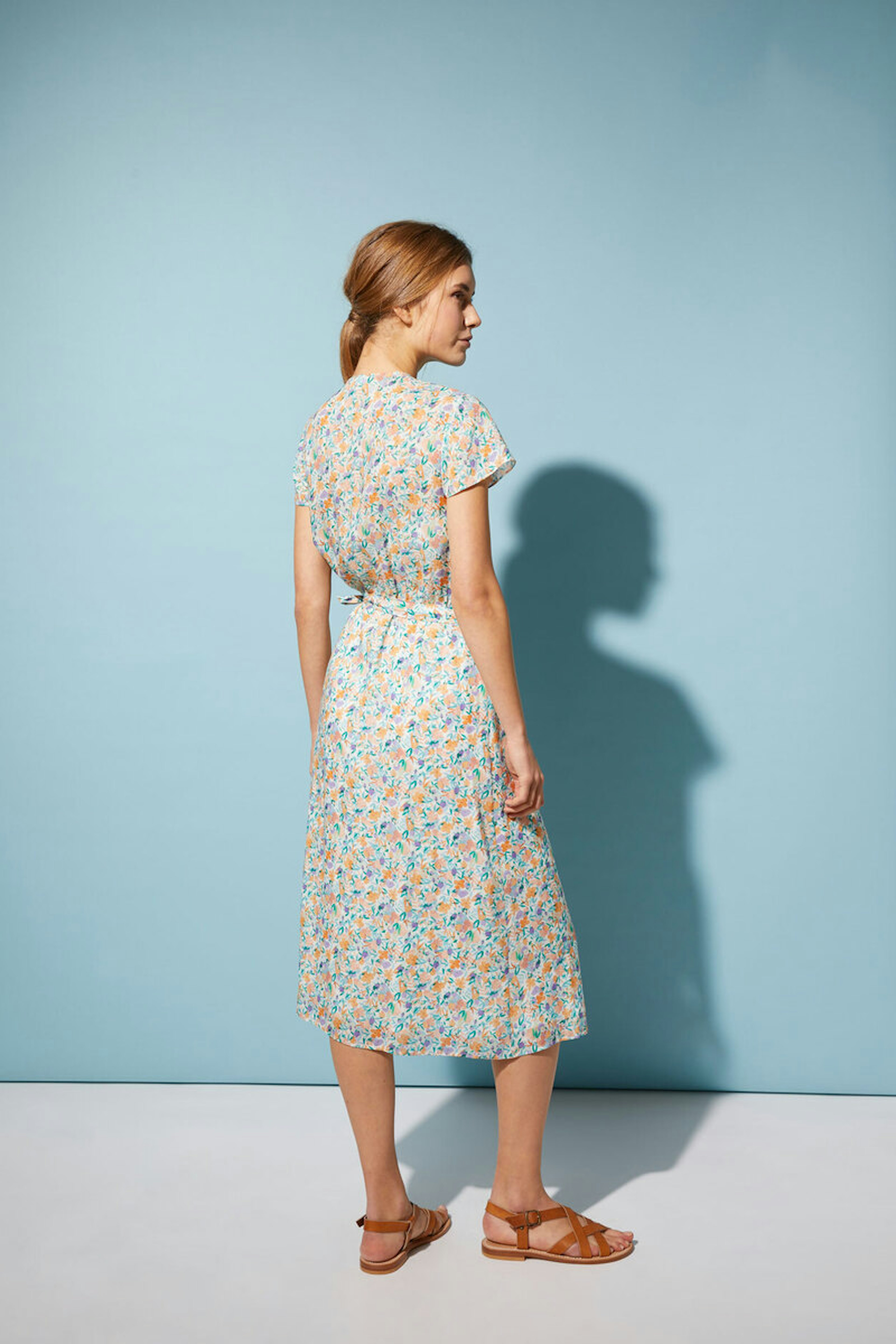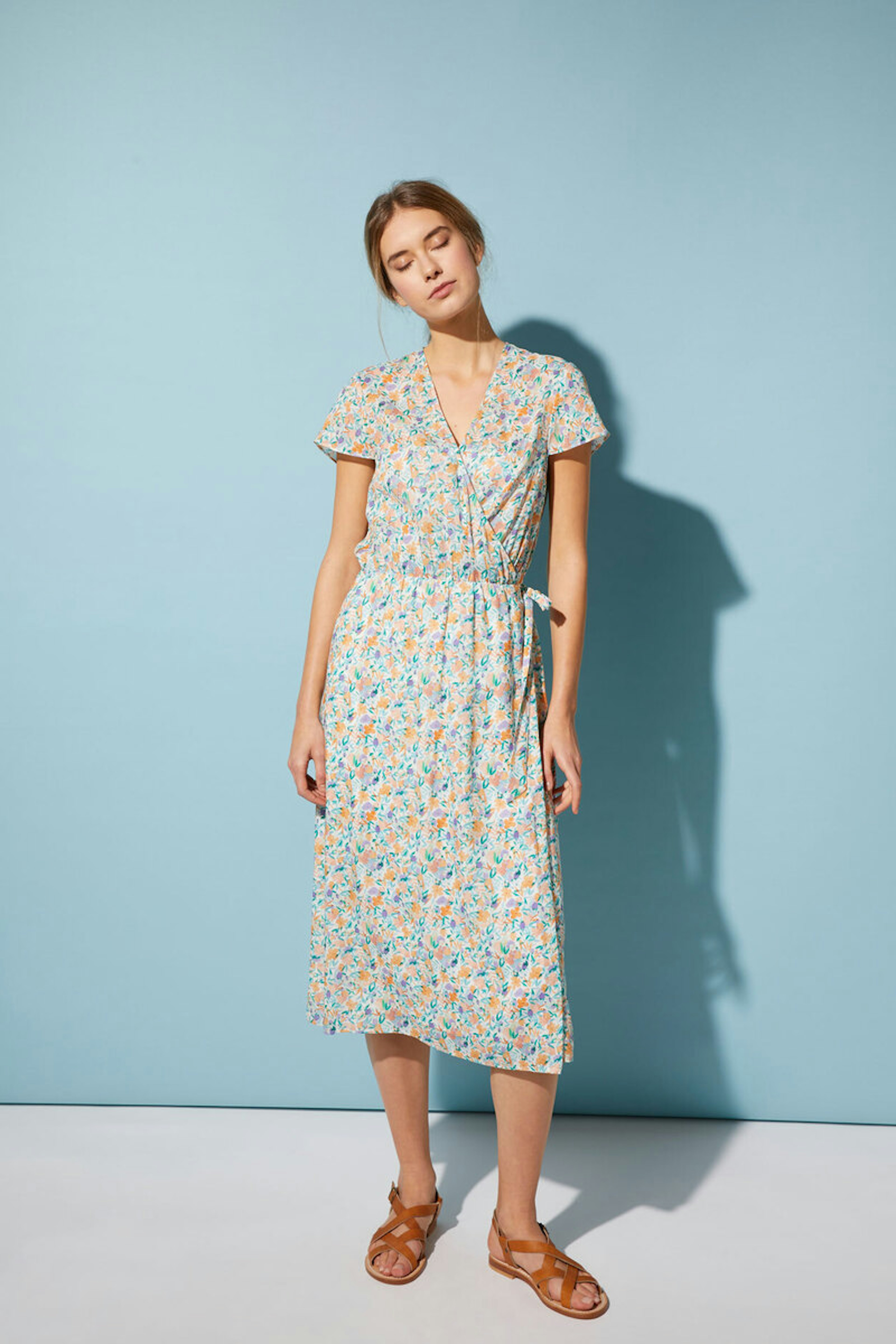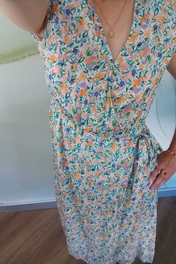 Pour un look estival frais et รฉlรฉgant, associez cette robe portefeuille ร des sandales ร talons en bois et des accessoires dorรฉs discrets. Idรฉale pour une sortie en ville ou un brunch entre amis. โข Robe portefeuille โข Manches courtes โข Imprimรฉ fleuri โข Tons pastel