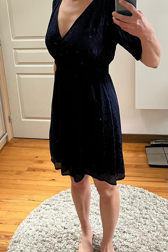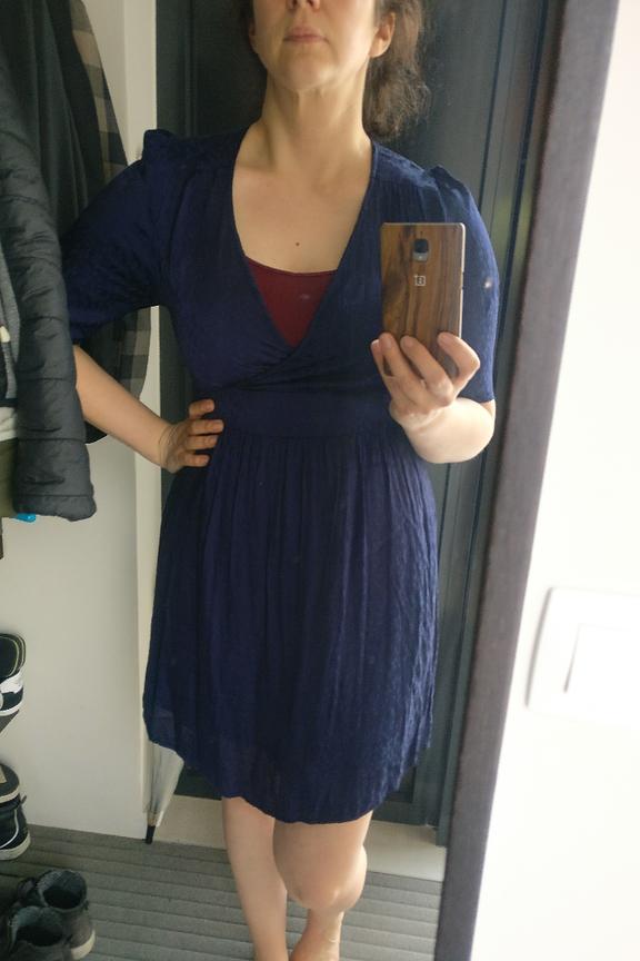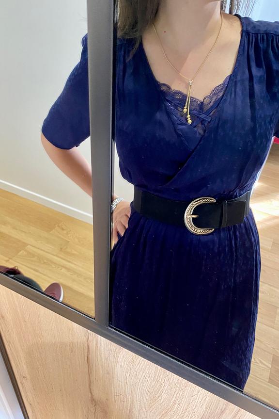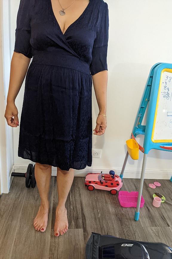 โข Robe courte ร manches 3/4 marine โข Tissu texturรฉ bleu โข Dรฉcolletรฉ V โข Coupe portefeuille โข Epaules froncรฉes