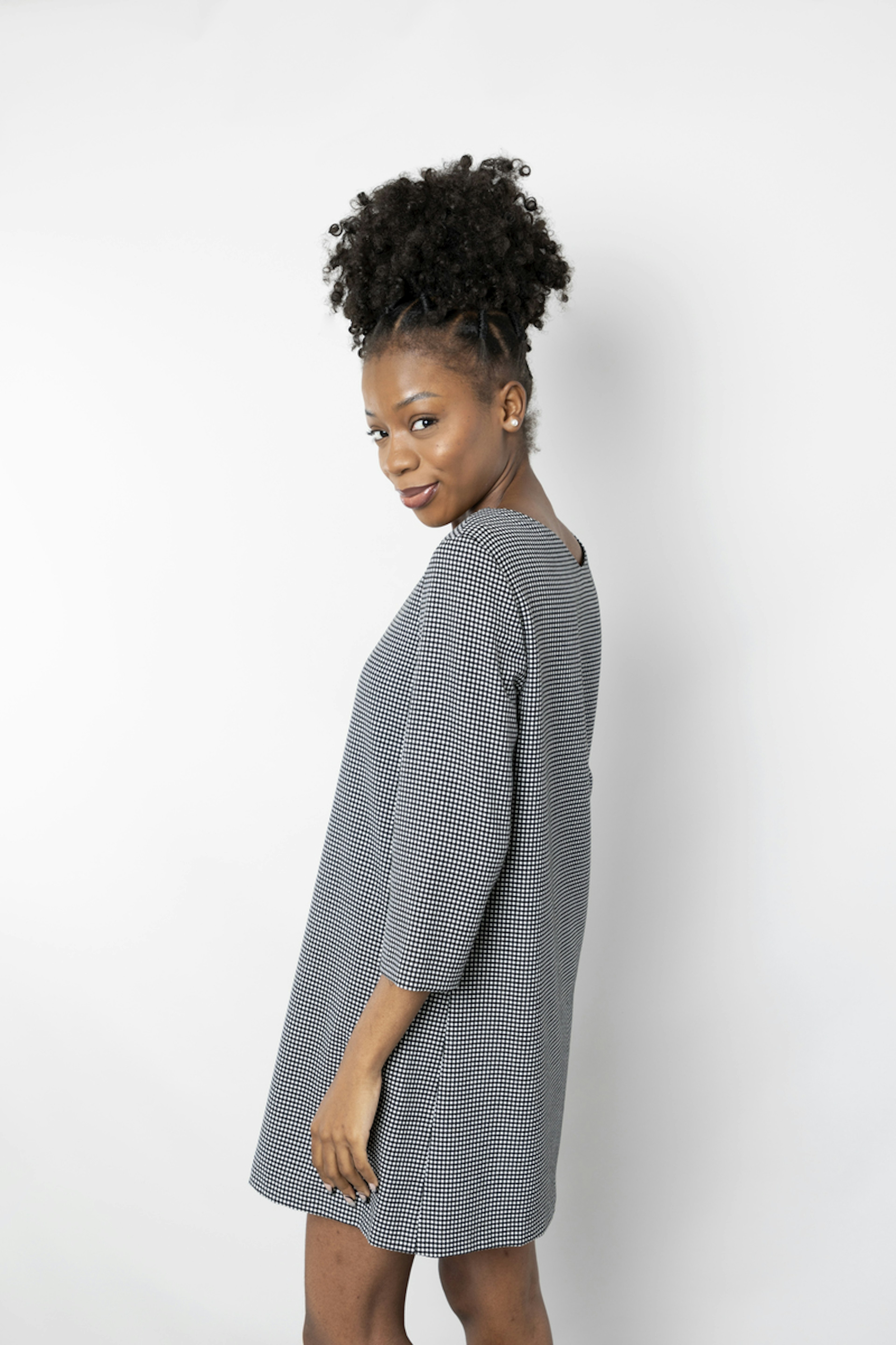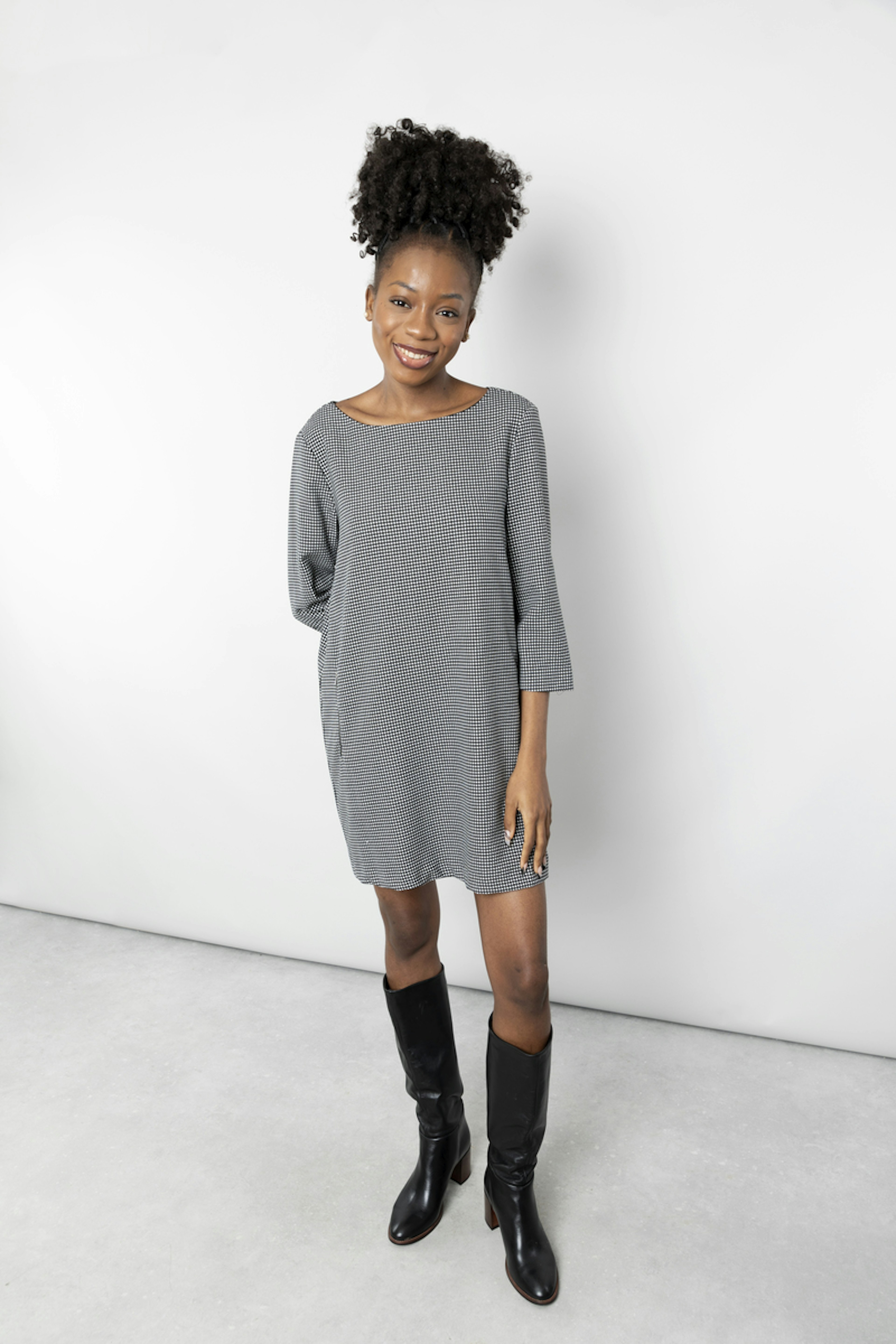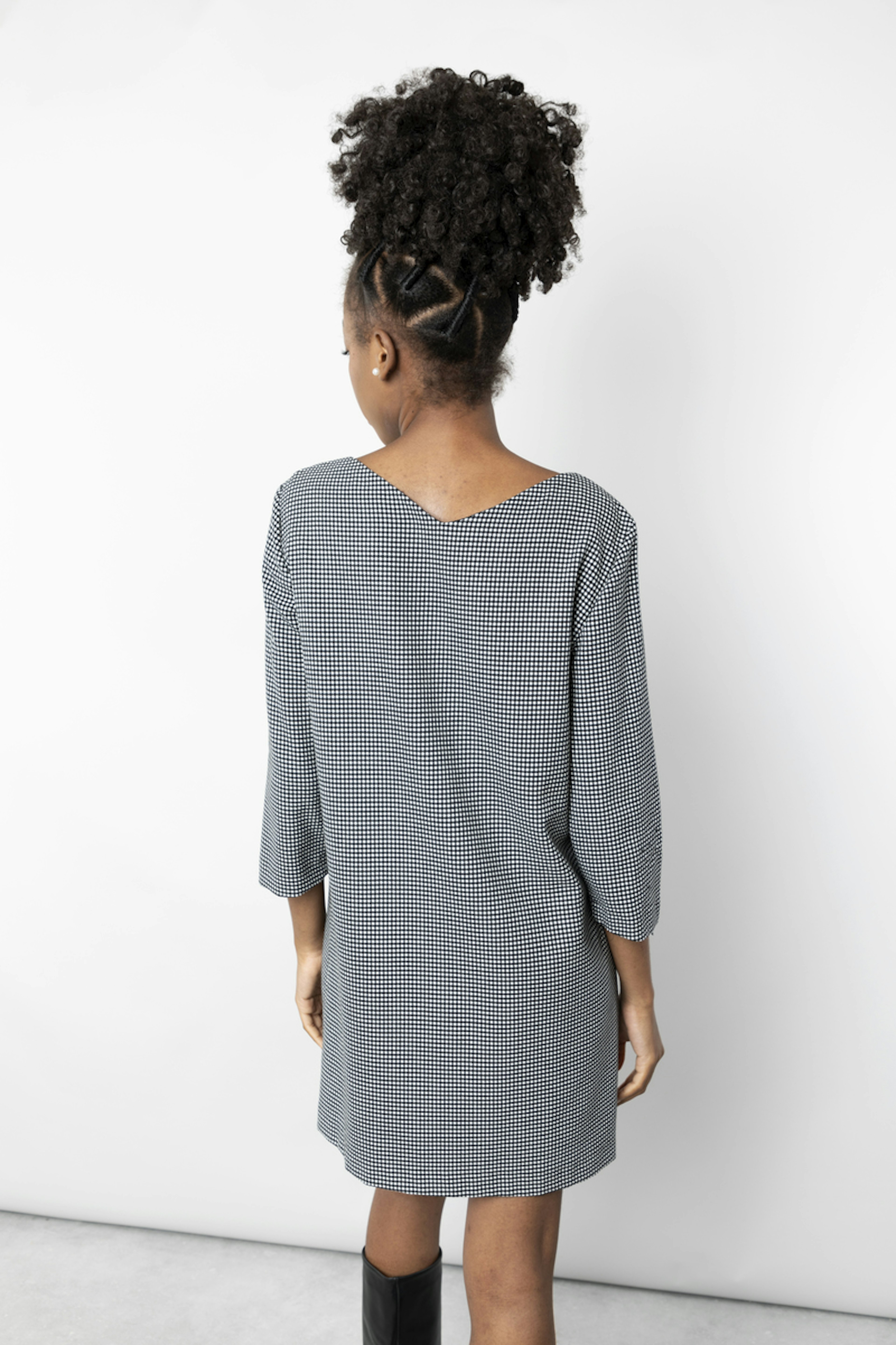 โข Robe courte ร imprimรฉs noirs et blancs โข Manches 3/4 droites โข Col rond โข Coupe droite lรฉgรจrement รฉvasรฉe